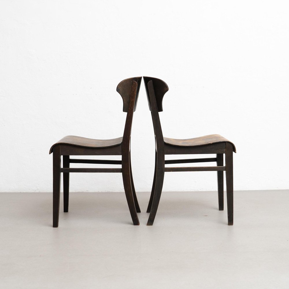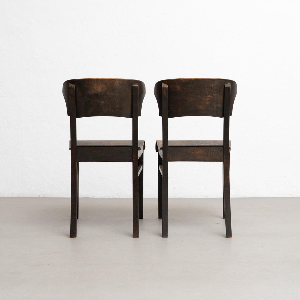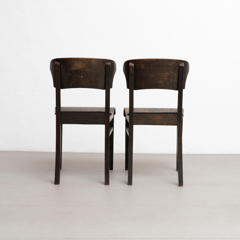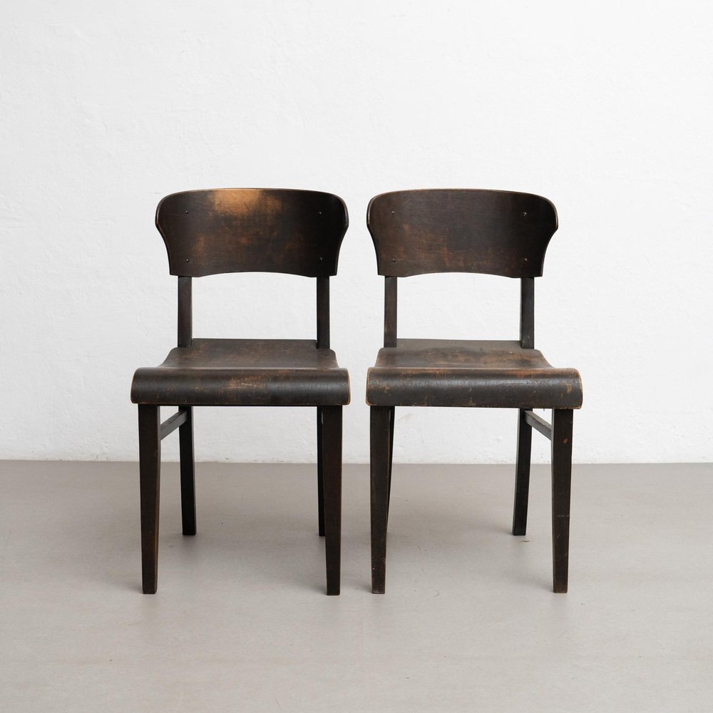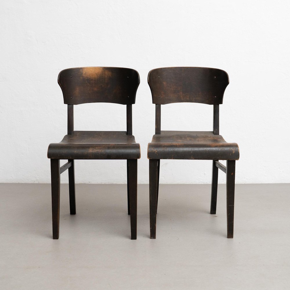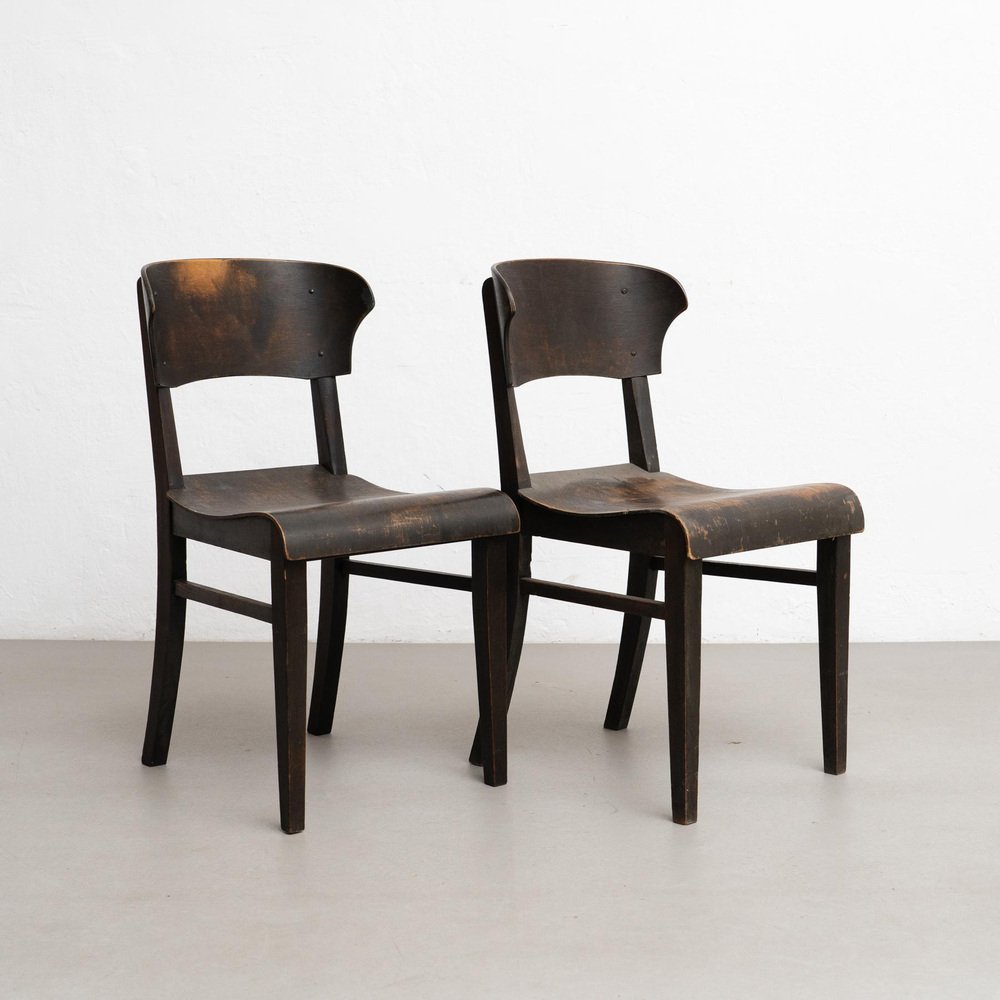Set of Two Bauhaus-Style Chairs - Germany, 1940s This set of two Bauhaus-style chairs is an excellent example of the simplicity and functionality that defined this influential design movement. Manufactured in Germany in the 1940s, the chairs feature a laminated wood structure that stands out for its robustness and minimalist elegance. Their original condition, with natural signs of wear, makes them unique pieces full of character and history. Laminated Wood Frame: The chairs are built with high-quality laminated wood, a material that highlights the functional and simple aesthetic of the Bauhaus style. The wood has been worked to provide both strength and lightness, making the chairs both comfortable and durable. The seat and backrest are unupholstered, which highlights the natural beauty of the wood and the purity of the design. This minimalist approach allows the buyer to personalize the chairs with the material that best suits their style. Original Condition: The chairs are in their original condition, with signs of natural wear from time and use. Though the marks of wear are visible, they add to the piece's unique charm and authenticity sought by collectors. Dimensions: Diameter (seat): 44 cm Width (backrest): 49 cm Height: 81 cm Manufactured in Germany in the 1940s, these chairs are an example of the practical and elegant approach of Bauhaus design, which prioritized functionality without sacrificing aesthetics. Their clean structure and lack of unnecessary ornamentation make them timeless pieces that are still highly valued in modern and vintage-style interiors. This set of chairs is ideal for those seeking authentic pieces full of history, perfect for complementing industrial, modern, or eclectic spaces. They are versatile and bring a touch of functional elegance to any room. The chairs are in their original state, with visible signs of use that give them a unique patina. If you are looking for a pair of chairs with history and personality, this set is the perfect choice for your home.