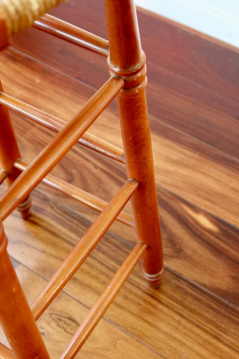 High bar stools in solid wood, featuring a woven straw seat and turned legs reminiscent of traditional craftsmanship. The wood has a warm patina, and the straw seat reveals subtle variations in color, evidence of their use and authenticity.
