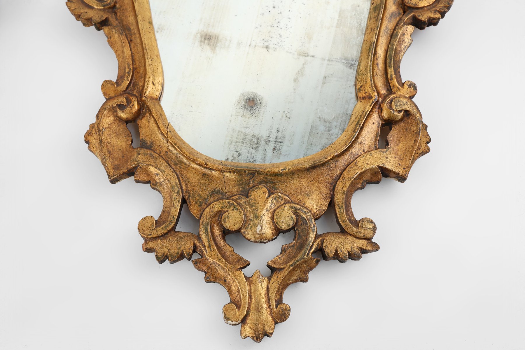 A pair of very fine Italian Rococo carved and gilded wood mirrors with original mirrors and beautiful patina. Carved in symmetrical form with flowers, scrollwork and rocailles.