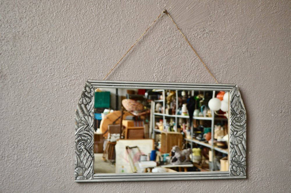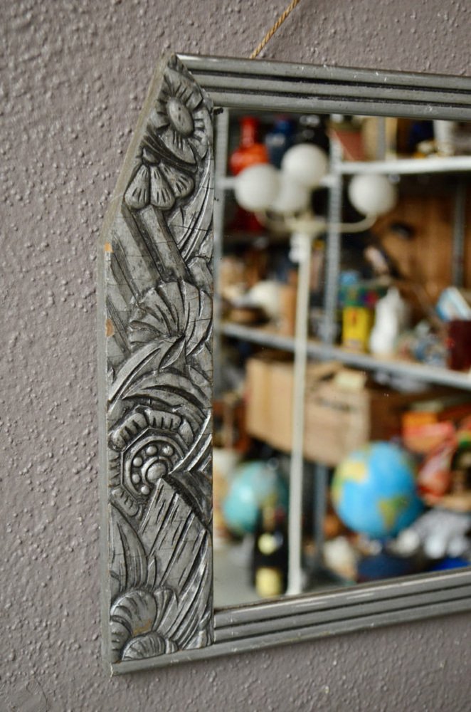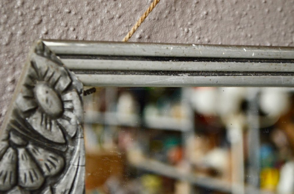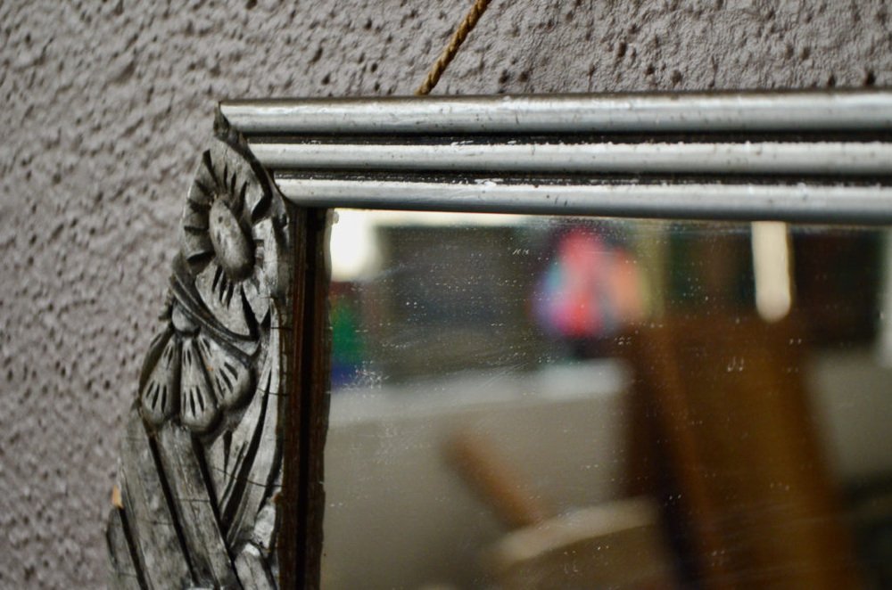 The mirror is old and dates from the 40s. The sheen is slightly patinated in places. The frame is made of wood carved with floral motifs and grooves, some traces of time are visible. The silver paint is original, some small missing parts are to be noted on the edges. The mirror is patinated and in good condition.