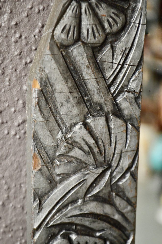 Bohemian charm, wood carved with floral motifs and silver paint, this 1940s wall mirror is a concentrate of Art Deco charm. The finesse of the decorations is enhanced by the shadows and play of light brought to the fore by the antique silver paint with a patina. The tain, also slightly patinated, participates in the charm of this mirror, timeless wall decoration.