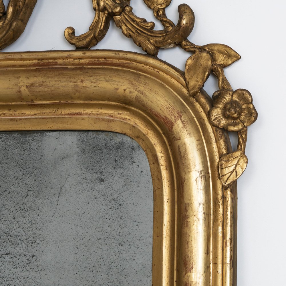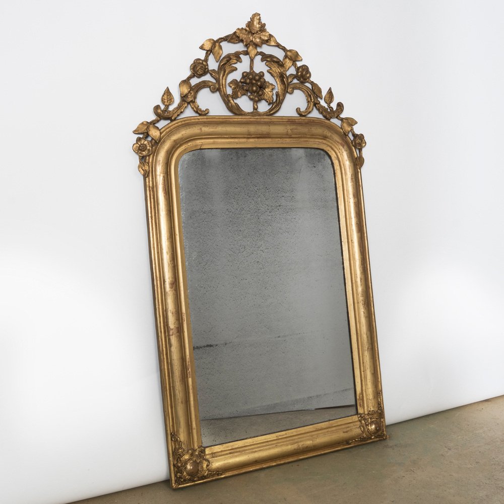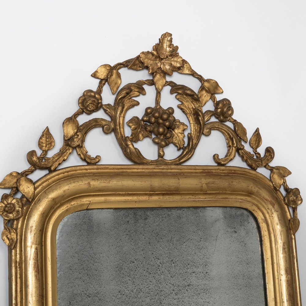 Exquisite 19th Century Louis Philippe Mirror in Gold Gilt, showcasing a captivating ornate cartouche adorned with intricate foliage and grape motifs. France, circa 1850 – 1880s.