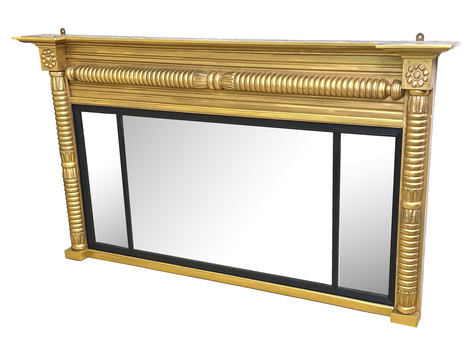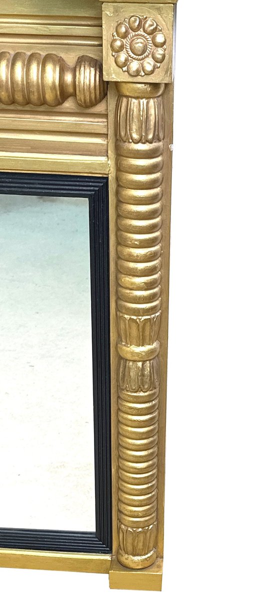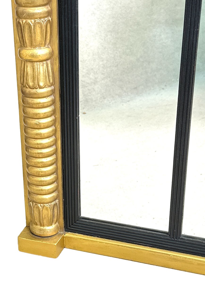 Attraente specchiera da soffitto in legno dorato e gesso della metà del XIX secolo, di proporzioni insolitamente ridotte, con piastre di ricambio a tre specchi all'interno di scivoli con canne ebanizzate, circondate da eleganti colonne a mezzo giro ben intagliate sul bordo.