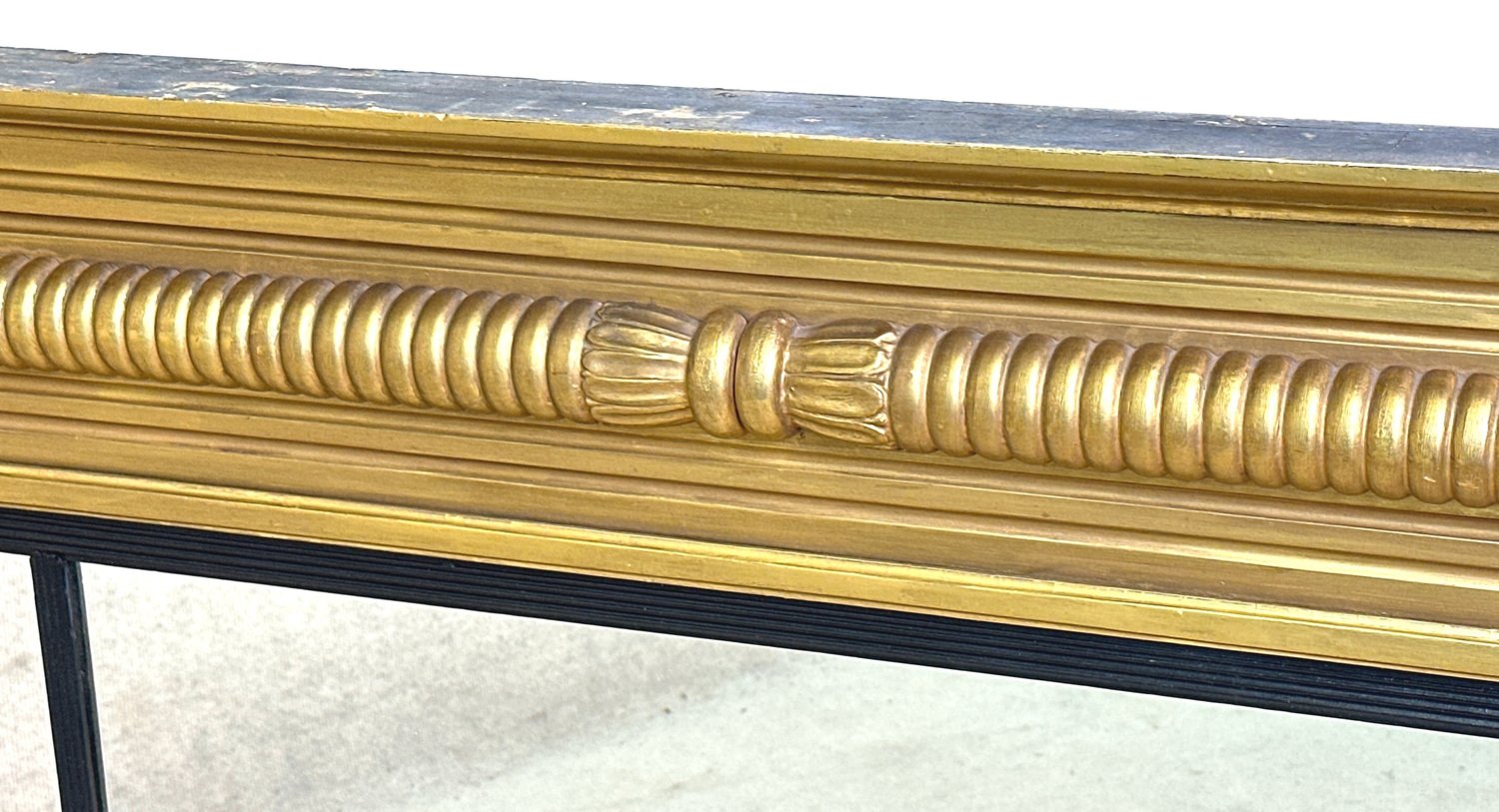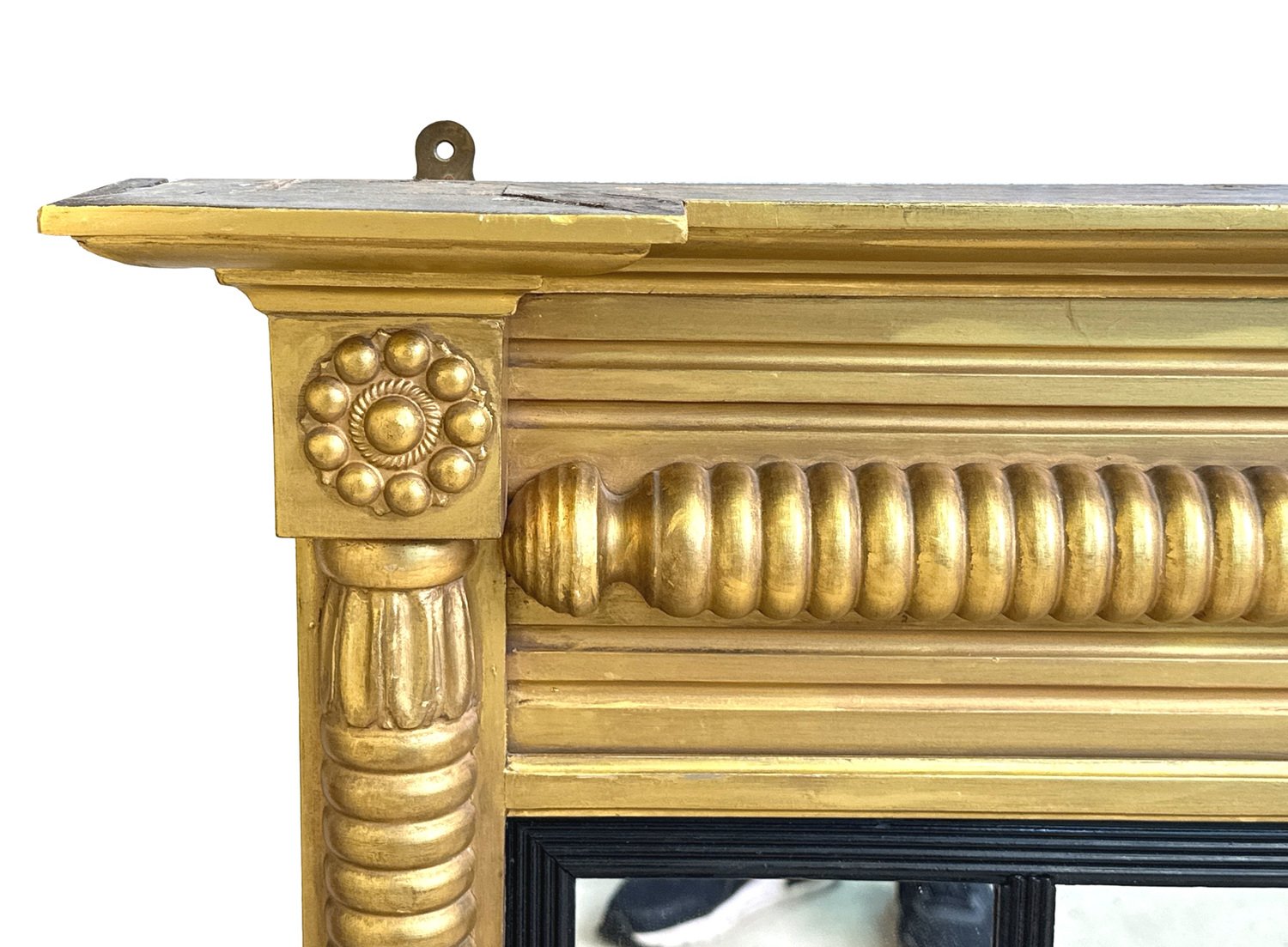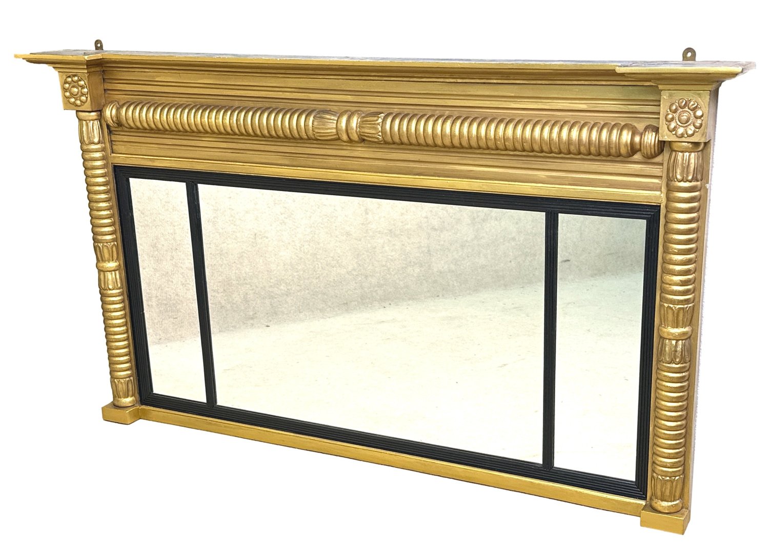 Attraente specchiera da soffitto in legno dorato e gesso della metà del XIX secolo, di proporzioni insolitamente ridotte, con piastre di ricambio a tre specchi all'interno di scivoli con canne ebanizzate, circondate da eleganti colonne a mezzo giro ben intagliate sul bordo.