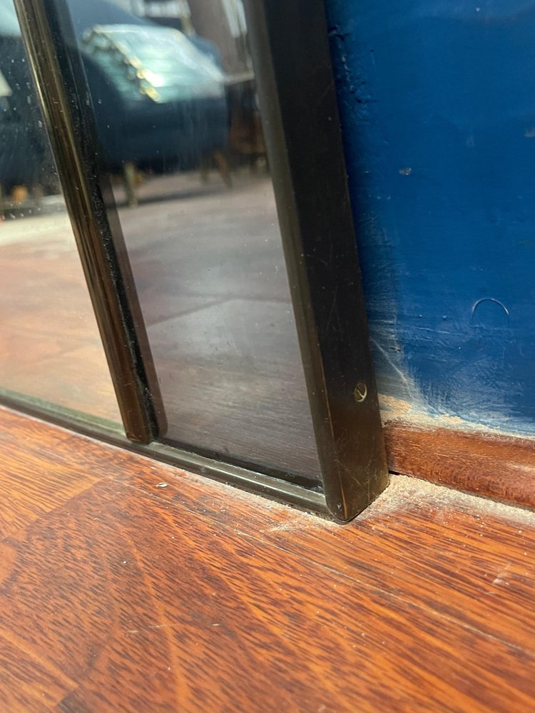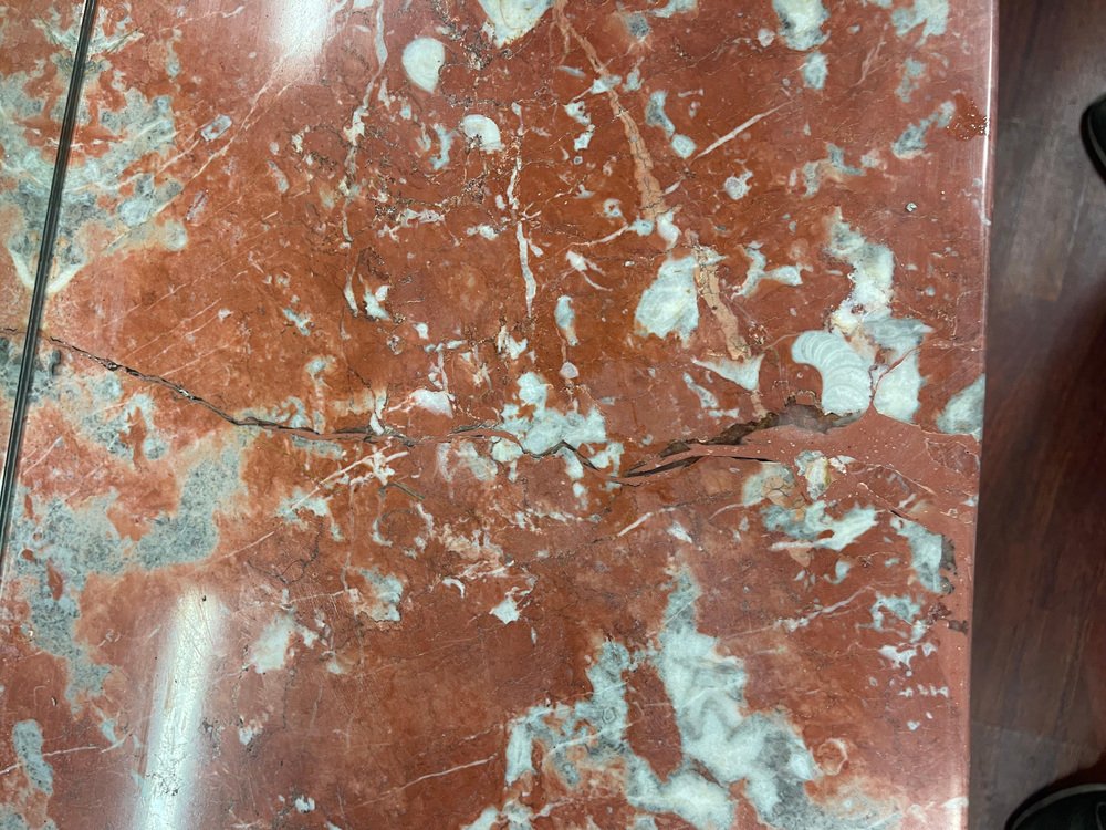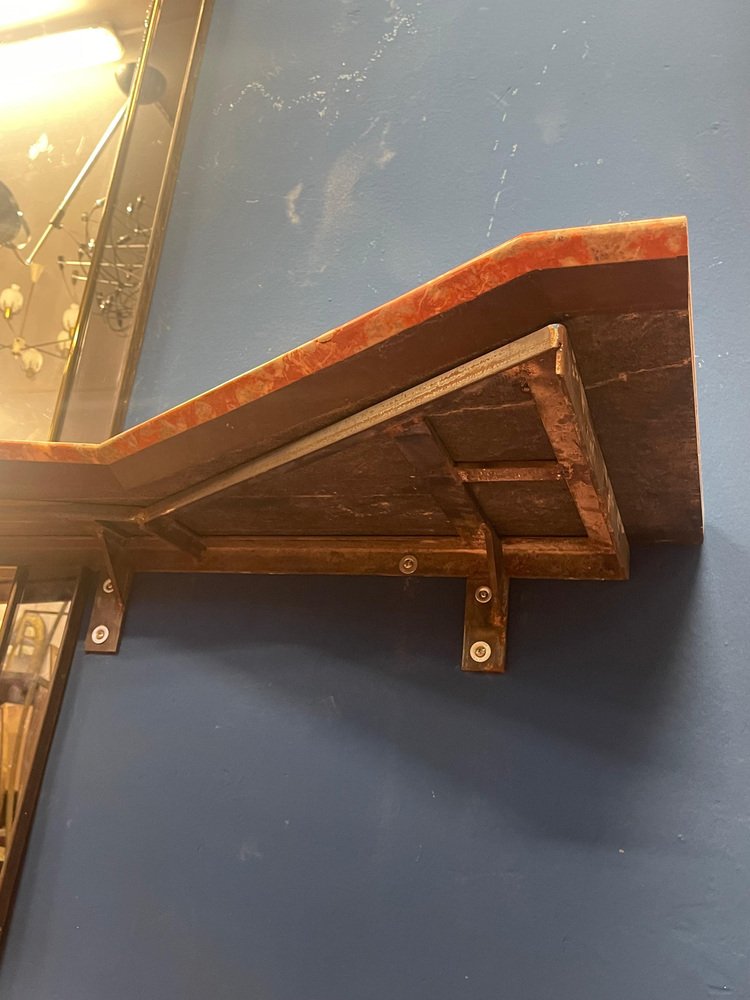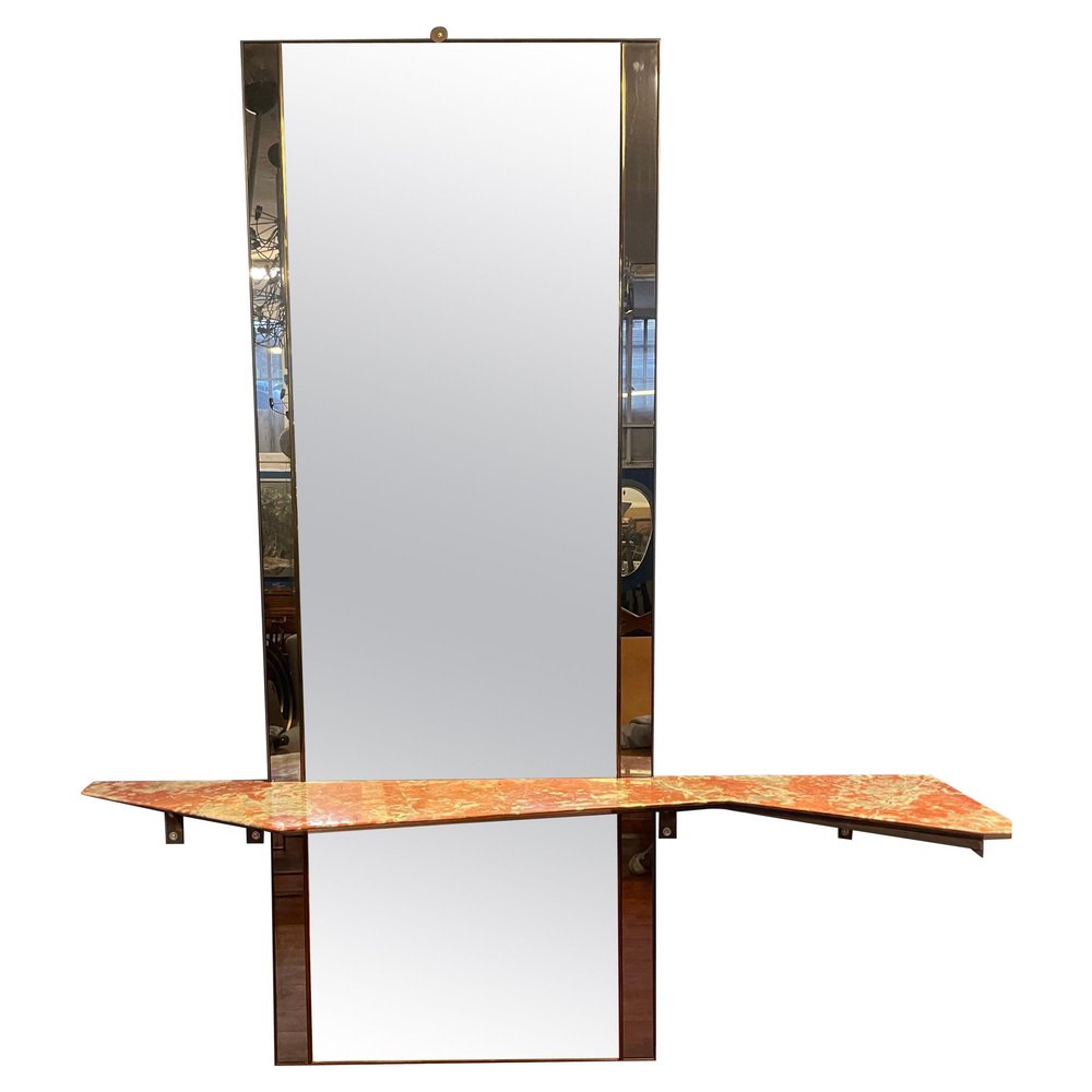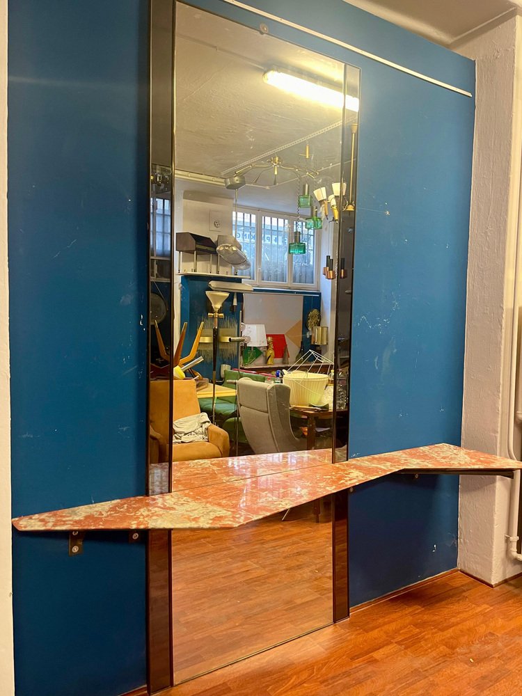 Elegante e raffinata specchiera da ingresso con imponente consolle in marmo rosso, fine anni '60 circa, made in Italy. La specchiera è composta da due pannelli specchianti (uno sotto e uno sopra la mensola in marmo), con fasce verticali ai lati in vetro/specchio fumé, bordate e incorniciate in ottone. Tra questi, una massiccia mensola in ferro, sostiene il meraviglioso marmo sagomato, realizzato con due lastre di marmi diversi, infatti, come si può vedere nelle foto, la parte superiore è di colore rosso massimo, mentre da sotto, si vede un marmo nero. Questo dettaglio, oltre a rendere più solida la consolle, dà un tocco di raffinatezza e ricercatezza a questo esclusivo mobile. La staffa in ferro è stata realizzata di recente, poiché quella originale non poteva essere rimossa dalla parete che la ospitava, tuttavia ne è stata fatta una copia esatta. Patina di ottone, appannamento e usura da uso come mostrato. Lo specchio presenta segni in alcuni punti, come mostrato, oltre a graffi superficiali/usura generale e una crepa in un punto del bordo laterale fumé. I difetti sono visibili nelle foto. Rimane un pezzo impressionante e affascinante che si pone al centro della scena in qualsiasi ambiente.