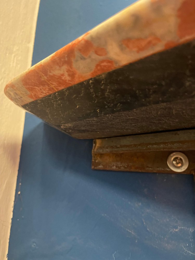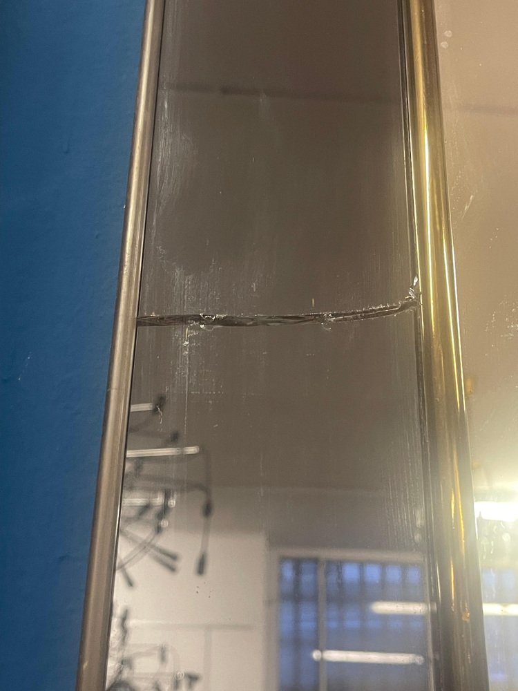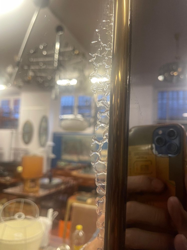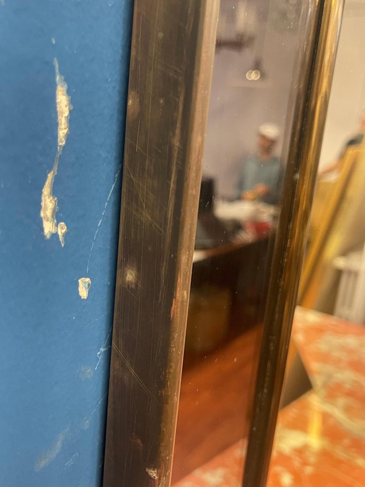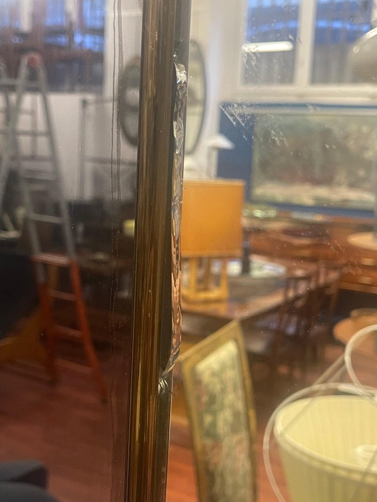 Elegante e raffinata specchiera da ingresso con imponente consolle in marmo rosso, fine anni '60 circa, made in Italy. La specchiera è composta da due pannelli specchianti (uno sotto e uno sopra la mensola in marmo), con fasce verticali ai lati in vetro/specchio fumé, bordate e incorniciate in ottone. Tra questi, una massiccia mensola in ferro, sostiene il meraviglioso marmo sagomato, realizzato con due lastre di marmi diversi, infatti, come si può vedere nelle foto, la parte superiore è di colore rosso massimo, mentre da sotto, si vede un marmo nero. Questo dettaglio, oltre a rendere più solida la consolle, dà un tocco di raffinatezza e ricercatezza a questo esclusivo mobile. La staffa in ferro è stata realizzata di recente, poiché quella originale non poteva essere rimossa dalla parete che la ospitava, tuttavia ne è stata fatta una copia esatta. Patina di ottone, appannamento e usura da uso come mostrato. Lo specchio presenta segni in alcuni punti, come mostrato, oltre a graffi superficiali/usura generale e una crepa in un punto del bordo laterale fumé. I difetti sono visibili nelle foto. Rimane un pezzo impressionante e affascinante che si pone al centro della scena in qualsiasi ambiente.