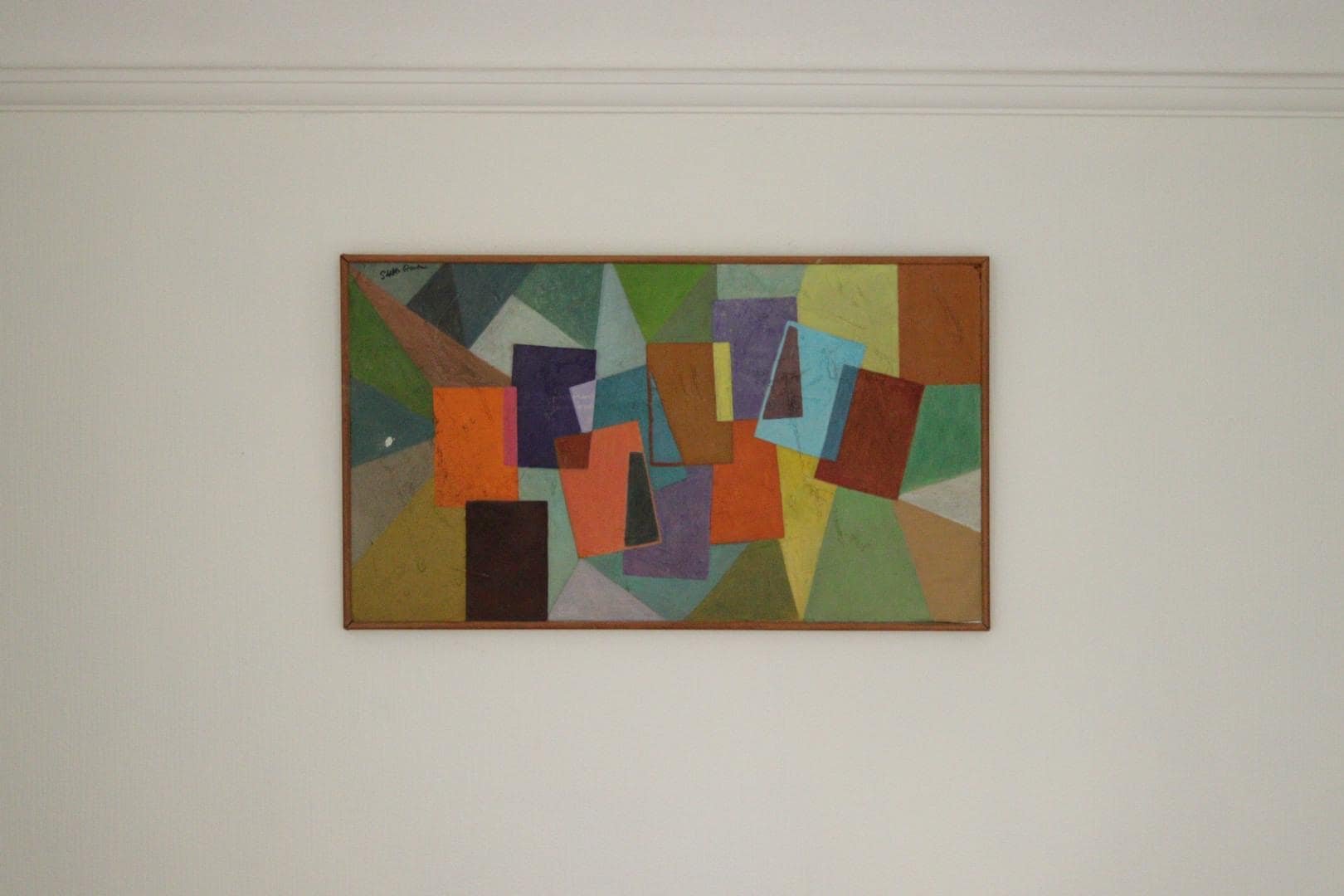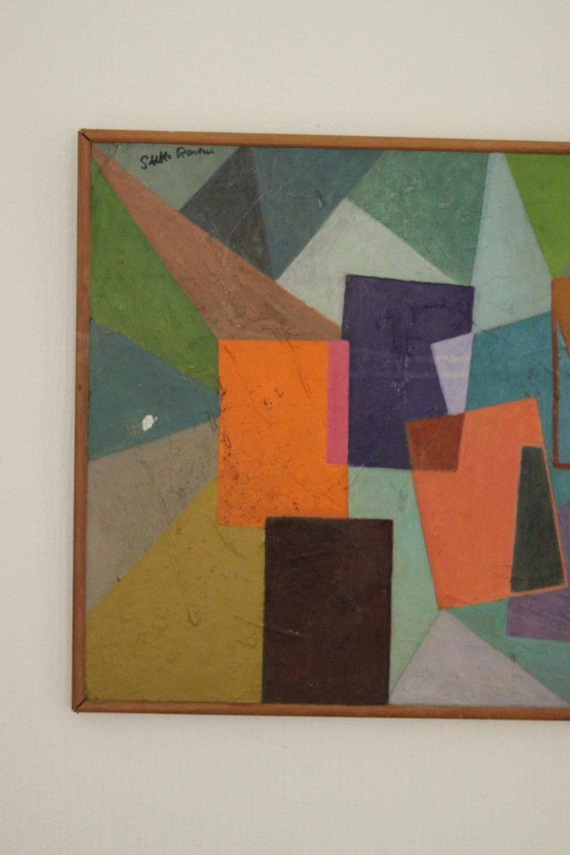 A quietly evocative mid-century composition by English artist Stella Rankin, presented in a framed format with canvas attached to panel. The work reflects the era’s affinity for balance and abstraction, offering a subtle interplay of form and texture. Framed and ready to hang, it carries the gentle patina of age.