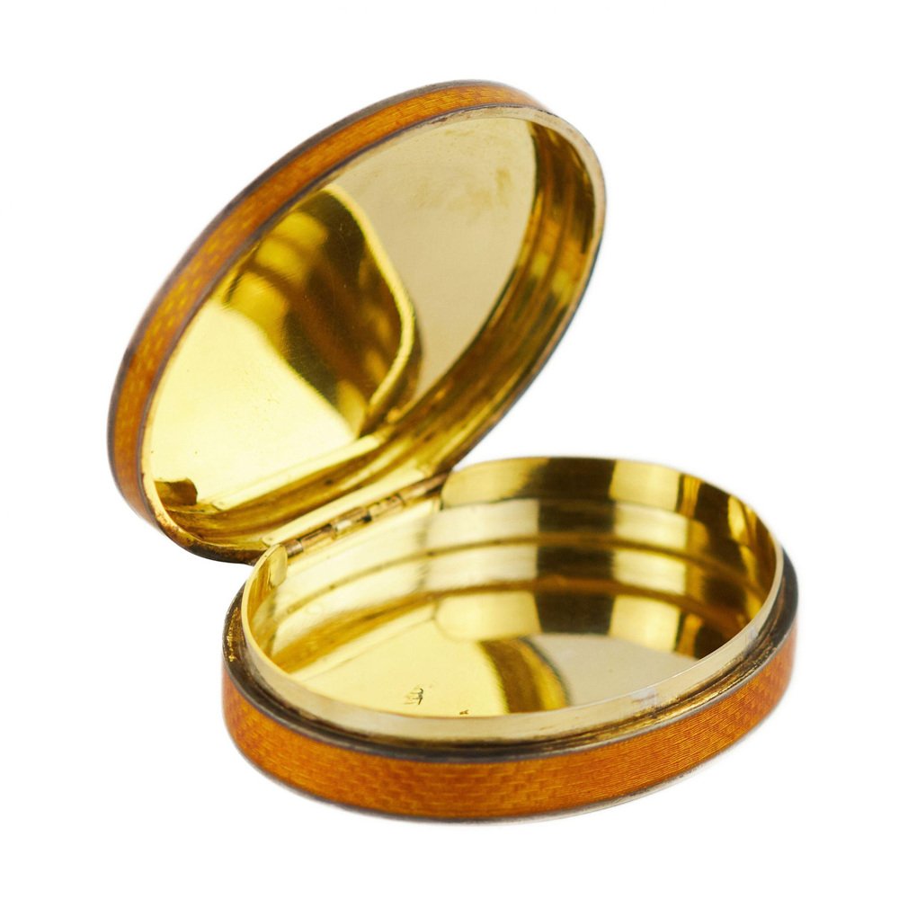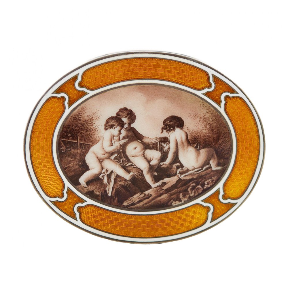 Tabacchiera in argento, di forma ovale, di proporzioni aristocratiche e di colorazione spettacolare. con una fine e deliziosa grisaglia di smalto, con uccelli putti che giocano, e smalto guilloché arancione e bruciante sul corpo. La bordatura in smalto bianco sul coperchio centra la composizione e moltiplica il colore degli smalti. Punzone austriaco a testa di cane in argento massiccio con diamante 800. Il monogramma dei maestri è probabilmente SP in un cerchio. Austria-Ungheria, inizio del XX secolo. 6.6 x 8,4 x 1,8 cm. Peso: 145 g.
