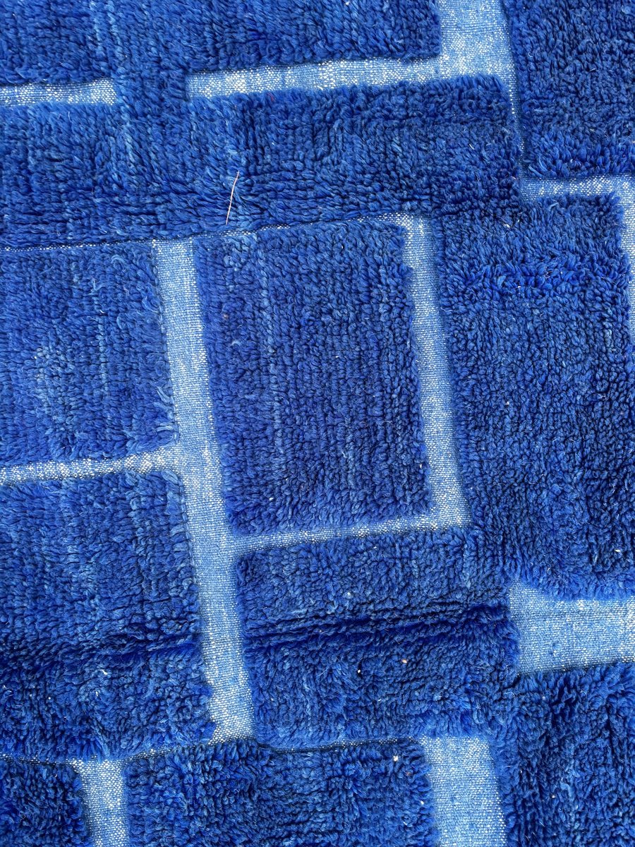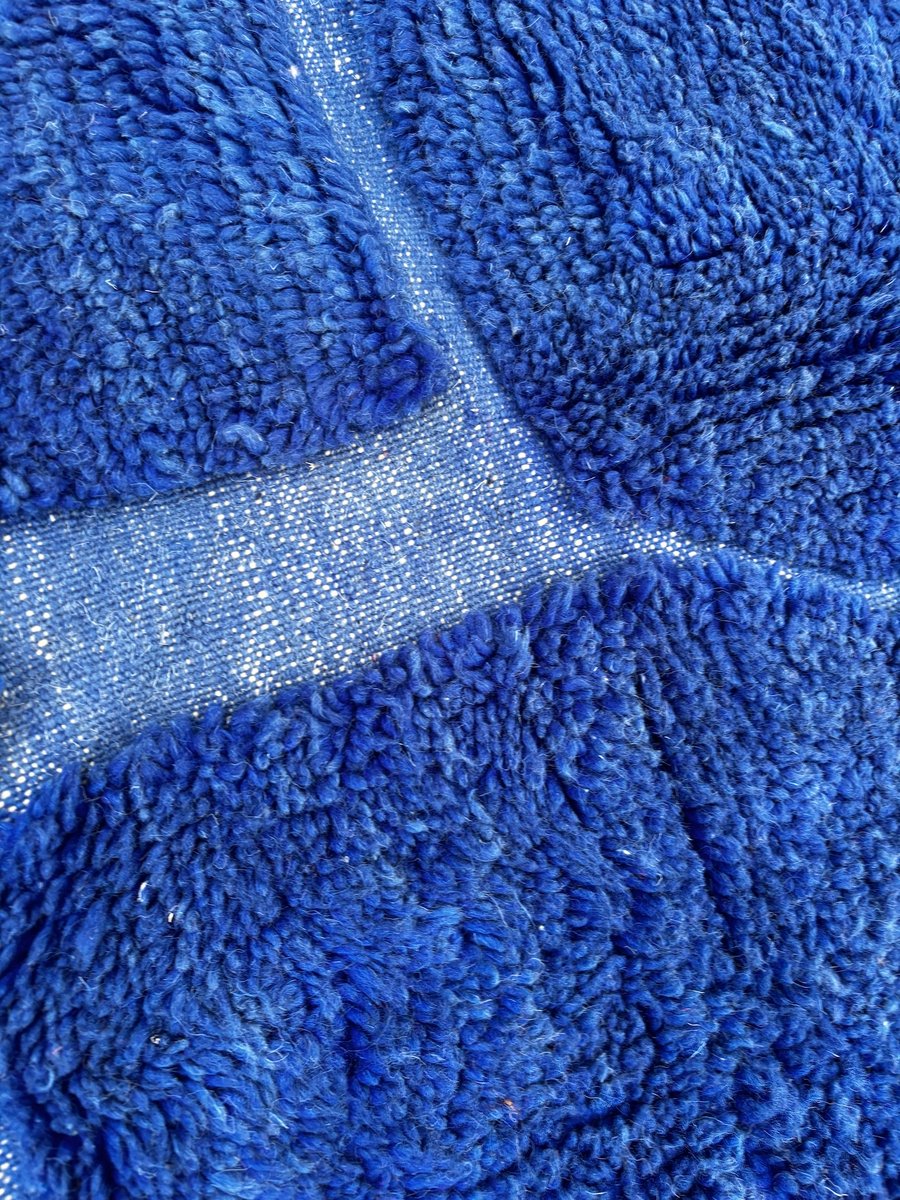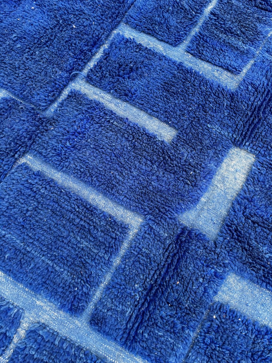 This exceptional Beni Ourain Mrirt rug in deep Majorelle blue is a striking example of contemporary Moroccan craftsmanship.