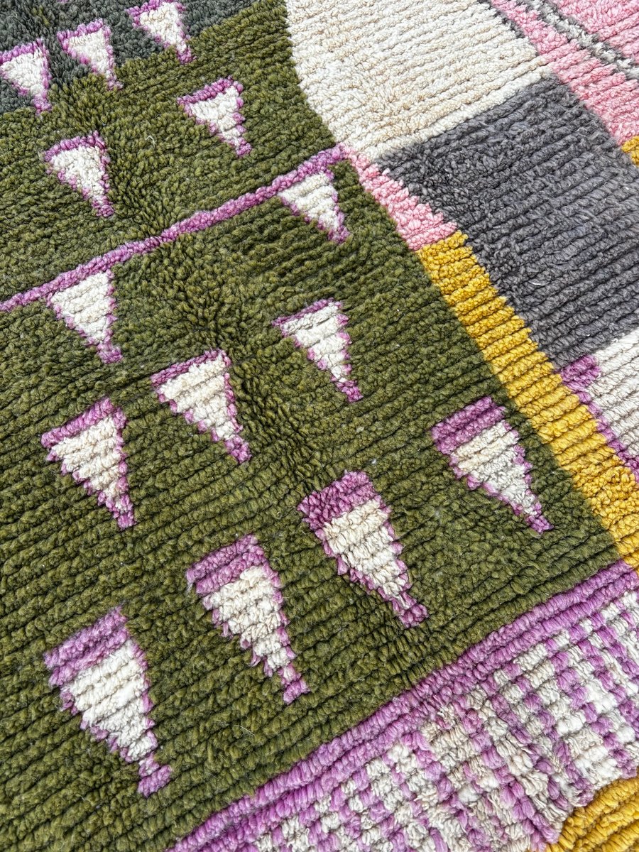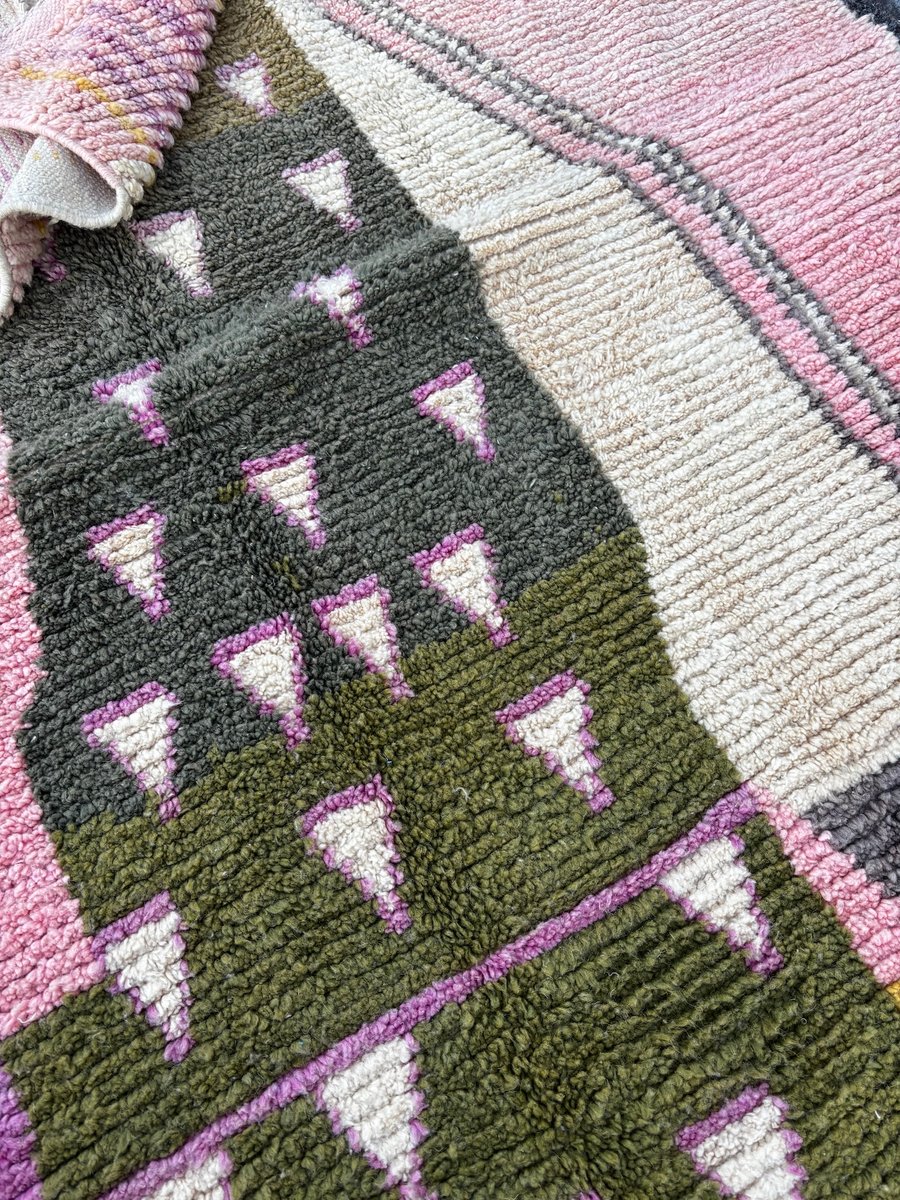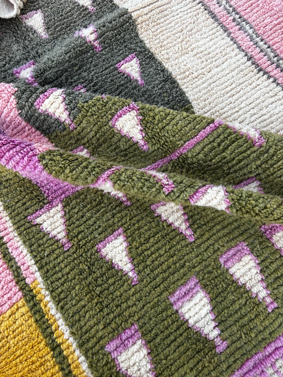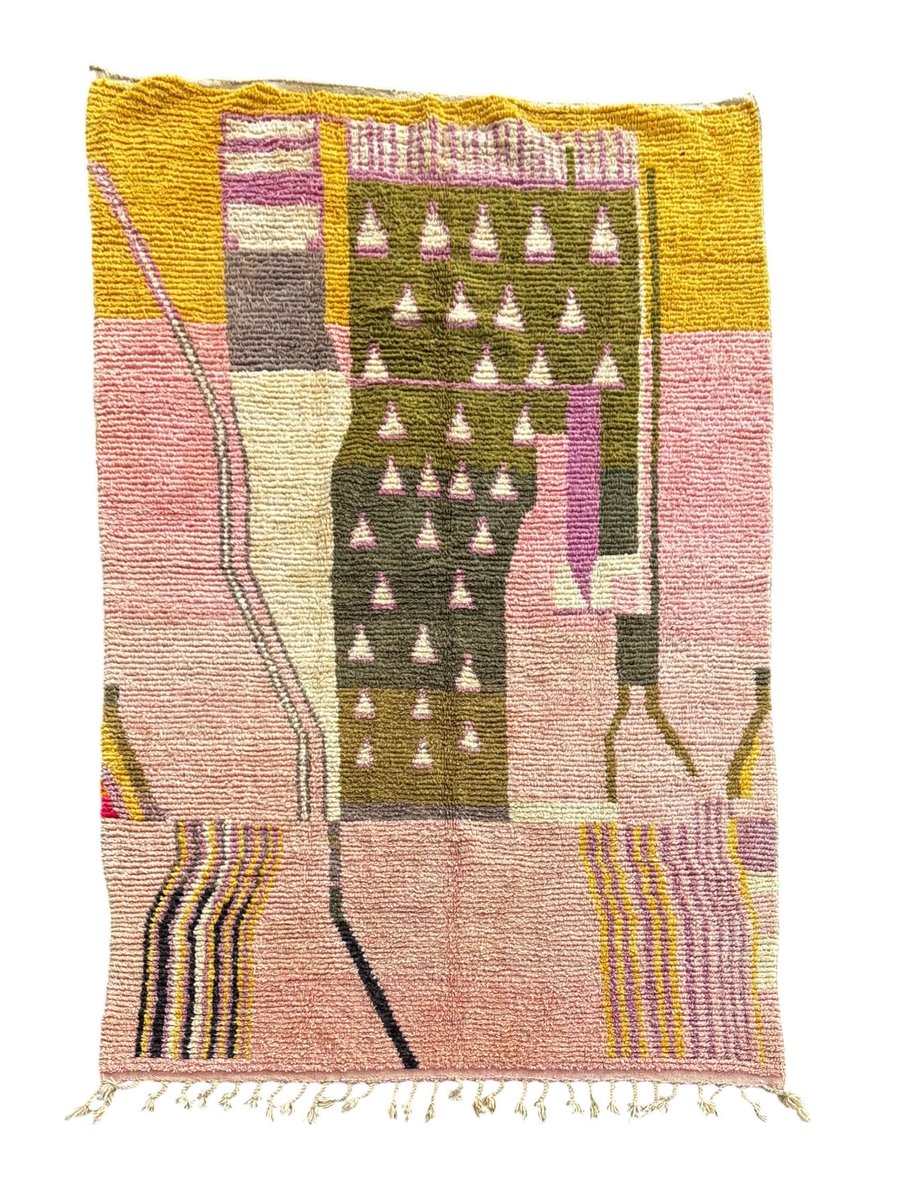 Origine: Marocco Regione: Boujad, Medio Atlante Materiale: Lana naturale Tecnica: Tessuto a mano Dimensioni: 200 × 300 cm Colori: Rosa, giallo senape, verde oliva, avorio, lilla, nero Condizioni Il tappeto è in ottime condizioni. È stato pulito professionalmente e ispezionato con cura. Piccole variazioni sono inerenti alla produzione artigianale e contribuiscono all'unicità e al fascino del pezzo.