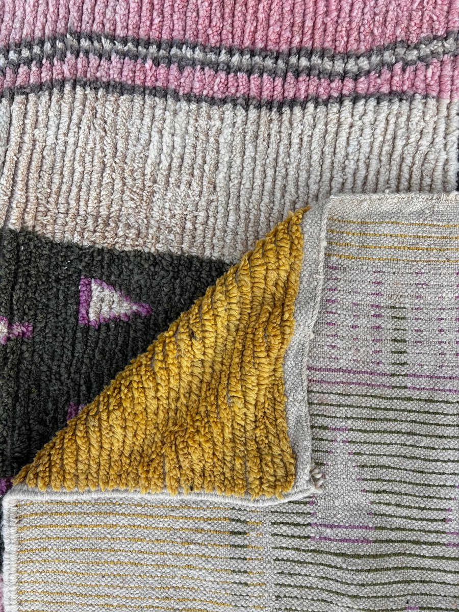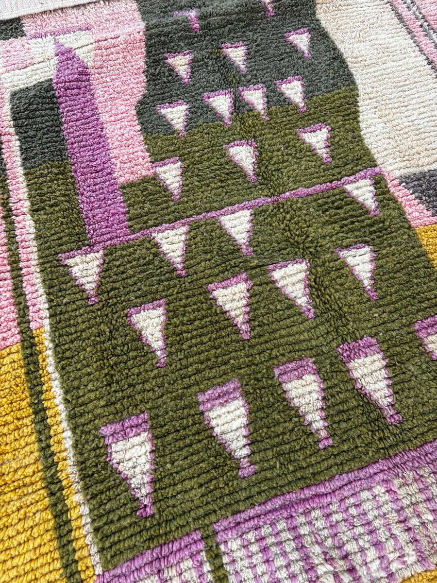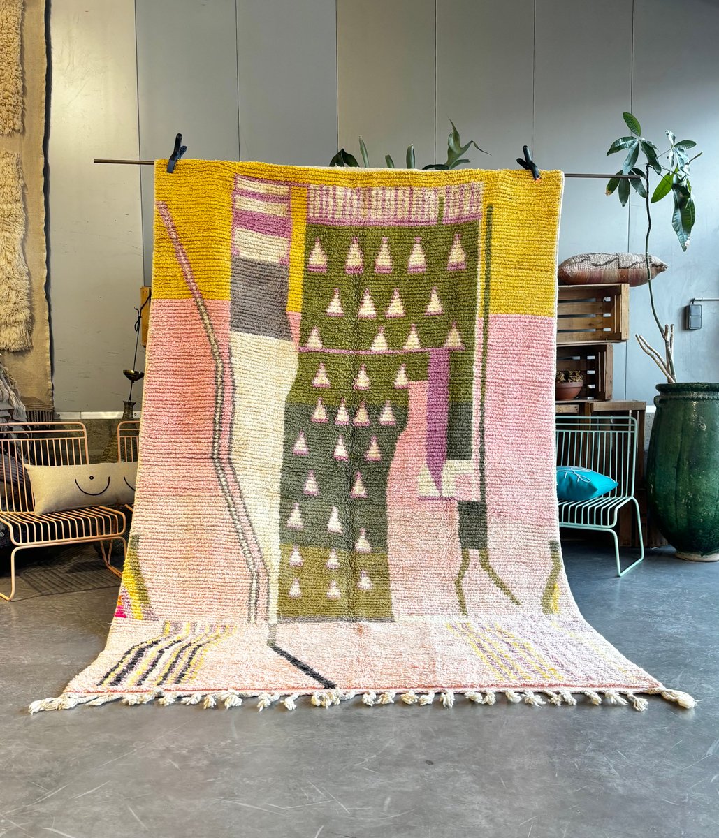 Origine: Marocco Regione: Boujad, Medio Atlante Materiale: Lana naturale Tecnica: Tessuto a mano Dimensioni: 200 × 300 cm Colori: Rosa, giallo senape, verde oliva, avorio, lilla, nero Condizioni Il tappeto è in ottime condizioni. È stato pulito professionalmente e ispezionato con cura. Piccole variazioni sono inerenti alla produzione artigianale e contribuiscono all'unicità e al fascino del pezzo.