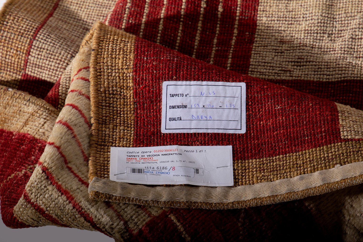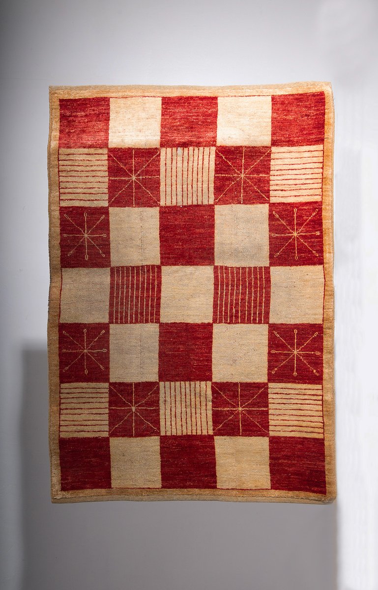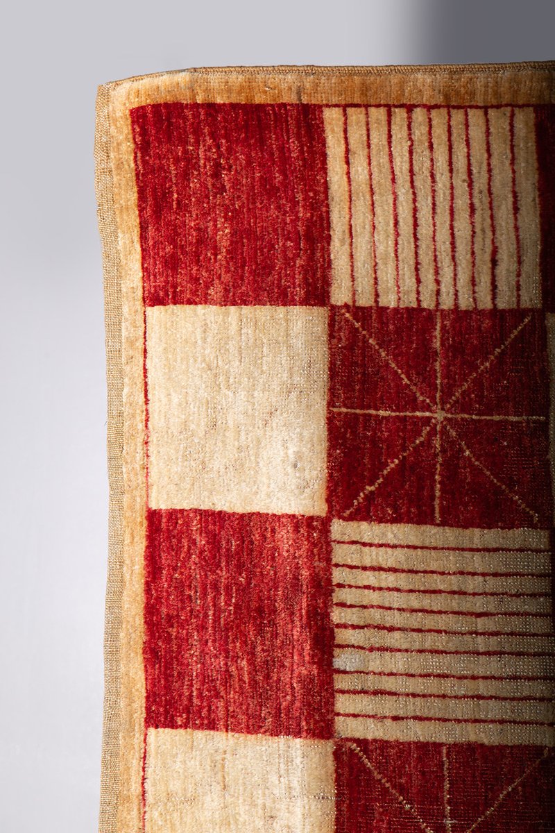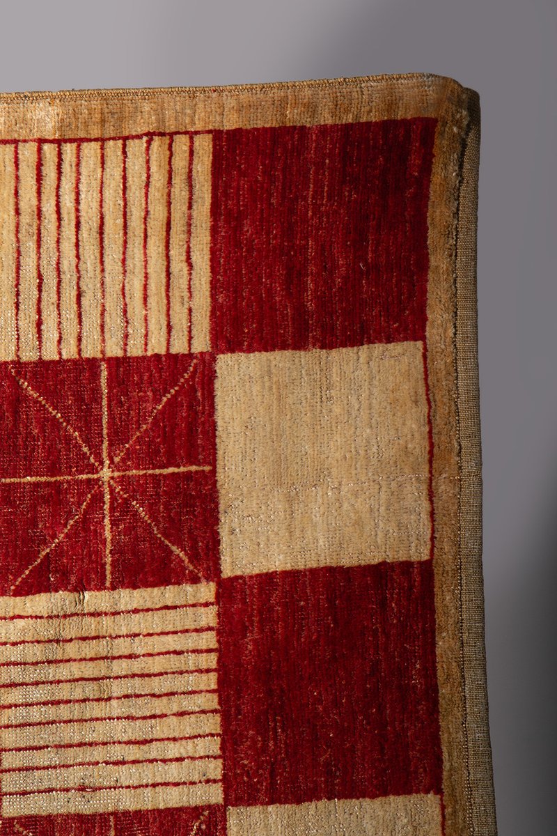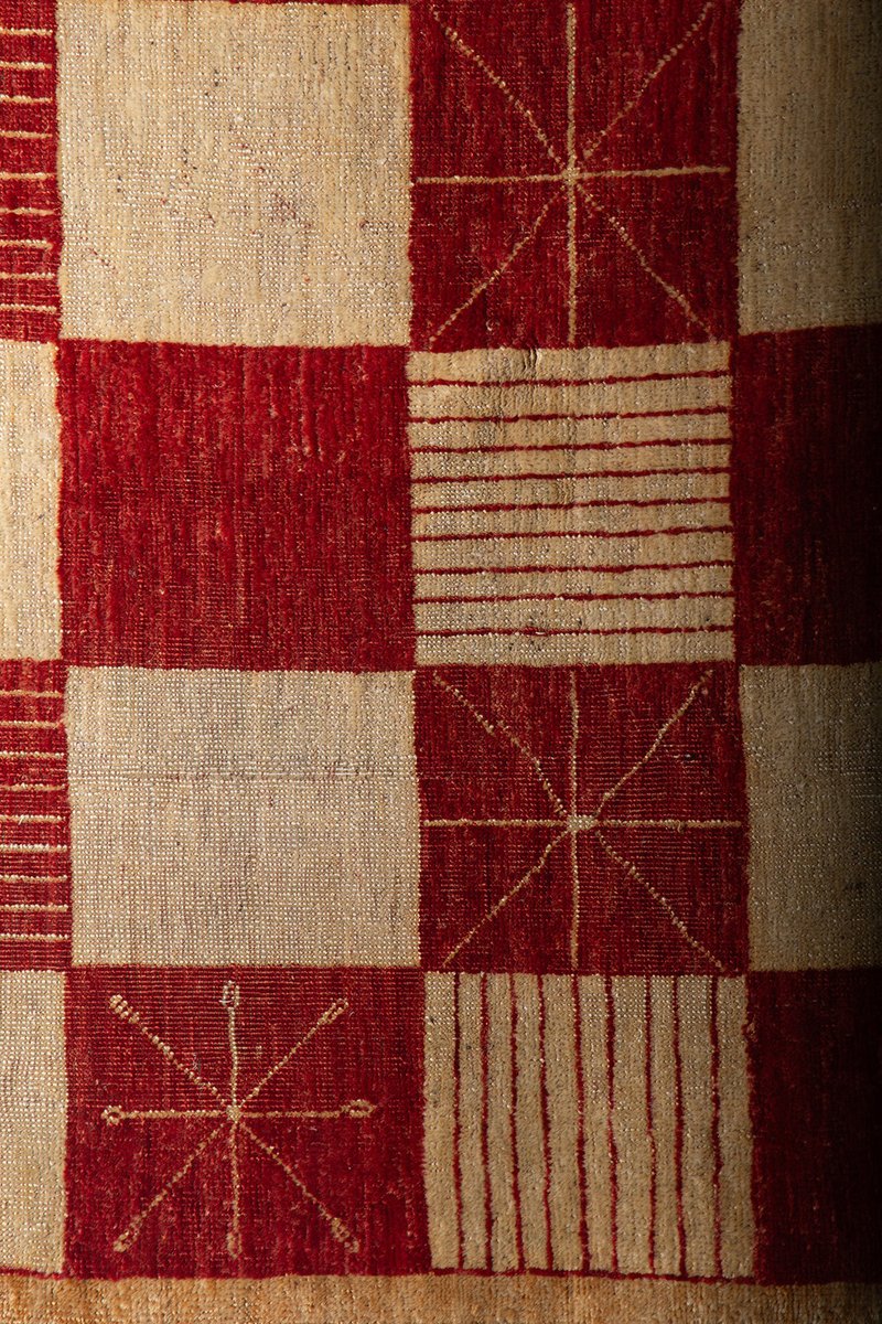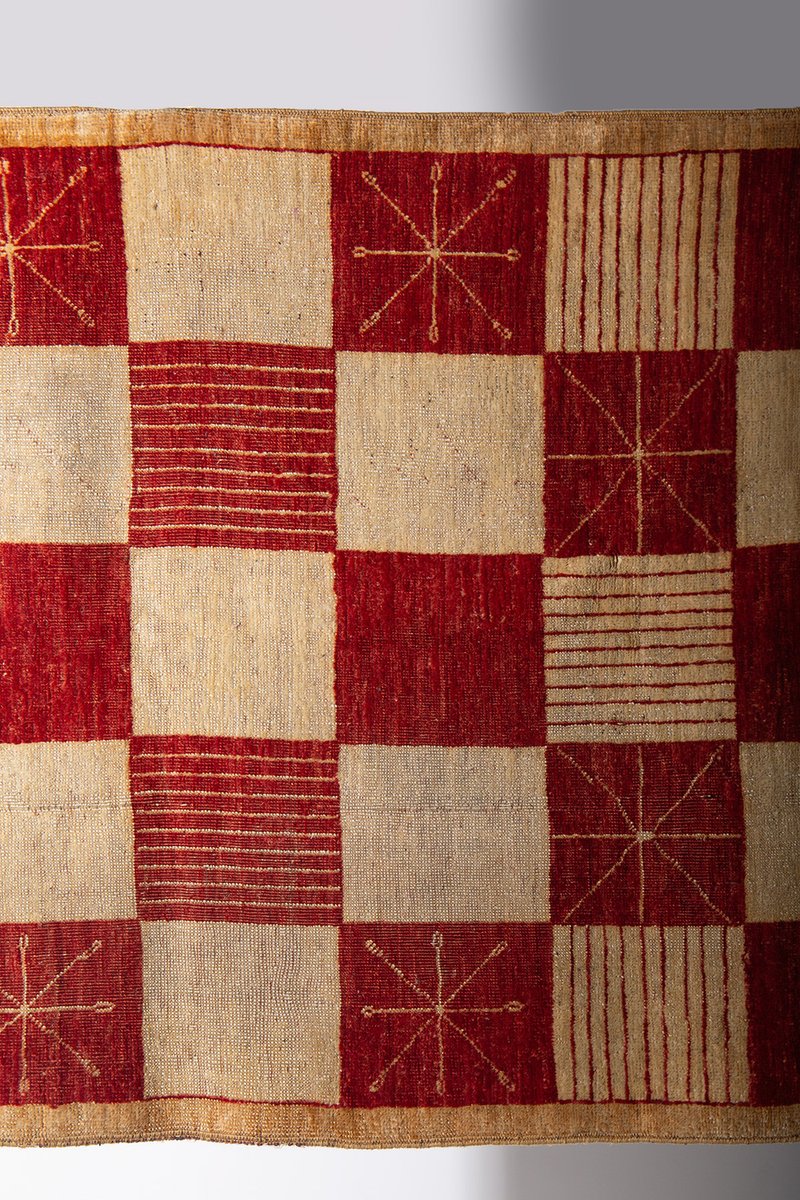 Il tappeto Darya del Pamir è un raffinato esempio di artigianato tessile proveniente dalle incantevoli e remote regioni montuose del Pamir, spesso chiamate "tetto del mondo" Realizzato con un soffice vello di lana e una robusta trama e ordito di cotone, questo tappeto è il risultato di una lavorazione meticolosa che unisce qualità e durata. Il suo elegante disegno a scacchiera, caratterizzato da vibranti tonalità di rosso intenso e beige naturale, è arricchito da linee geometriche che riprendono antichi simboli di protezione e fortuna utilizzati dalle popolazioni nomadi della regione.