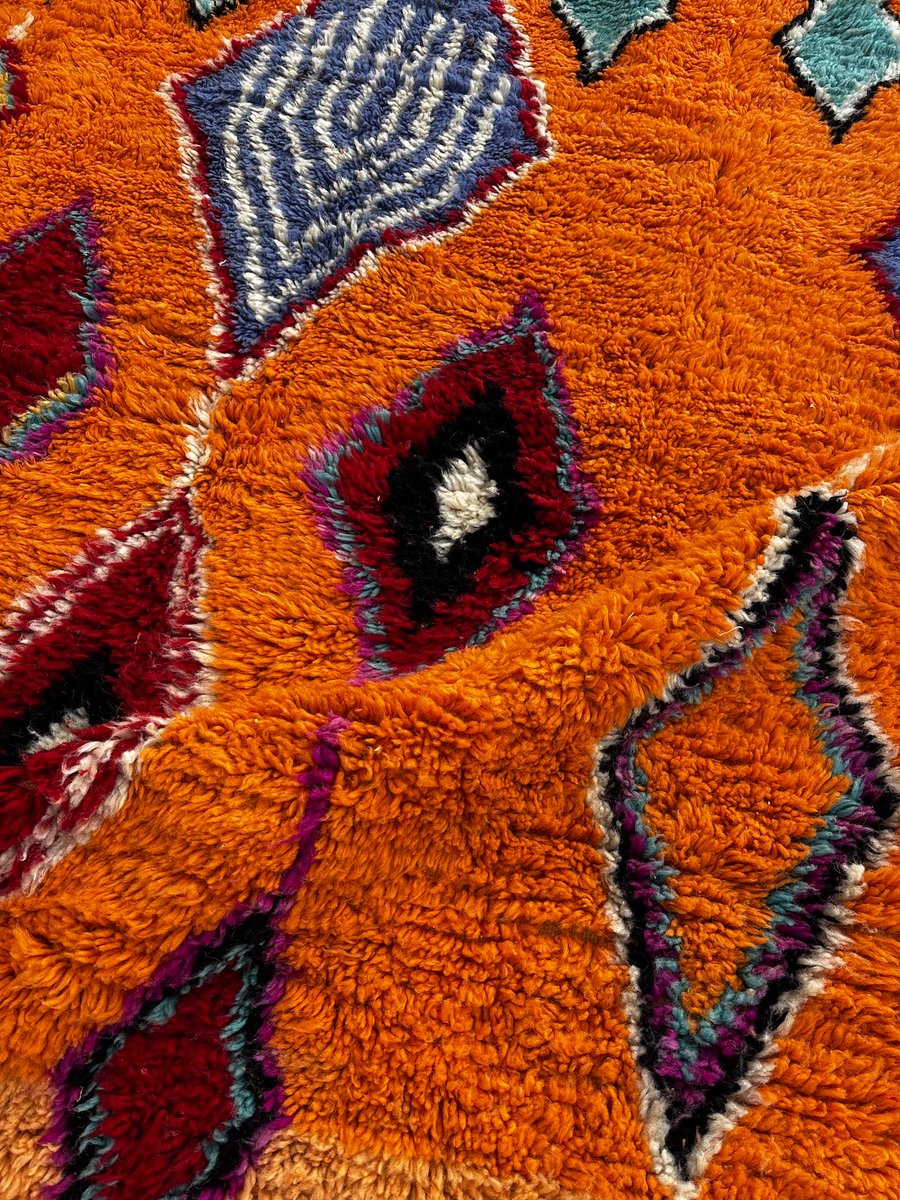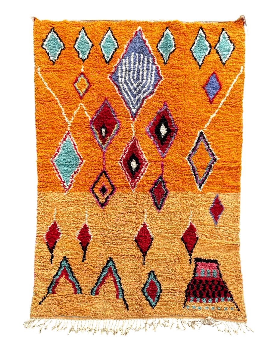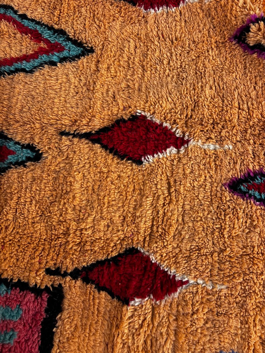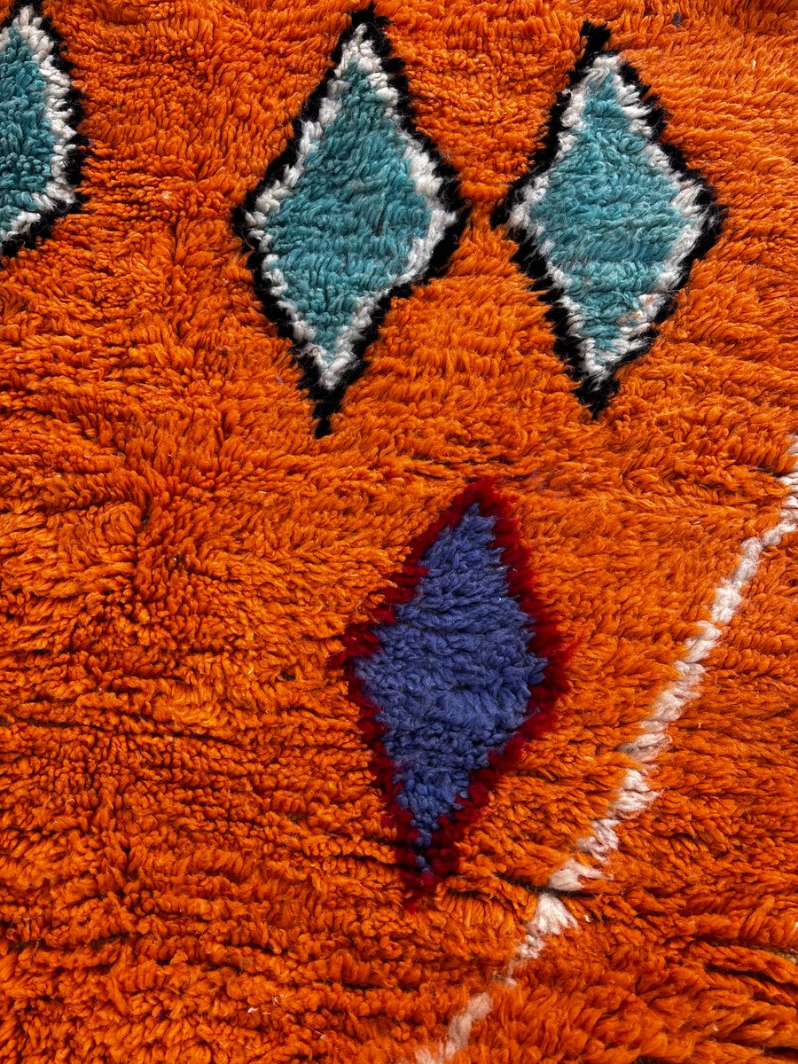 Questo autentico tappeto berbero Boujad marocchino è stato tessuto a mano nella regione del Medio Atlante utilizzando lana naturale di alta qualità. I tappeti Boujad sono noti per il loro linguaggio grafico audace, le ricche trame e le vivaci palette di colori, che rendono ogni pezzo un forte elemento decorativo. Questo tappeto presenta uno sfondo caldo arancione e ocra, impreziosito da espressivi motivi a rombi in turchese, rosso intenso, nero, avorio e tocchi di blu. I motivi geometrici simbolici sono caratteristici delle tradizioni tessili Boujad, che fondono l'eredità ancestrale berbera con un impatto visivo altamente contemporaneo. Interamente tessuto a mano utilizzando tecniche tradizionali tramandate di generazione in generazione, questo tappeto presenta sottili irregolarità che ne sottolineano la natura artigianale. Con le sue generose dimensioni di 200 × 300 cm, è perfetto per un soggiorno, una camera da letto o un interno spazioso dove può fungere da elemento centrale di design.
