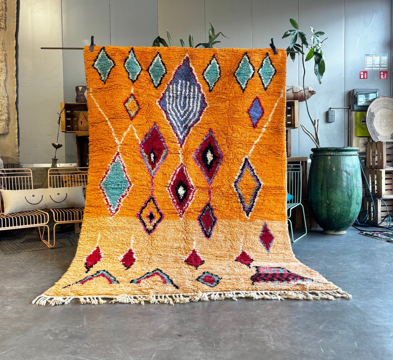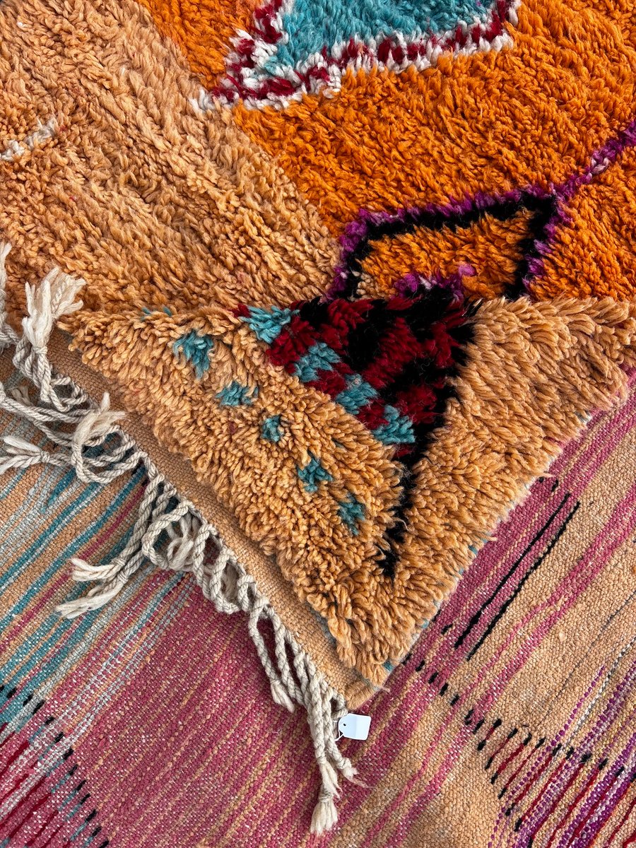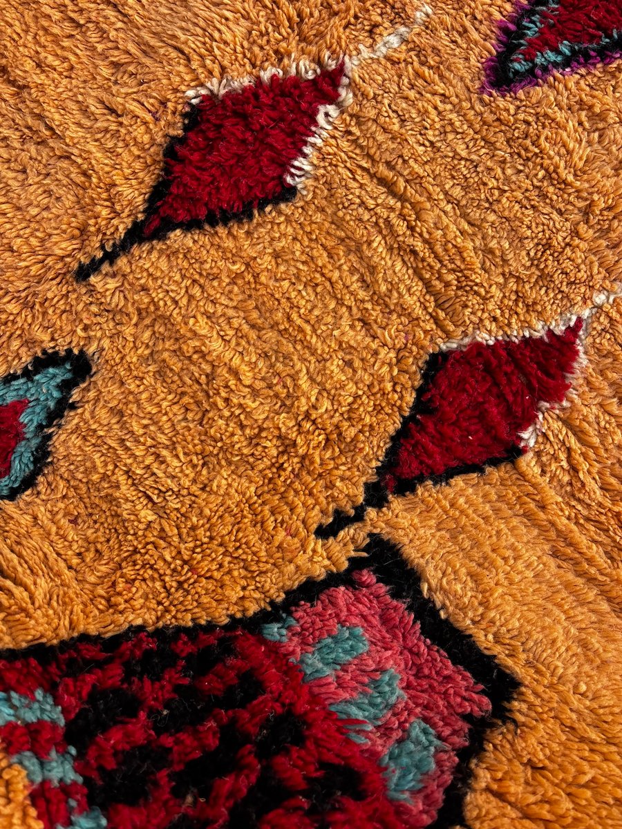 Questo autentico tappeto berbero Boujad marocchino è stato tessuto a mano nella regione del Medio Atlante utilizzando lana naturale di alta qualità. I tappeti Boujad sono noti per il loro linguaggio grafico audace, le ricche trame e le vivaci palette di colori, che rendono ogni pezzo un forte elemento decorativo. Questo tappeto presenta uno sfondo caldo arancione e ocra, impreziosito da espressivi motivi a rombi in turchese, rosso intenso, nero, avorio e tocchi di blu. I motivi geometrici simbolici sono caratteristici delle tradizioni tessili Boujad, che fondono l'eredità ancestrale berbera con un impatto visivo altamente contemporaneo. Interamente tessuto a mano utilizzando tecniche tradizionali tramandate di generazione in generazione, questo tappeto presenta sottili irregolarità che ne sottolineano la natura artigianale. Con le sue generose dimensioni di 200 × 300 cm, è perfetto per un soggiorno, una camera da letto o un interno spazioso dove può fungere da elemento centrale di design.
