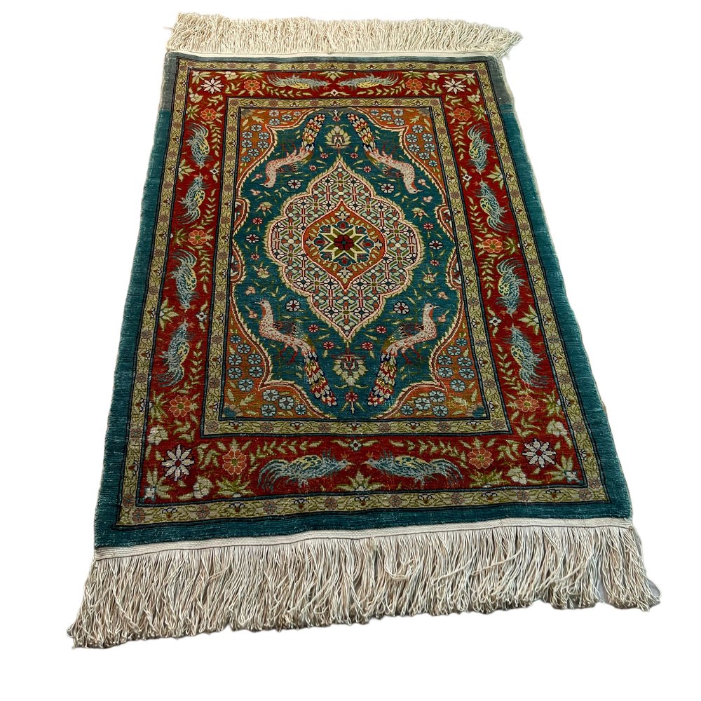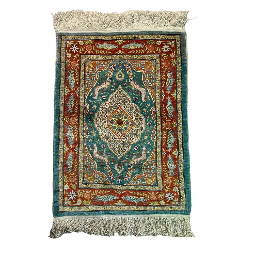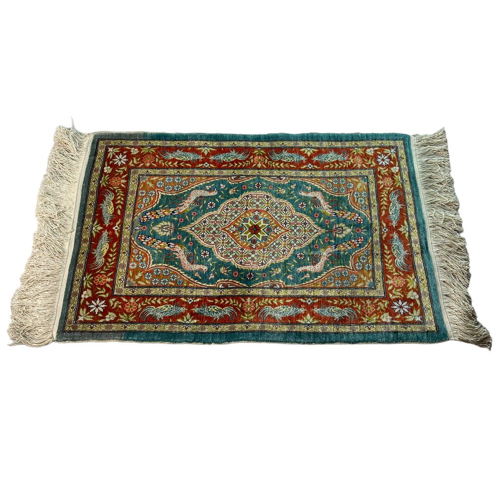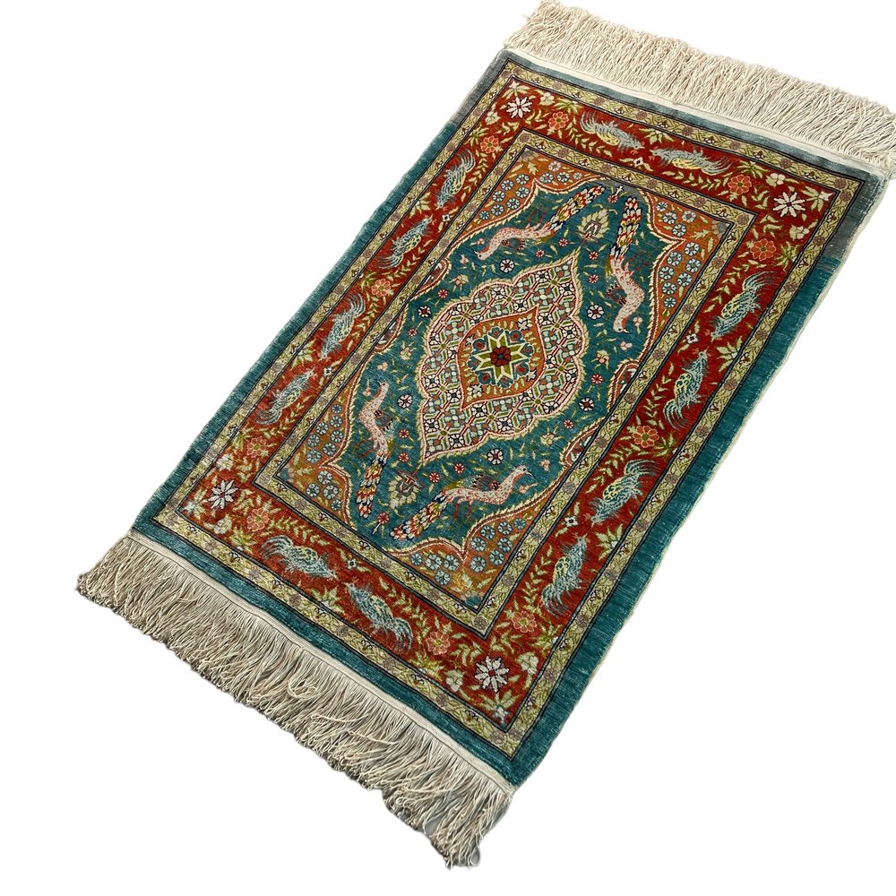 Product : The Vintage Turkish Silk Hereke rug is a stunning piece of artwork that adds a touch of elegance to any space. This handcrafted rug measures 78x52 cm and has been meticulously knotted in Hereke, Turkey. Crafted from the finest materials, including silk this vintage rug boasts variations of naturally dyed wool in soft, muted colors. Its unique character, typical of vintage rugs from the 1960s, will captivate your senses and elevate the ambiance of your home. Highlights: - Handcrafted: Each rug is carefully made by skilled artisans, ensuring attention to detail and craftsmanship in every knot. - Vintage from the 1960s: This rug has a distinct charm that adds a touch of nostalgia to any room. - Shipped from a small business in Germany: Your rug will be meticulously packaged to ensure safe delivery to your doorstep. - Material: Made from pure, silk providing a luxurious texture and durability. - Width: Measures 52 centimeters, making it suitable for various room sizes. - Length: Measures 78 centimeters, providing ample coverage for your flooring needs. Benefits: - Warmth and Elegance: The natural colors of this Hereke rug bring warmth and sophistication to any space.
