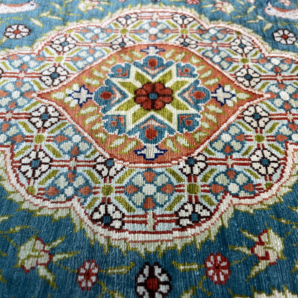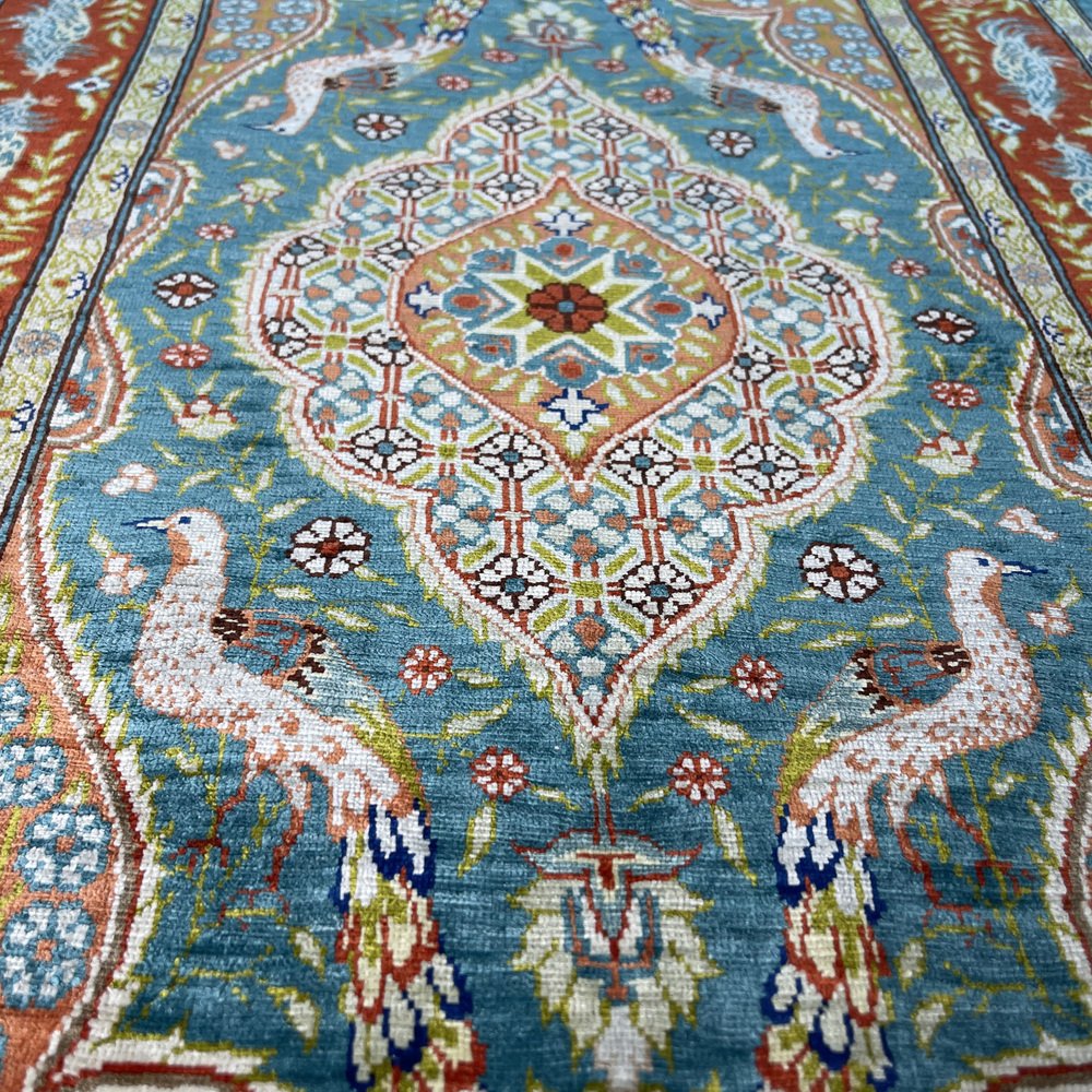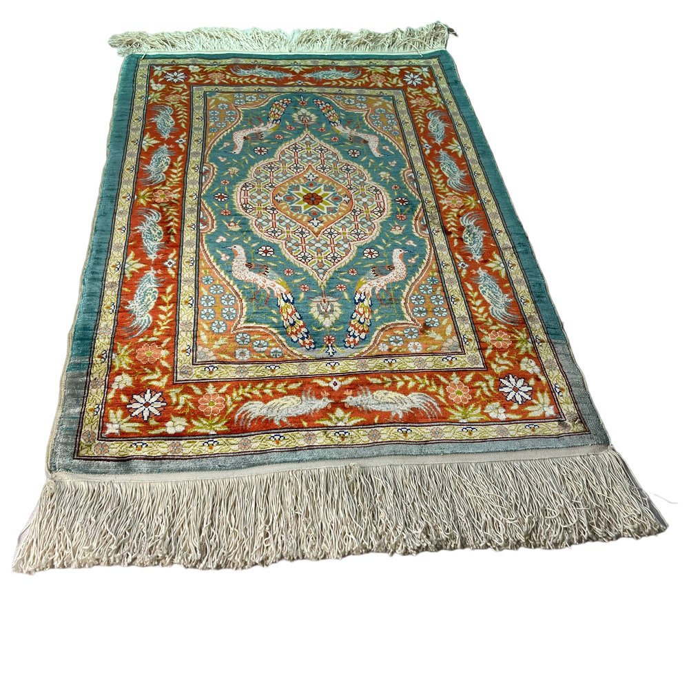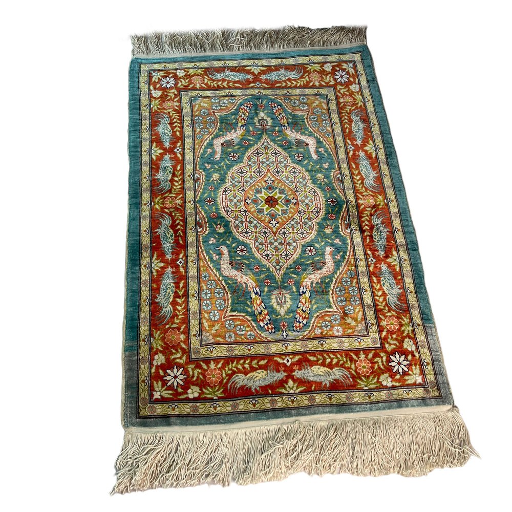 Product : The Vintage Turkish Silk Hereke rug is a stunning piece of artwork that adds a touch of elegance to any space. This handcrafted rug measures 78x52 cm and has been meticulously knotted in Hereke, Turkey. Crafted from the finest materials, including silk this vintage rug boasts variations of naturally dyed wool in soft, muted colors. Its unique character, typical of vintage rugs from the 1960s, will captivate your senses and elevate the ambiance of your home. Highlights: - Handcrafted: Each rug is carefully made by skilled artisans, ensuring attention to detail and craftsmanship in every knot. - Vintage from the 1960s: This rug has a distinct charm that adds a touch of nostalgia to any room. - Shipped from a small business in Germany: Your rug will be meticulously packaged to ensure safe delivery to your doorstep. - Material: Made from pure, silk providing a luxurious texture and durability. - Width: Measures 52 centimeters, making it suitable for various room sizes. - Length: Measures 78 centimeters, providing ample coverage for your flooring needs. Benefits: - Warmth and Elegance: The natural colors of this Hereke rug bring warmth and sophistication to any space.