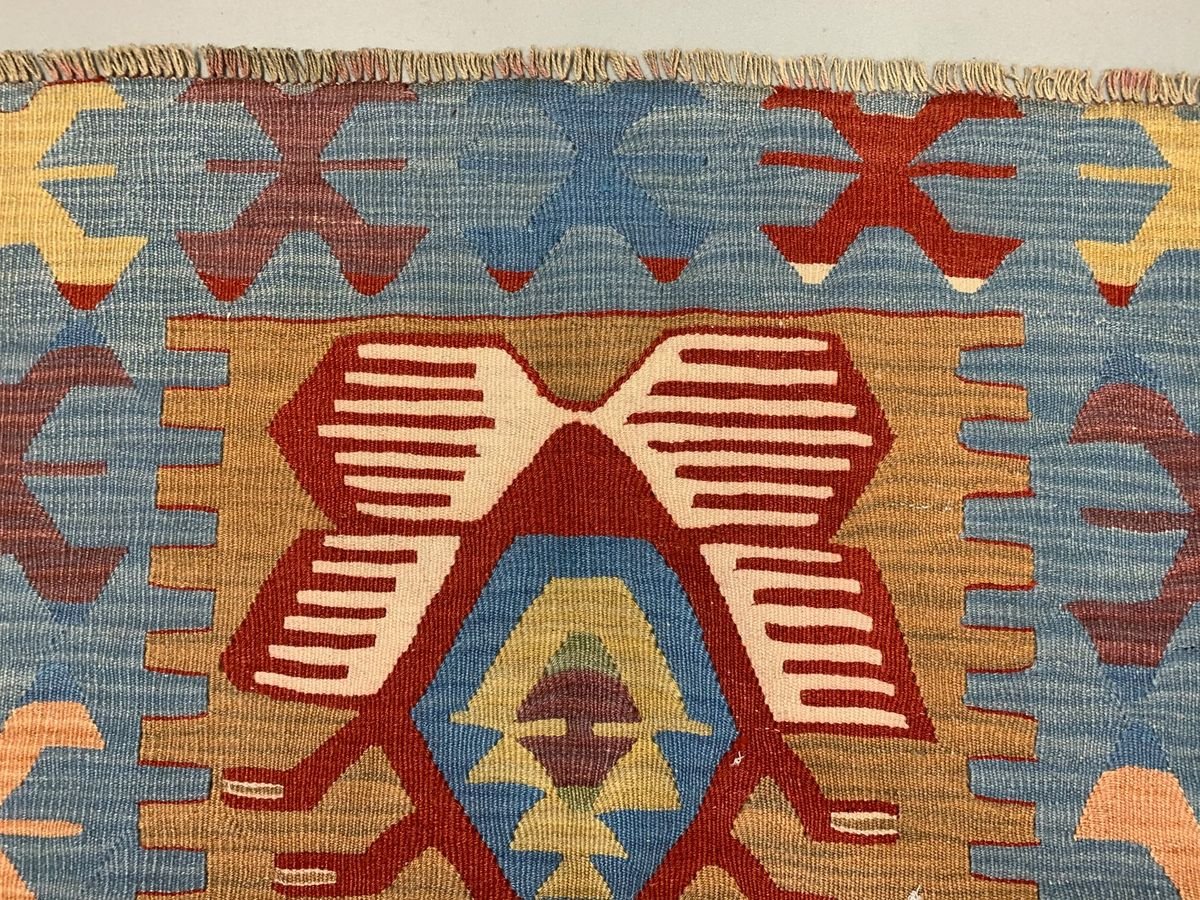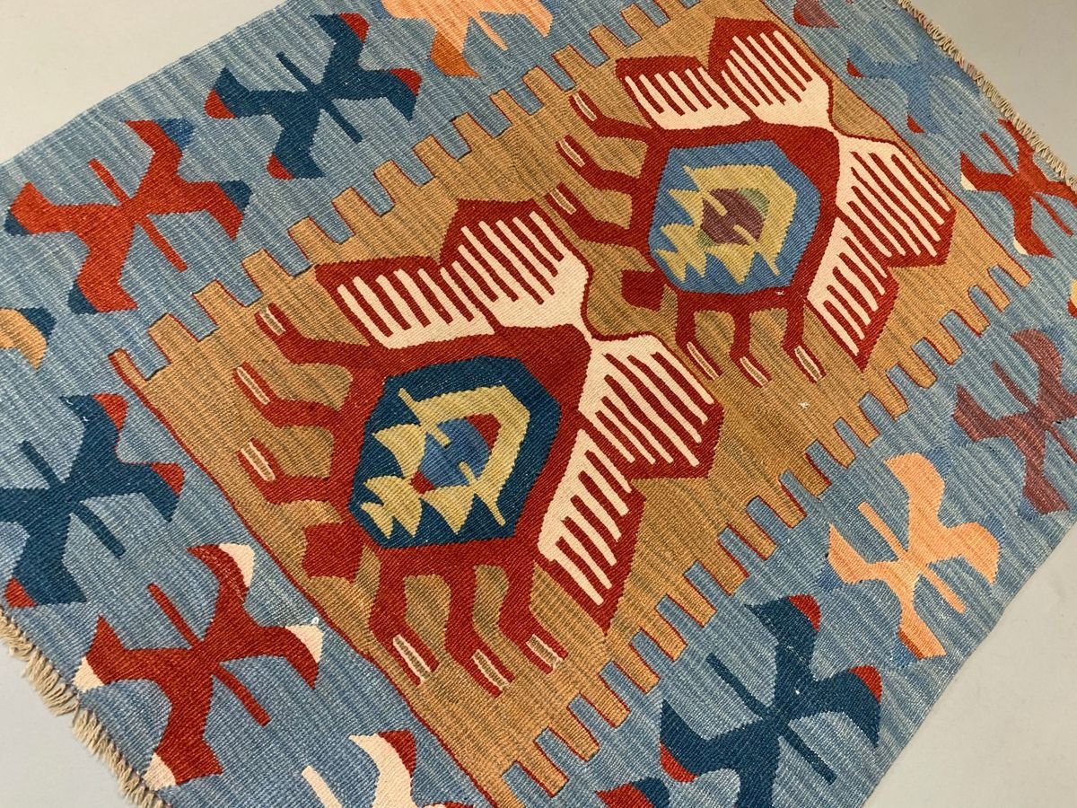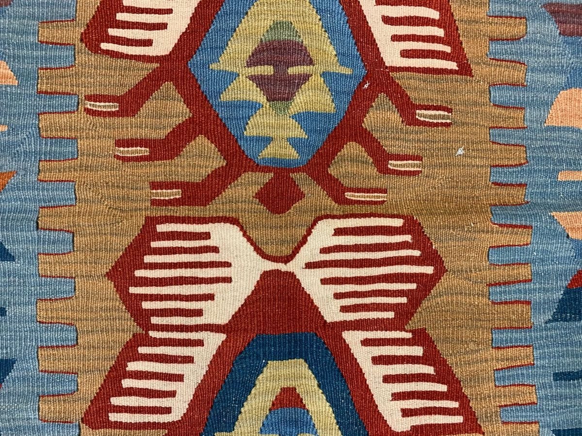 Tappeto Kilim vintage piccolo in lana rossa, blu e marrone, Turchia, anni '50