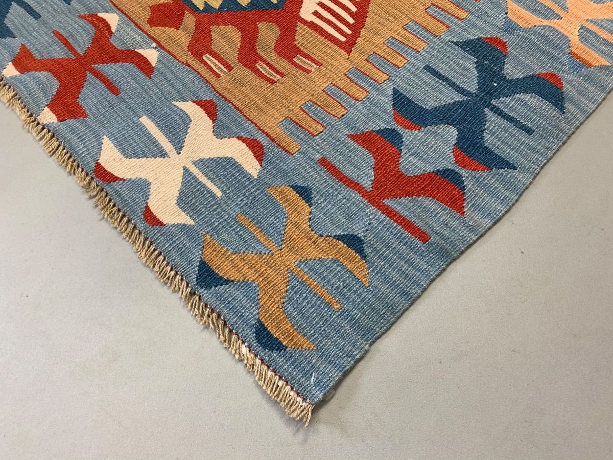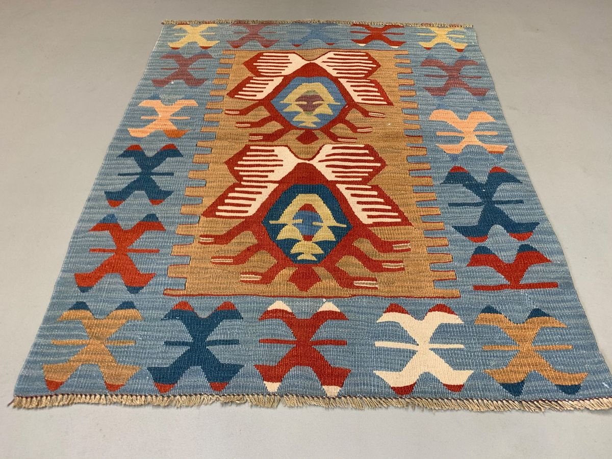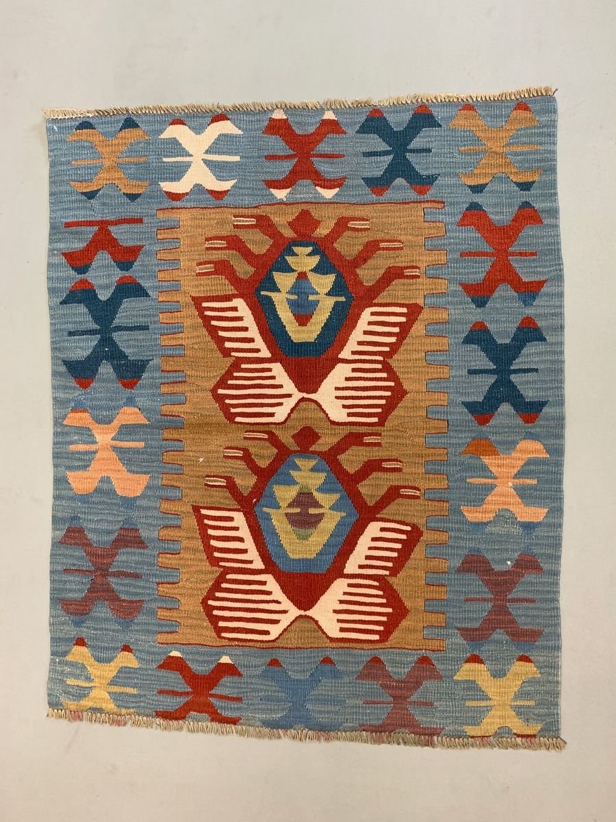Tappeto Kilim vintage piccolo in lana rossa, blu e marrone, Turchia, anni '50