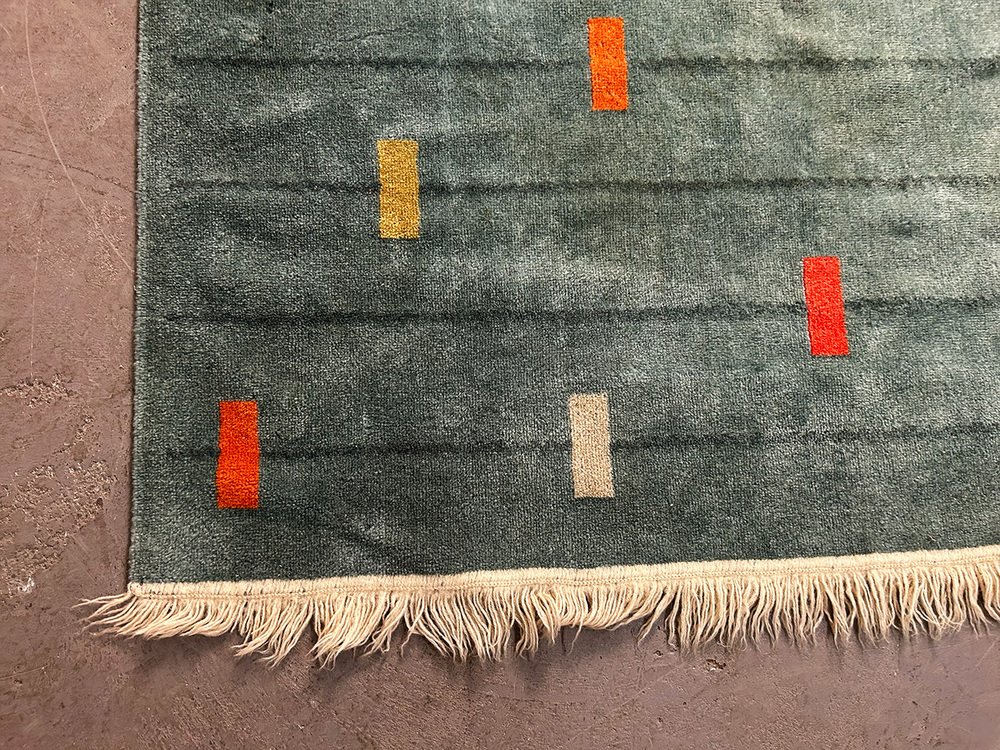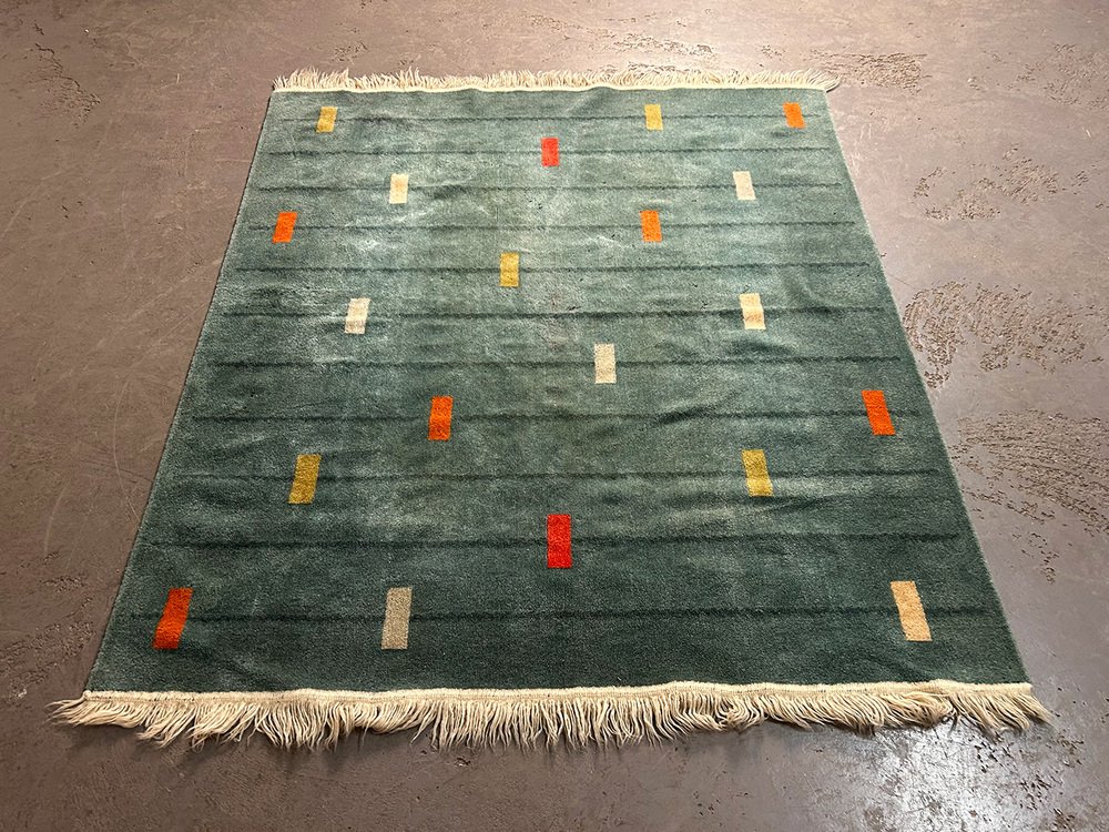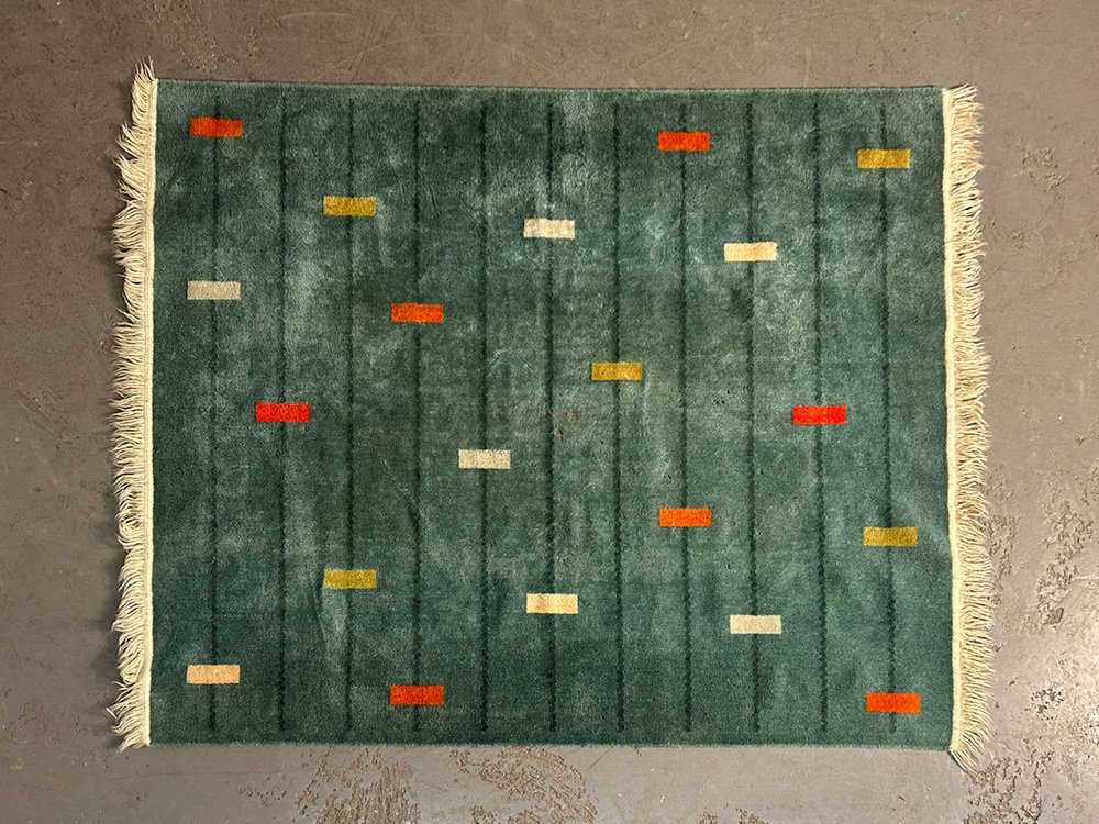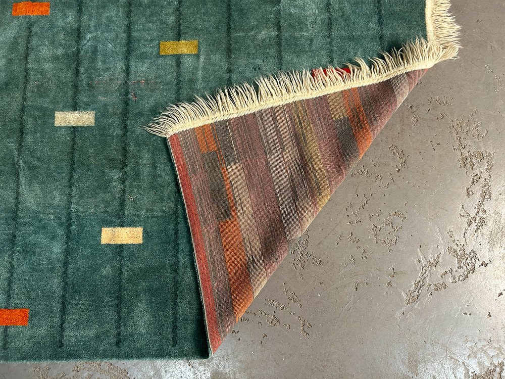 wool rug with a marvelously modern pattern. It has been attributed to the avantgarde department store Metz&Co from ca 1925. As an investor, Metz&Co was one of the most important catalysts of modernism in the Netherlands. Gerrit Rietveld, designed 75 pieces for Metz&Co. Bart van der Leck, for whom colors had a spritual power, created colorspectrums, interiors and rugs for the store in Amsterdam. Sonia Delaunay took fabric as the medium for her and created more than 150 works for Metz&Co, including rugs.
