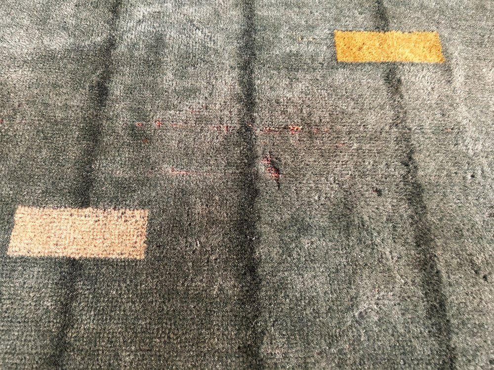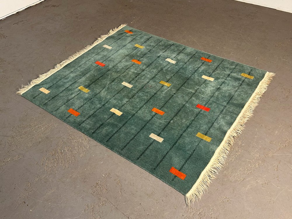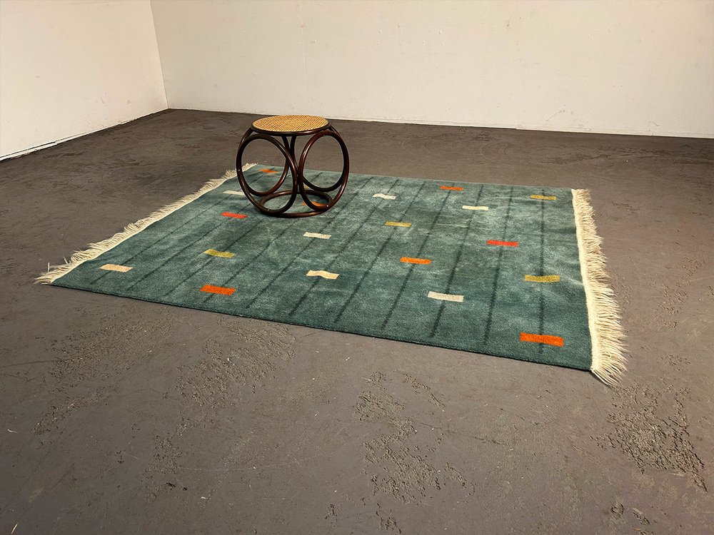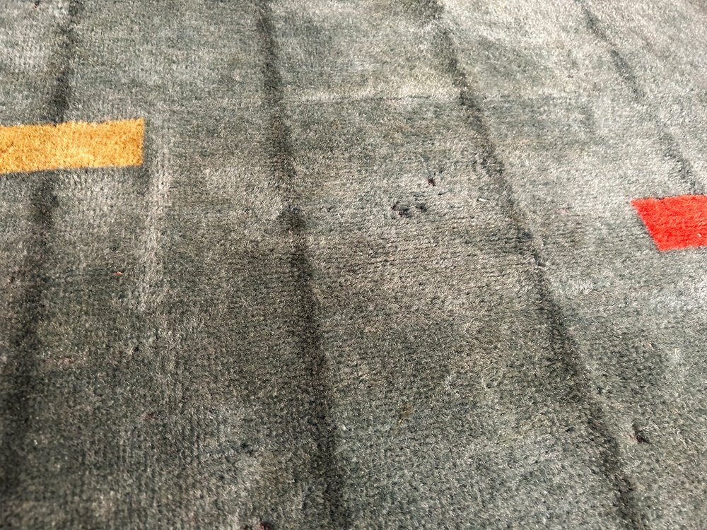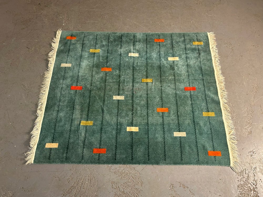 wool rug with a marvelously modern pattern. It has been attributed to the avantgarde department store Metz&Co from ca 1925. As an investor, Metz&Co was one of the most important catalysts of modernism in the Netherlands. Gerrit Rietveld, designed 75 pieces for Metz&Co. Bart van der Leck, for whom colors had a spritual power, created colorspectrums, interiors and rugs for the store in Amsterdam. Sonia Delaunay took fabric as the medium for her and created more than 150 works for Metz&Co, including rugs.