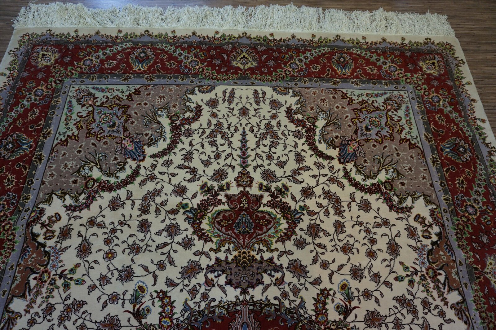 The intricate design features a central medallion surrounded by detailed floral motifs and geometric patterns.