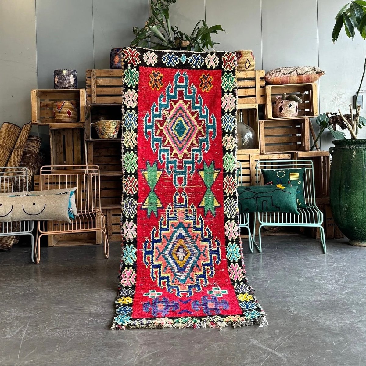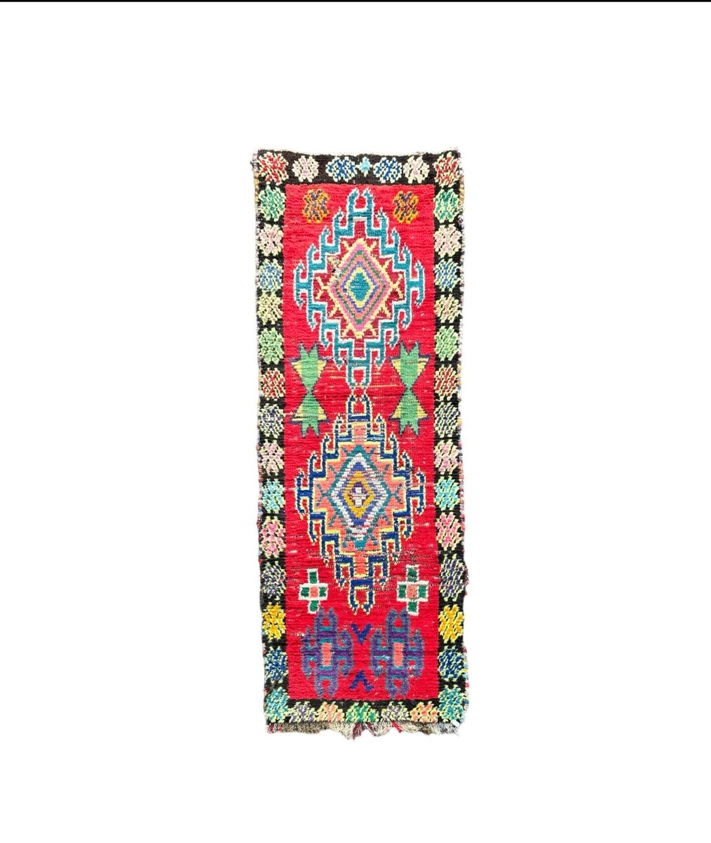 La bellezza del tappeto Boucheruite risiede nel suo design audace e accattivante. Gli intricati motivi geometrici, che simboleggiano antiche tradizioni e credenze, sono abilmente incorporati nel tessuto. Questi motivi, meticolosamente tessuti a mano, creano un capolavoro di grande impatto visivo che aggiungerà calore e carattere a qualsiasi spazio abitativo.