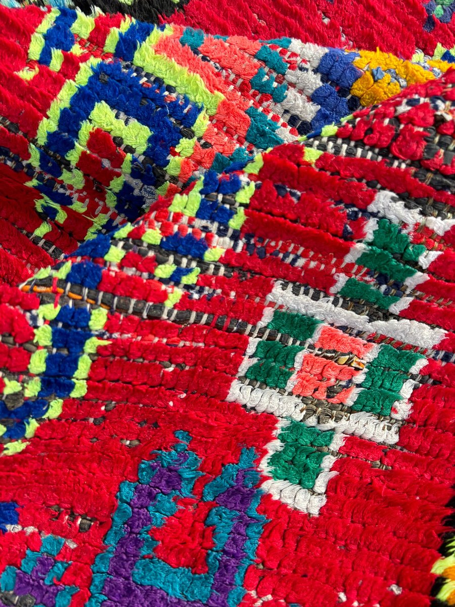 Ogni tappeto racconta una storia unica, intessuta di motivi intricati e colori vivaci. Realizzato in tessuto riciclato e cotone ecologico, questo tappeto mette in mostra le tradizionali tecniche di tessitura a mano tramandate da generazioni. Il risultato è un capolavoro unico che incarna l'essenza della cultura berbera.