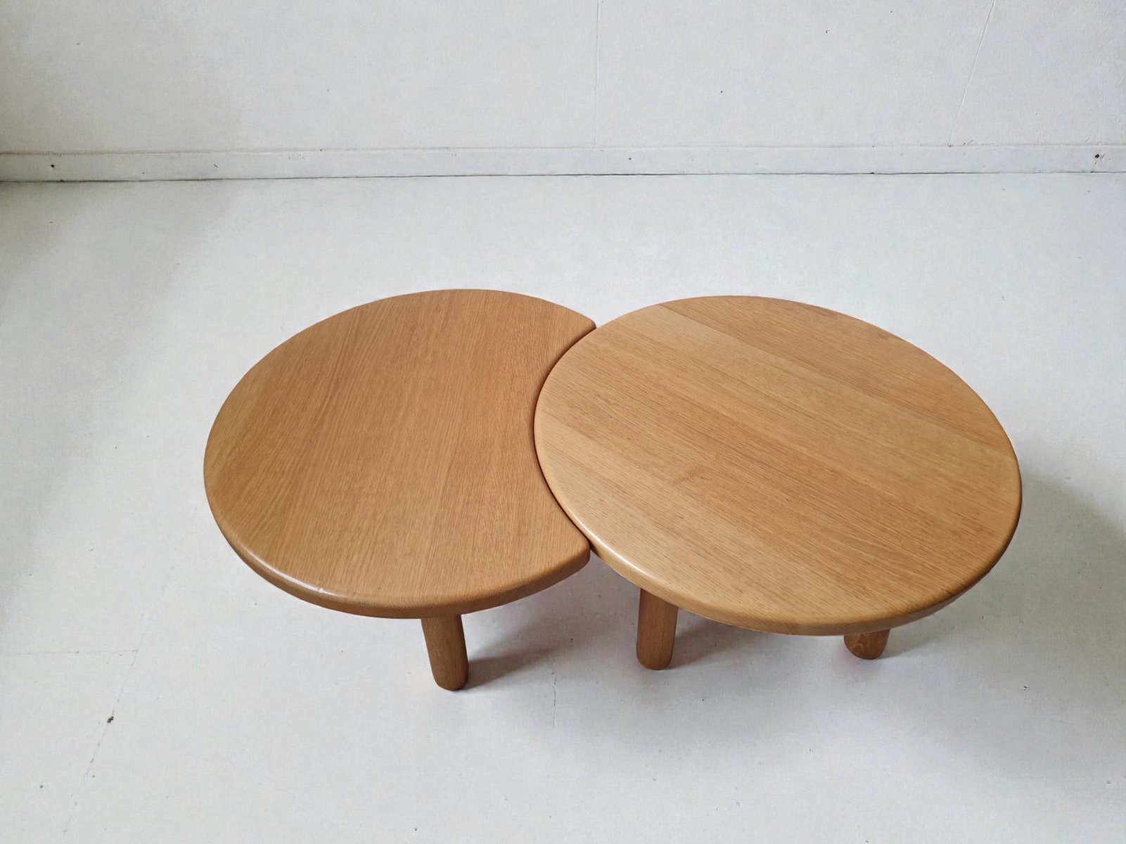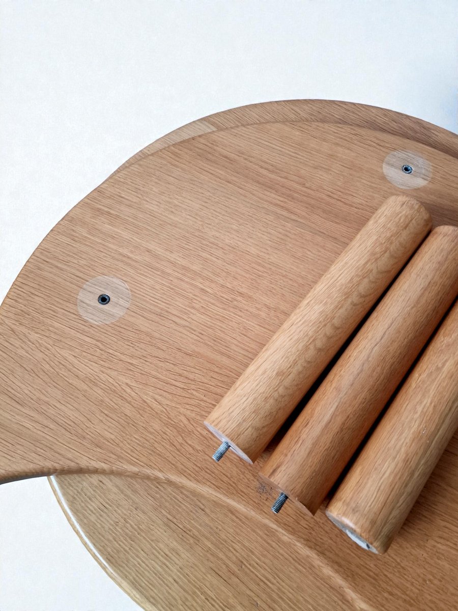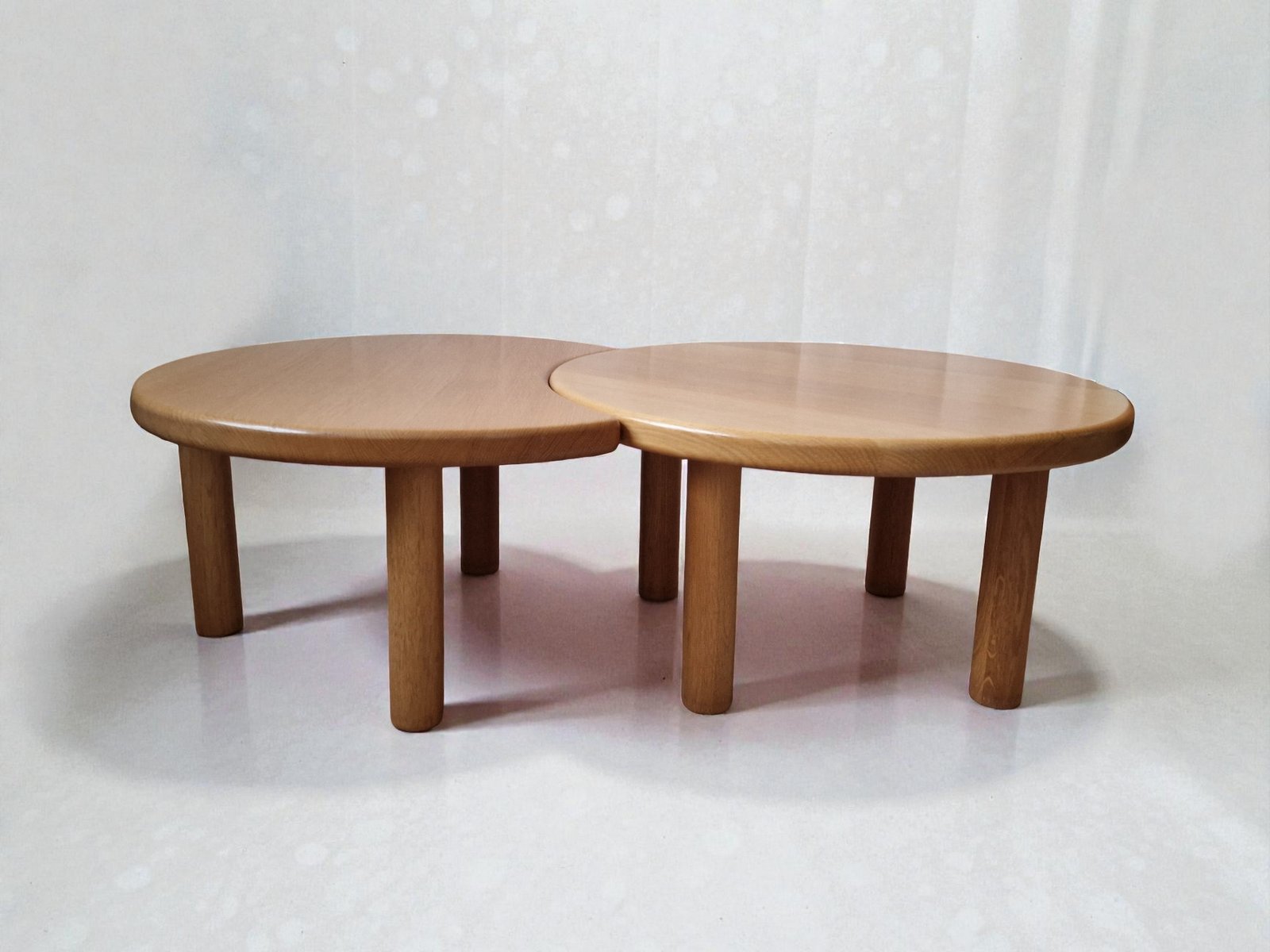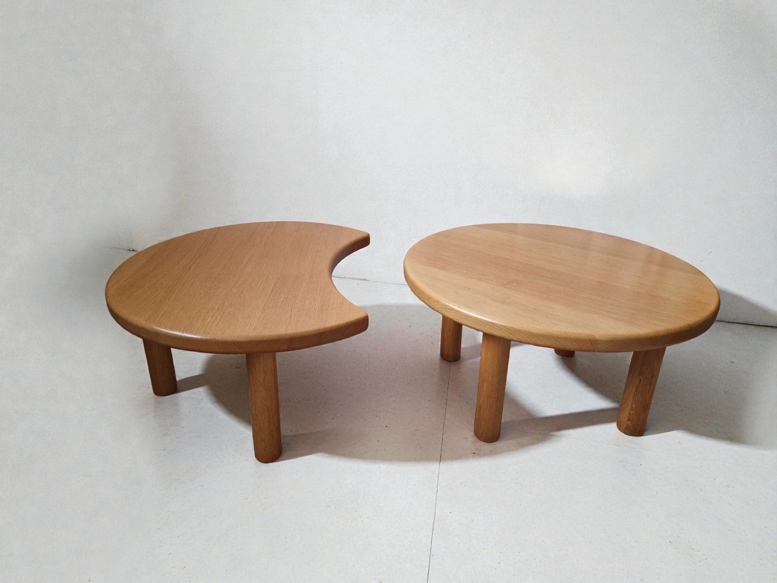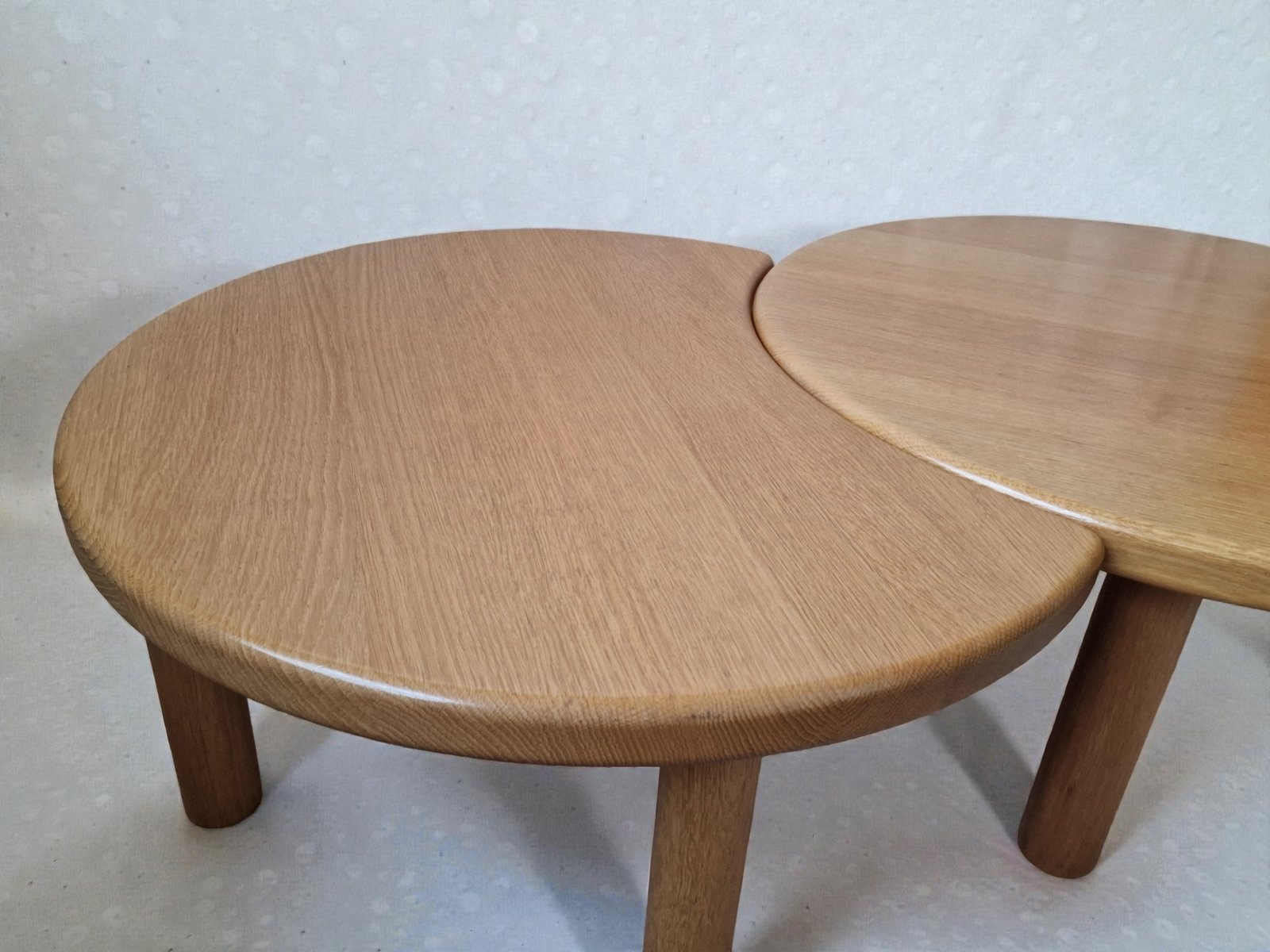 Set di tavolini da caffè del rinomato ebanista REDUREAU, che ha chiuso i battenti nel 2017. Questa azienda era famosa per le sue creazioni artigianali. La chiusura del marchio nel 2017 ha reso i suoi pezzi molto ricercati. Il set è realizzato in rovere massello e pesa 25 kg. Comprende due tavolini: - un tavolino rotondo, - un tavolino a mezzaluna complementare progettato per essere incastrato o posizionato liberamente.