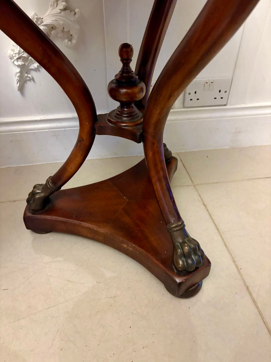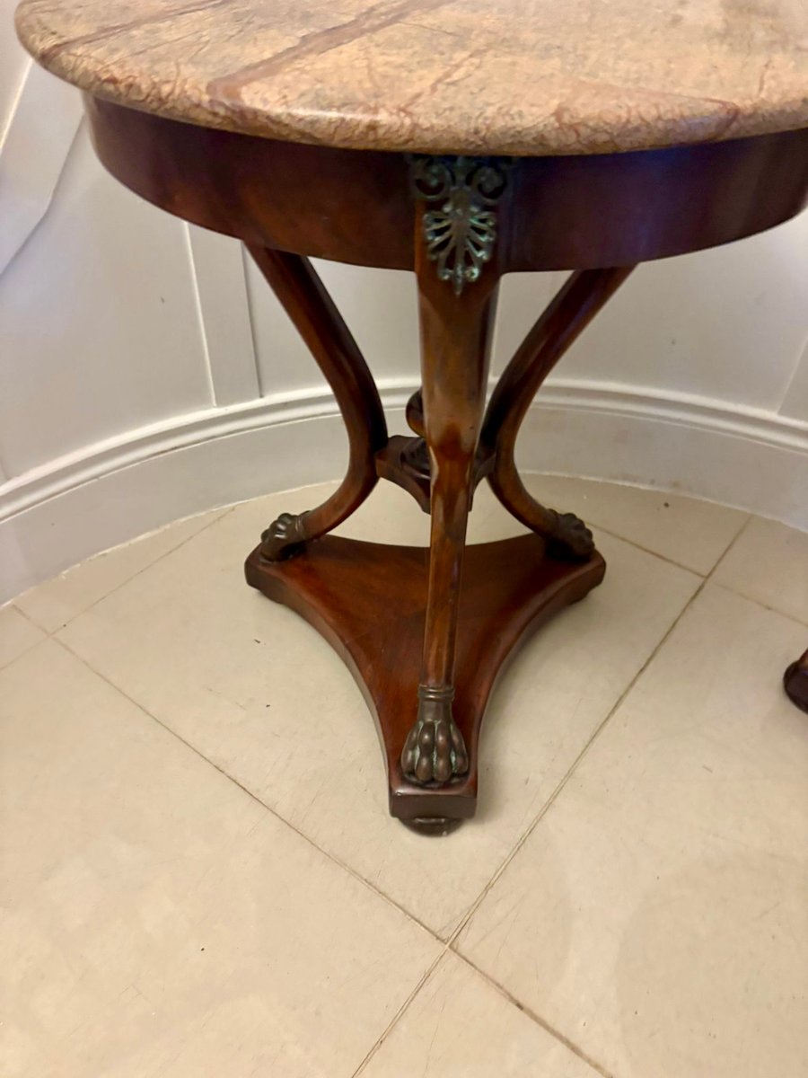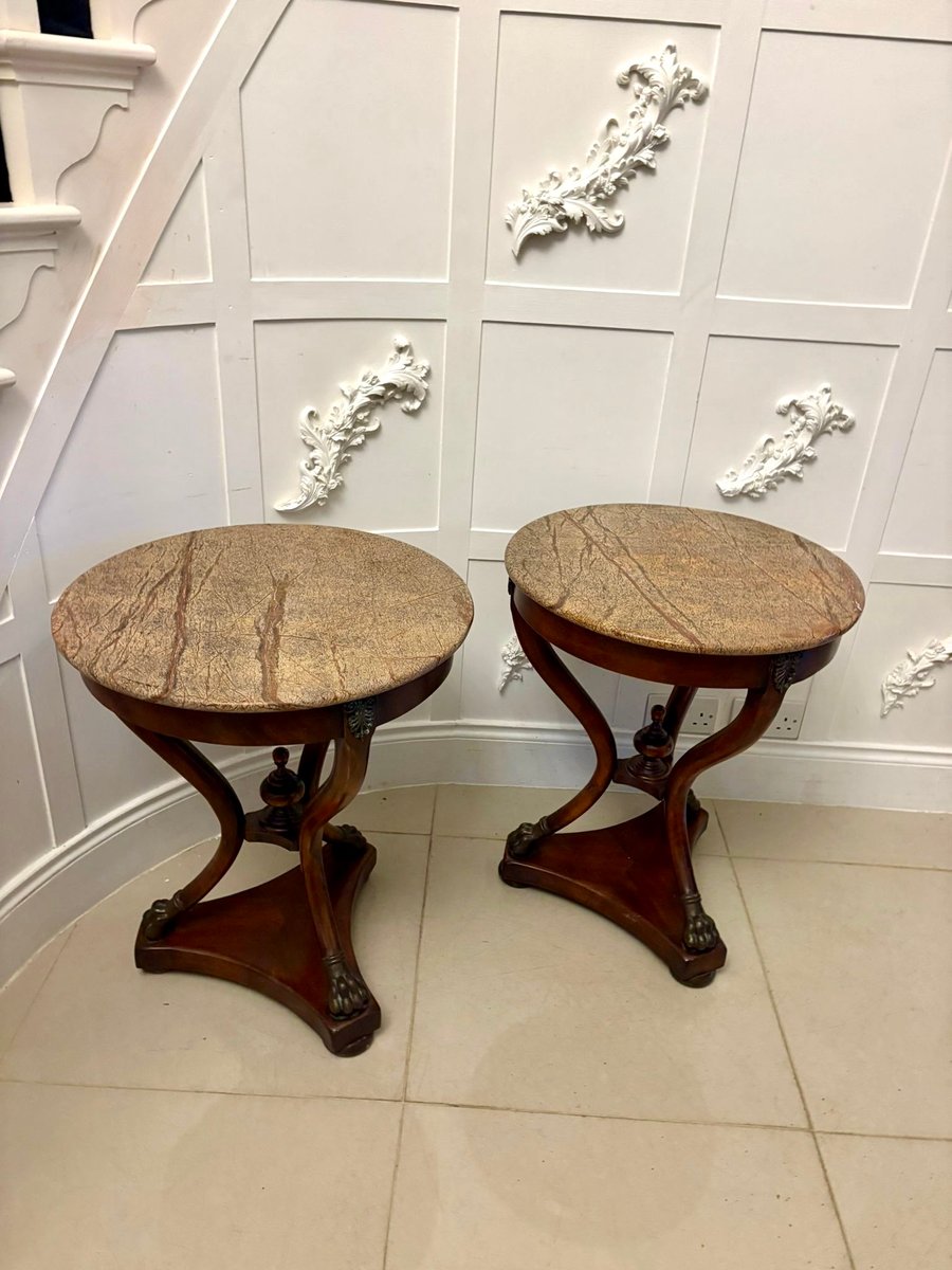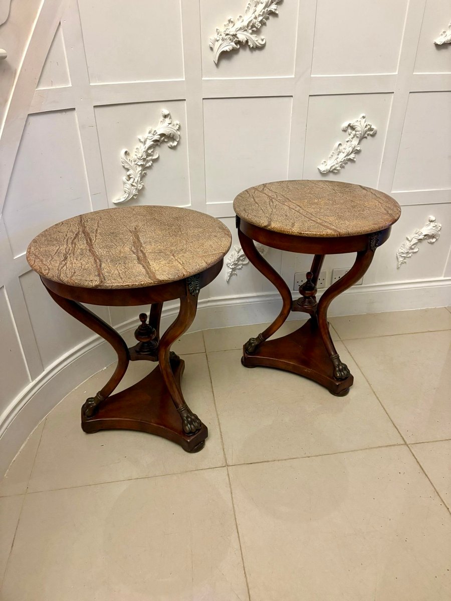 Supported on three gracefully shaped mahogany columns, the tables are united by a finely turned central finial. The bases are beautifully formed in a scrolling triangular shape and stand on bold bronze paw feet, giving the pair a strong classical presence.