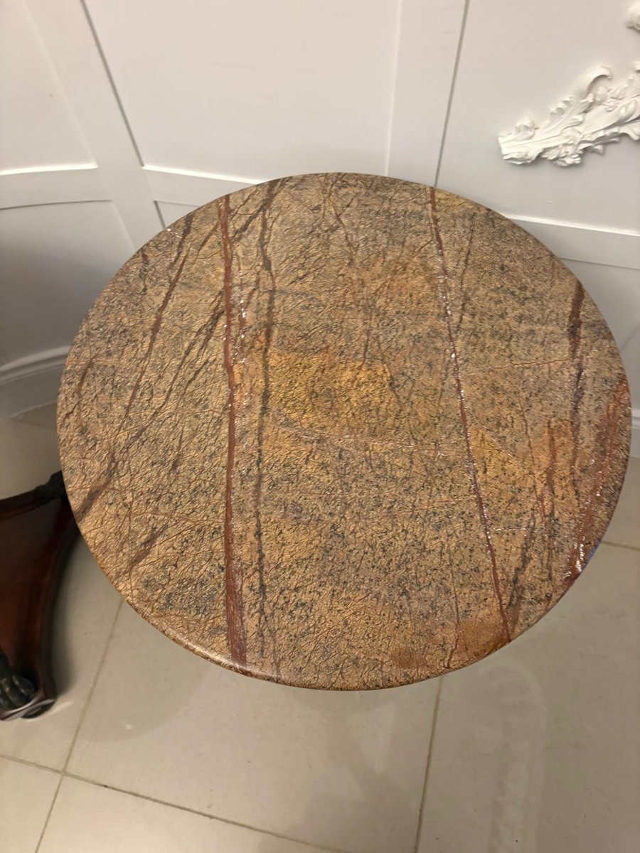 A superb pair of antique Edwardian French marble-top gueridon side / lamp tables of exceptional quality and elegance. Each table features a beautifully figured circular marble top with striking natural veining in warm earthy tones, adding wonderful depth and character.
