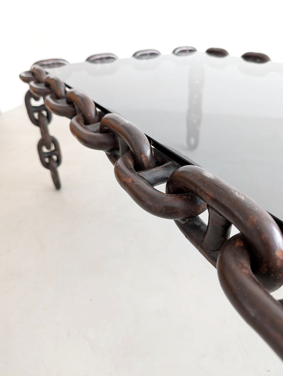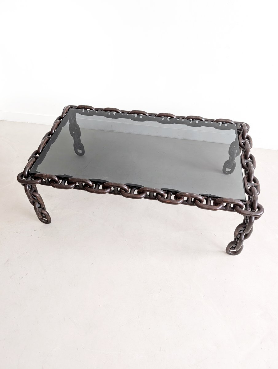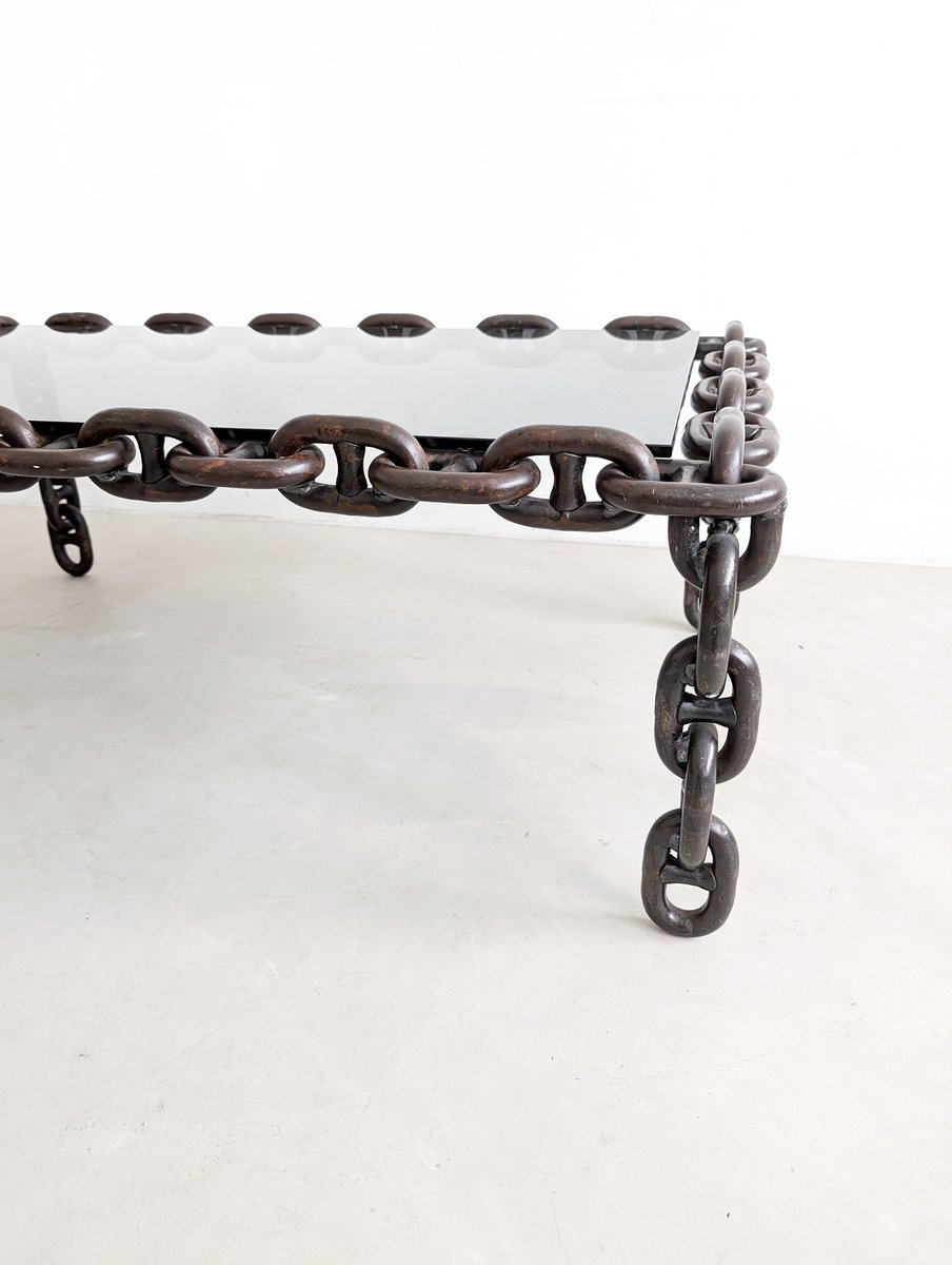 Raro e straordinario tavolino da caffè brutalista a maglie di catena, proveniente direttamente dal Belgio degli anni Settanta. Il tavolino presenta un piano in vetro scuro fumé e una pesante e solida base in metallo a maglie di catena. Nel complesso, un oggetto originale e di alta qualità, che si adatterebbe molto bene sia a un interno moderno ed elegante sia a un ambiente caldo e accogliente di metà secolo.