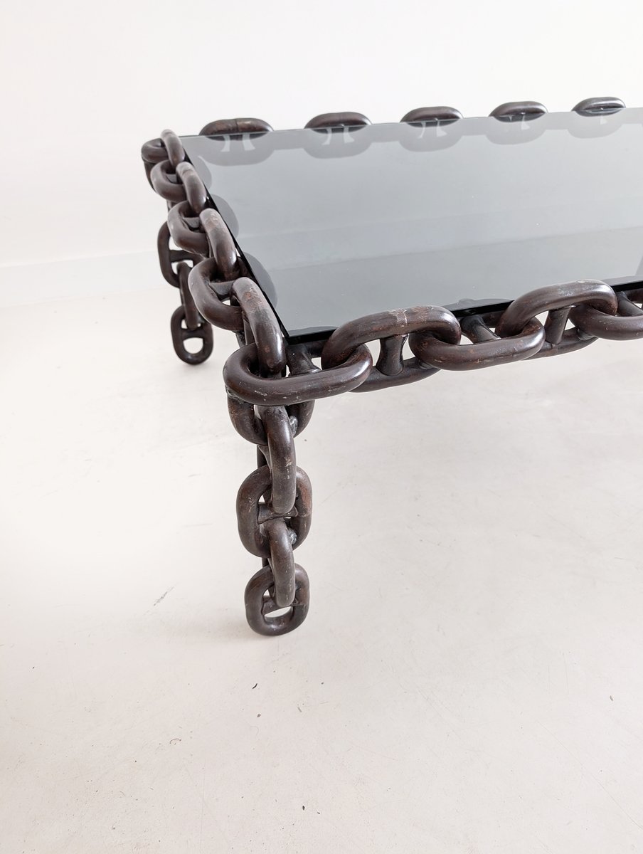 Rare and utterly stunning brutalist chain link coffee table, straight from 1970's Belgium. The coffee table features a dark, smoked glass top and a heavy and solid metal chain link base. All in all, an original and high quality item, which would work very well in a sleek, modern interior as well as in a warm and cosy midcentury setting.
