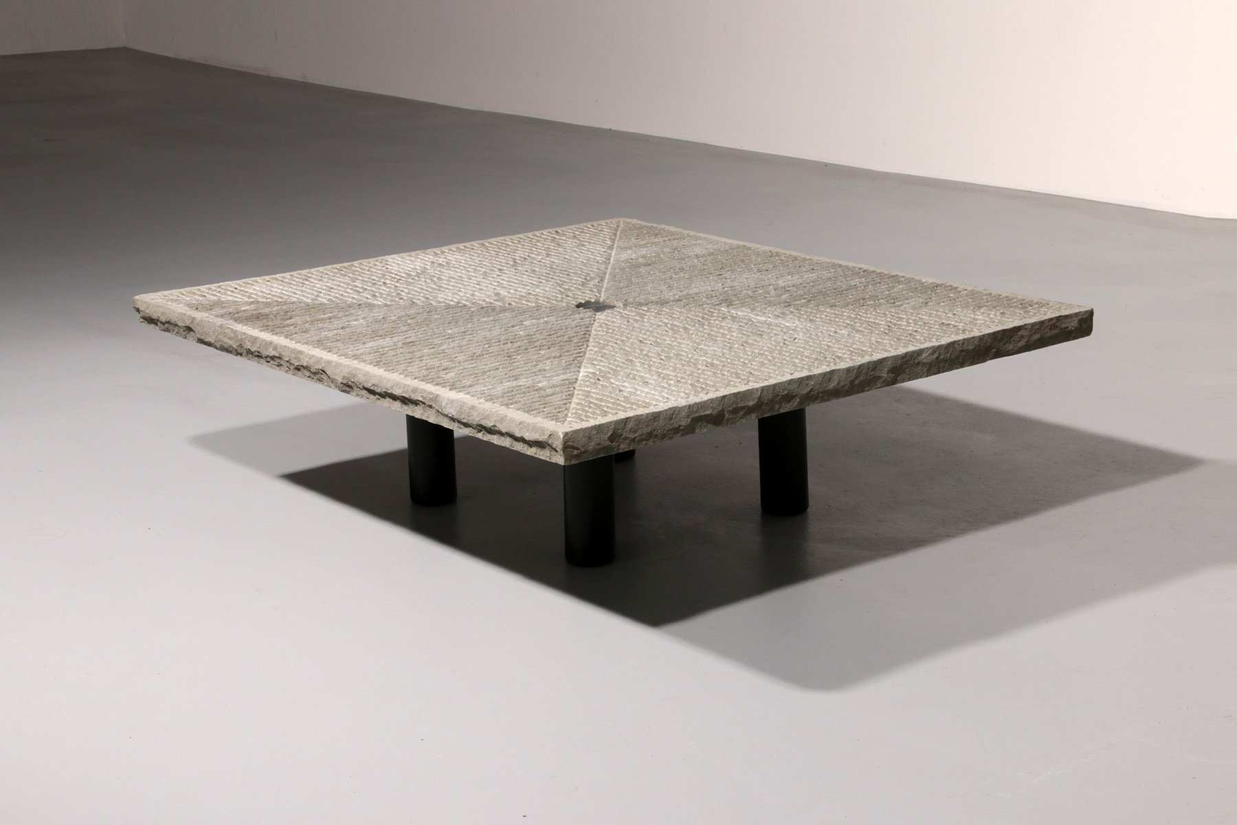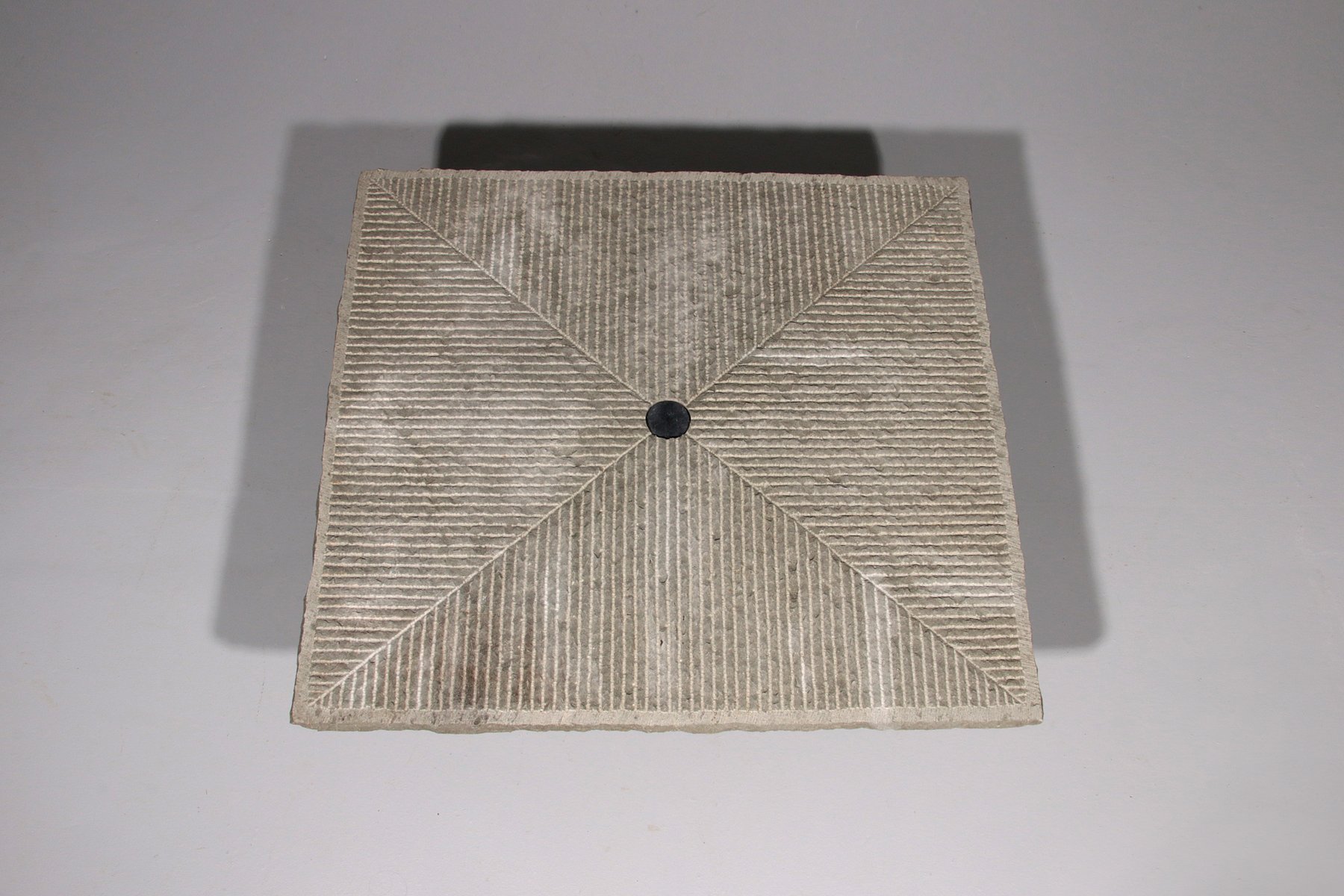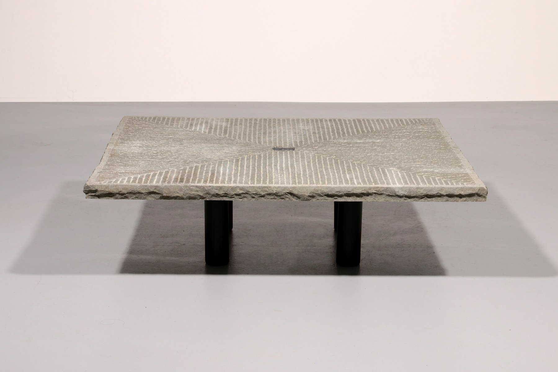 Tavolino scultoreo molto eccentrico e interessante, disegnato dall'architetto Giulio Lazzotti e prodotto da Mageia in Italia nel 1981. Il tavolino è in buone condizioni ed è costituito da una base in acciaio verniciato nero con un piano in macina incisa, con al centro un punto centrale.