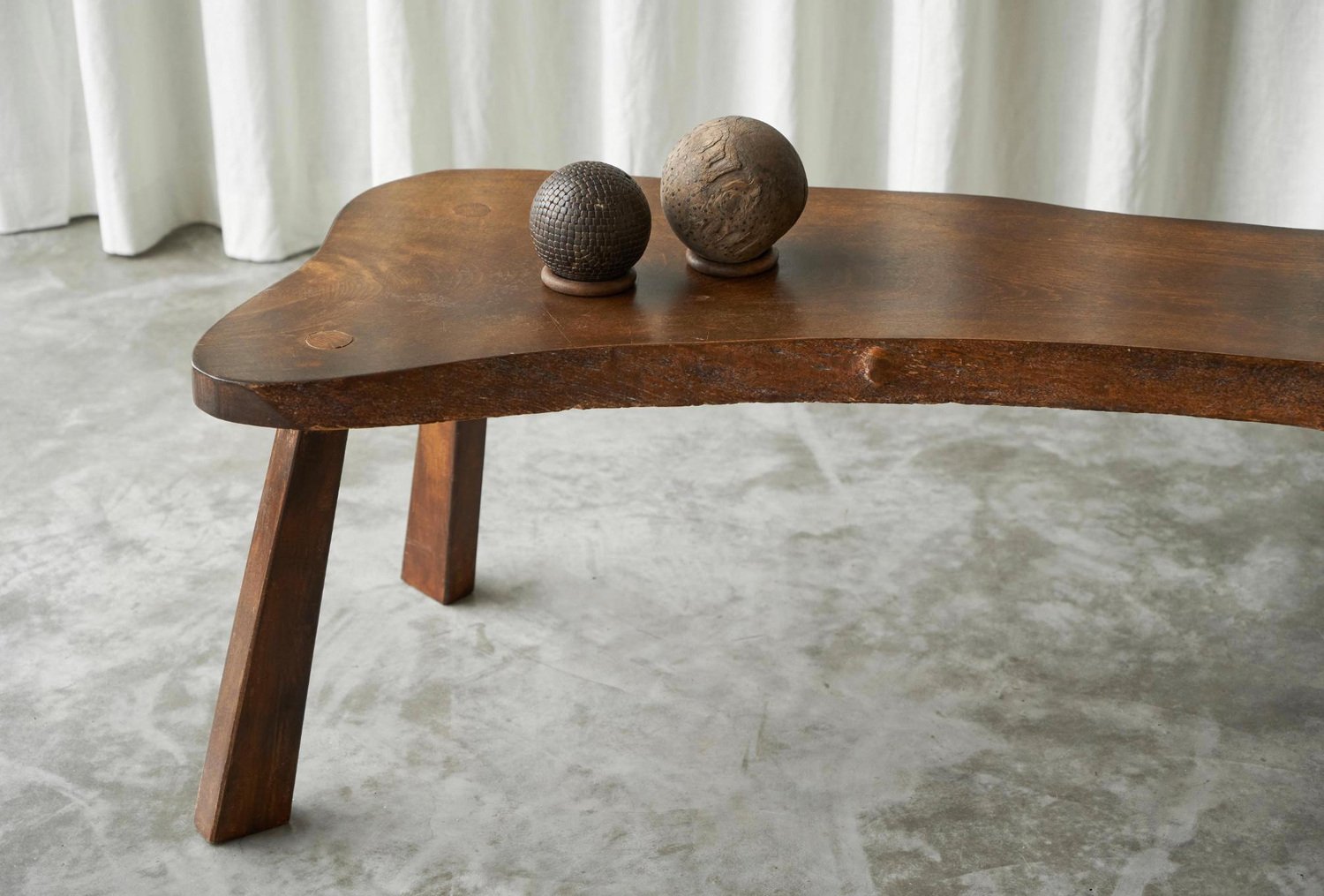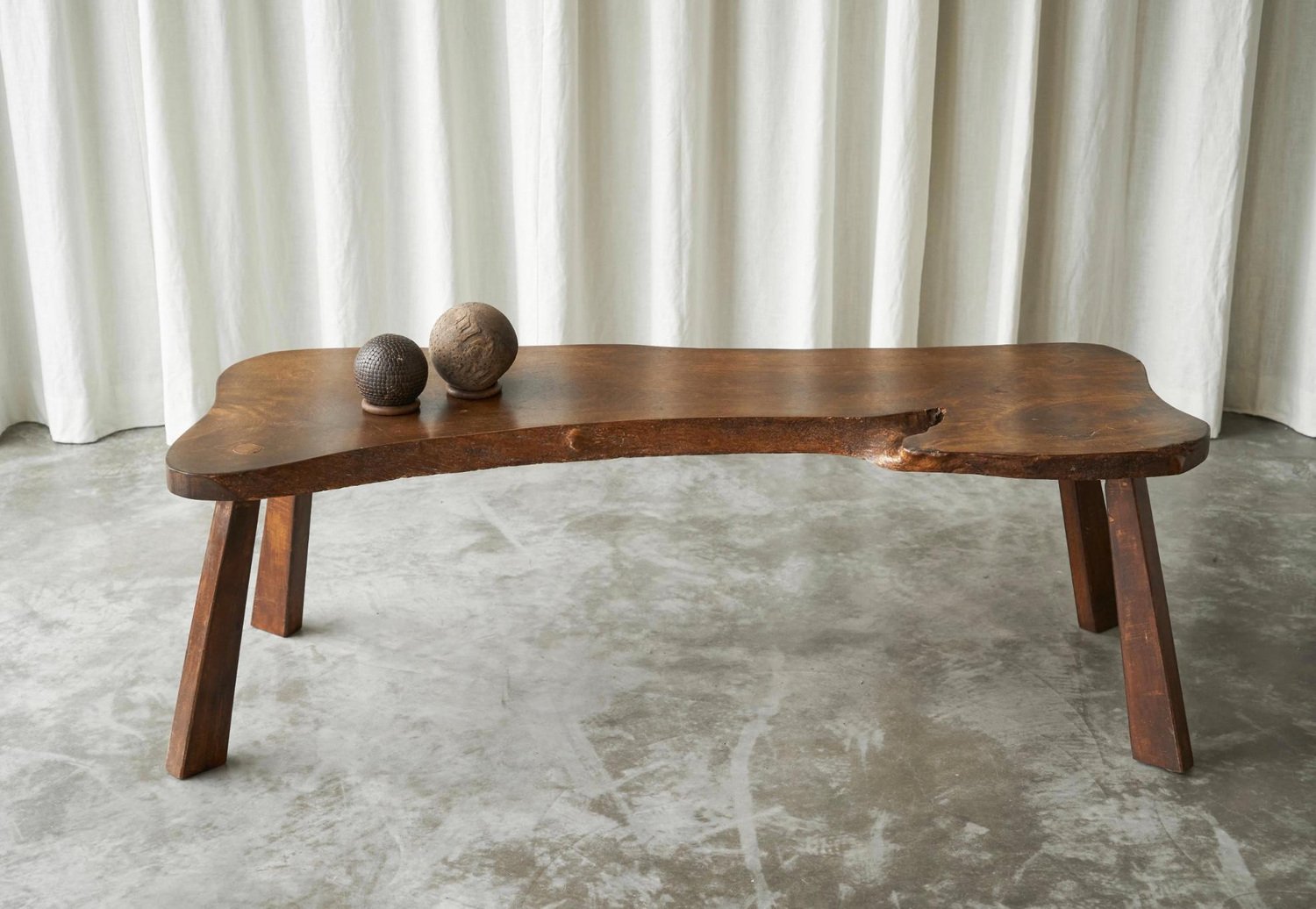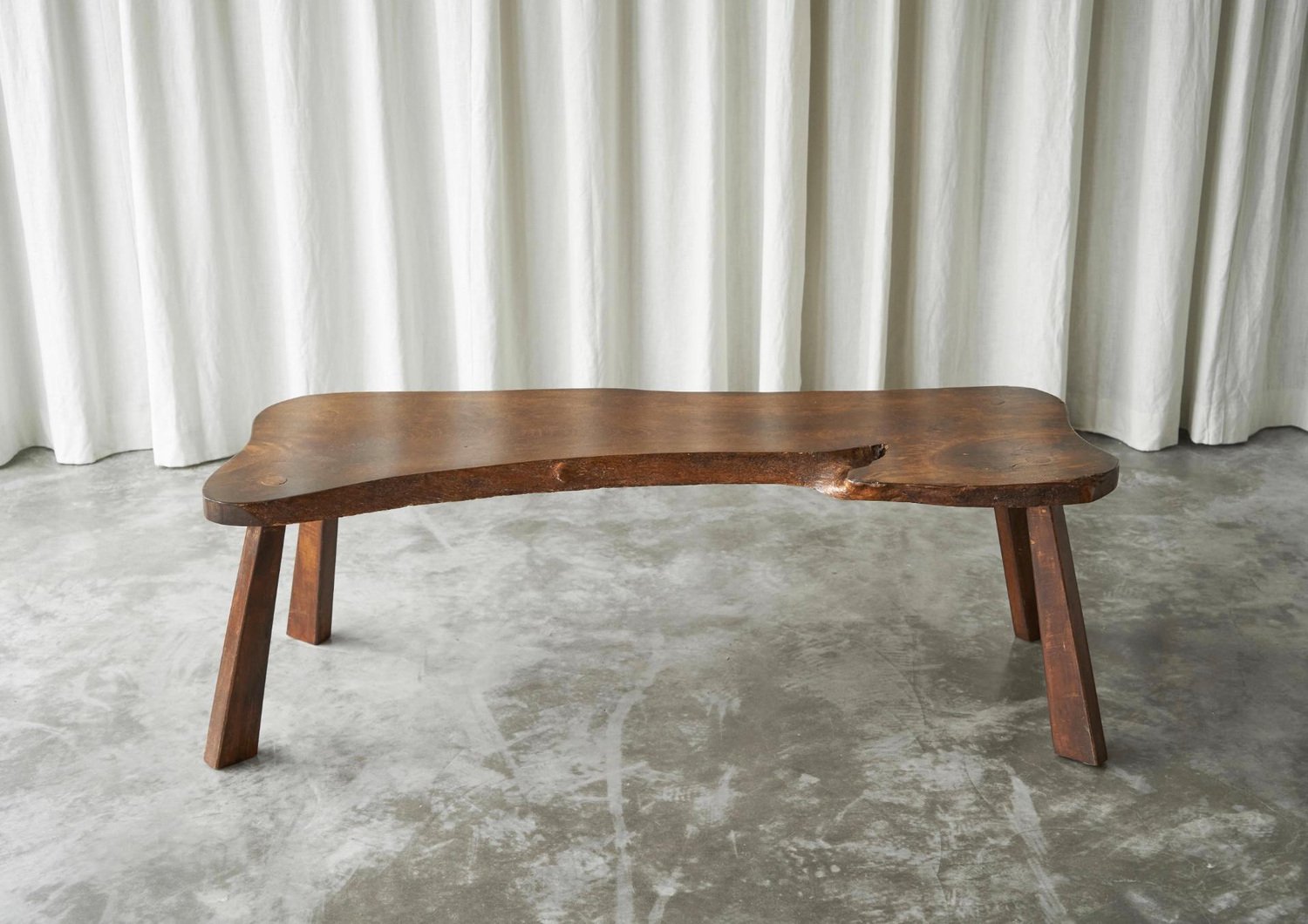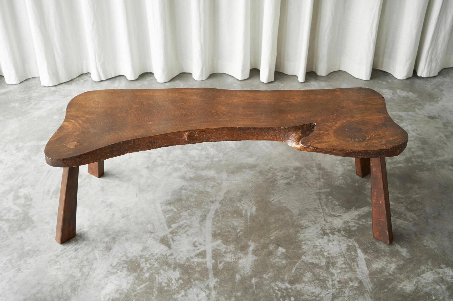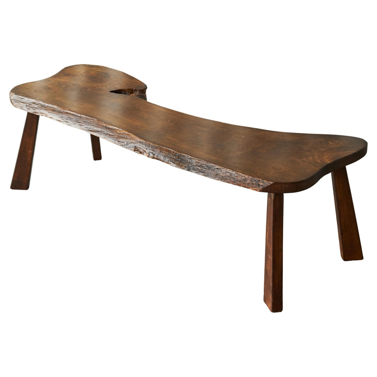 Live Edge Solid Elm Wood Coffee Table, Europe, 1950s. A true gem this is, this live edge coffee table. Made by an unknown woodworker in the 1950s, in beautiful solid Elm wood. Its appearance shows similarity to the work of George Nakashima, one of the greatest woodworkers of the midcentury era. The shape of this one-off is elegant and natural, and the wood grain of the single piece top is just gorgious. with the warm tone of the wood, it has a friendly and lively character. The tapered legs are positioned slightly angled, giving this table a floating look. It has great proportions, it is well sized yet with a pleasant lightness to it. This piece will combine wonderfully with any modern or contemporary interior.