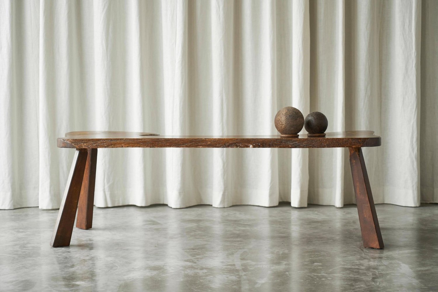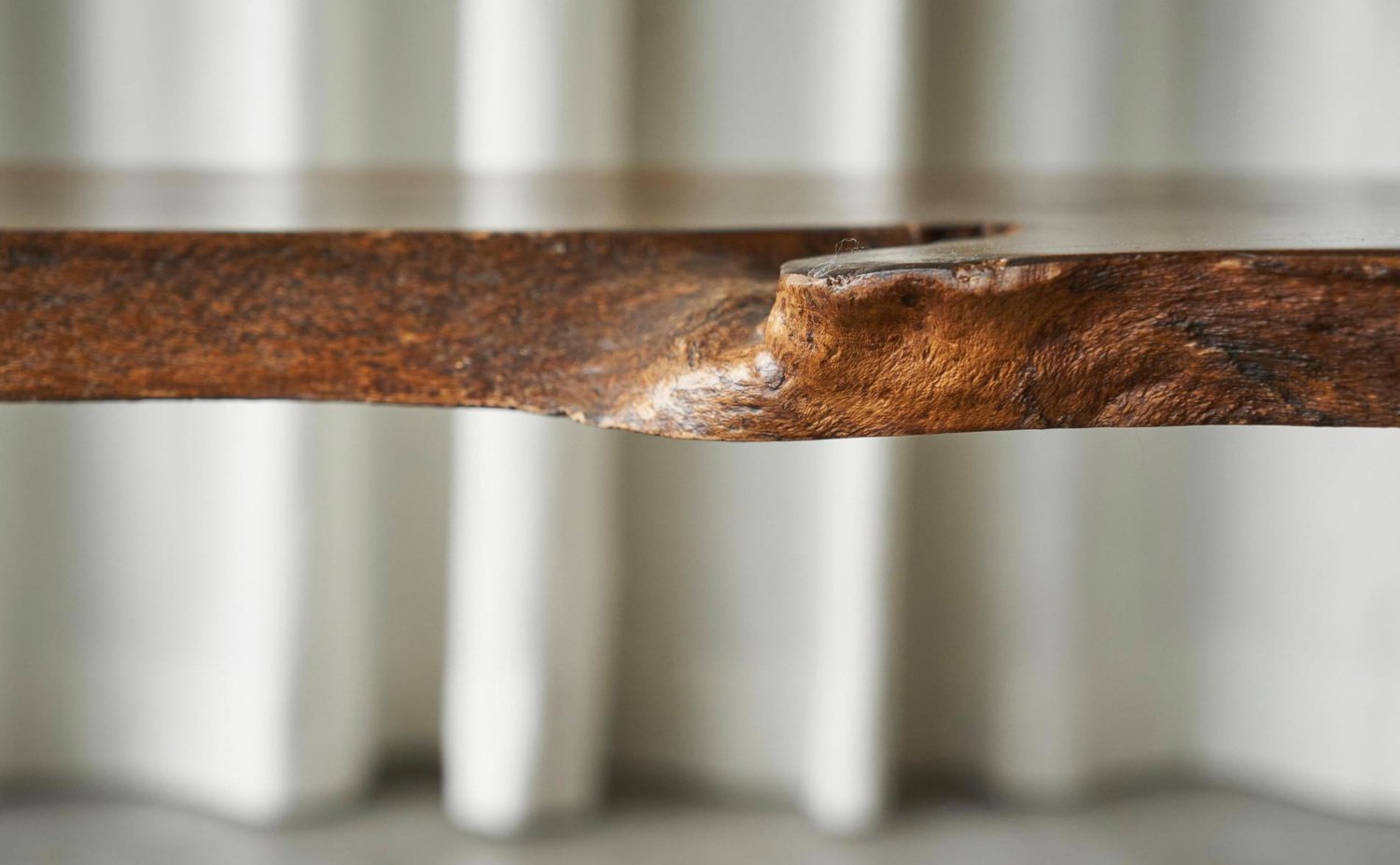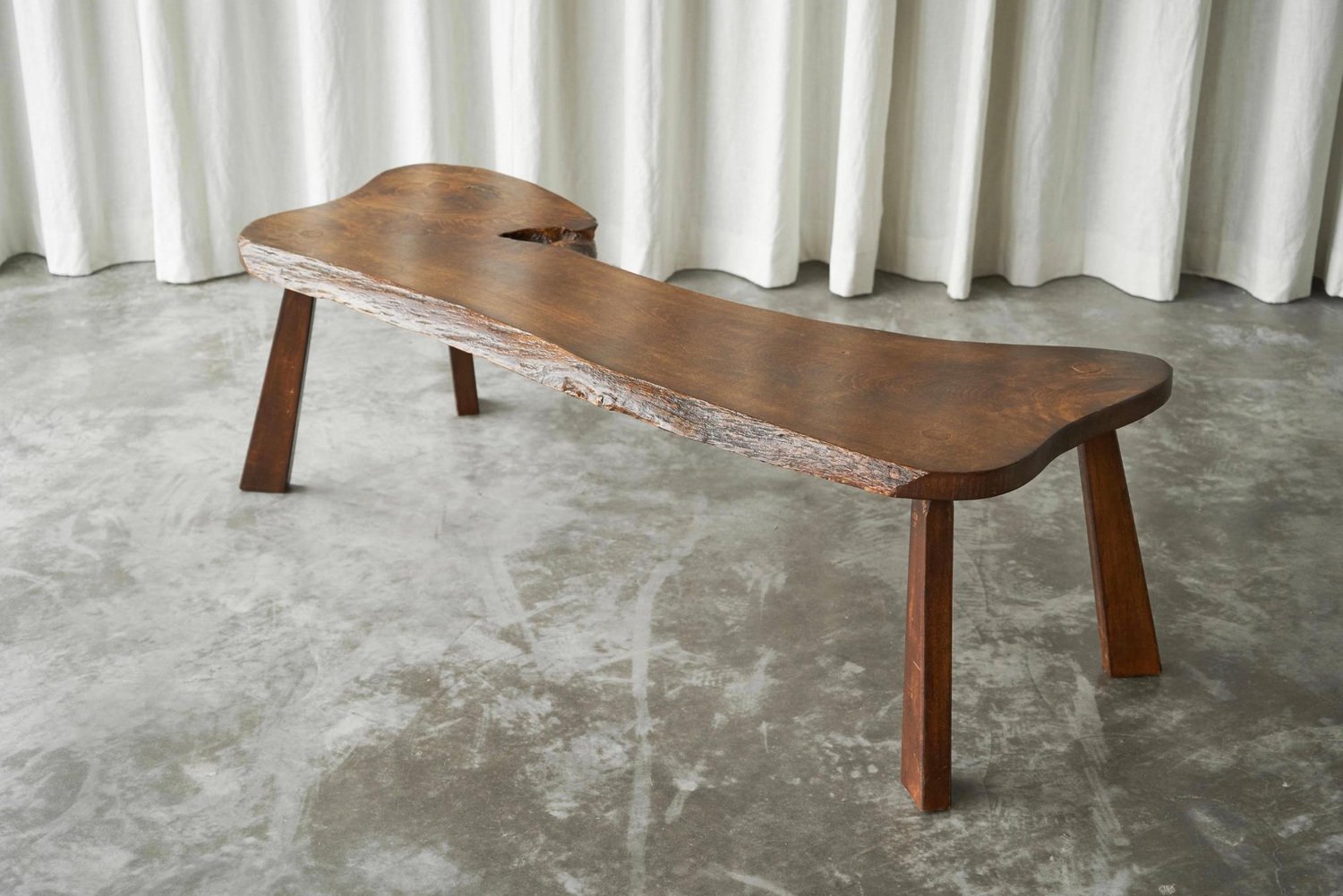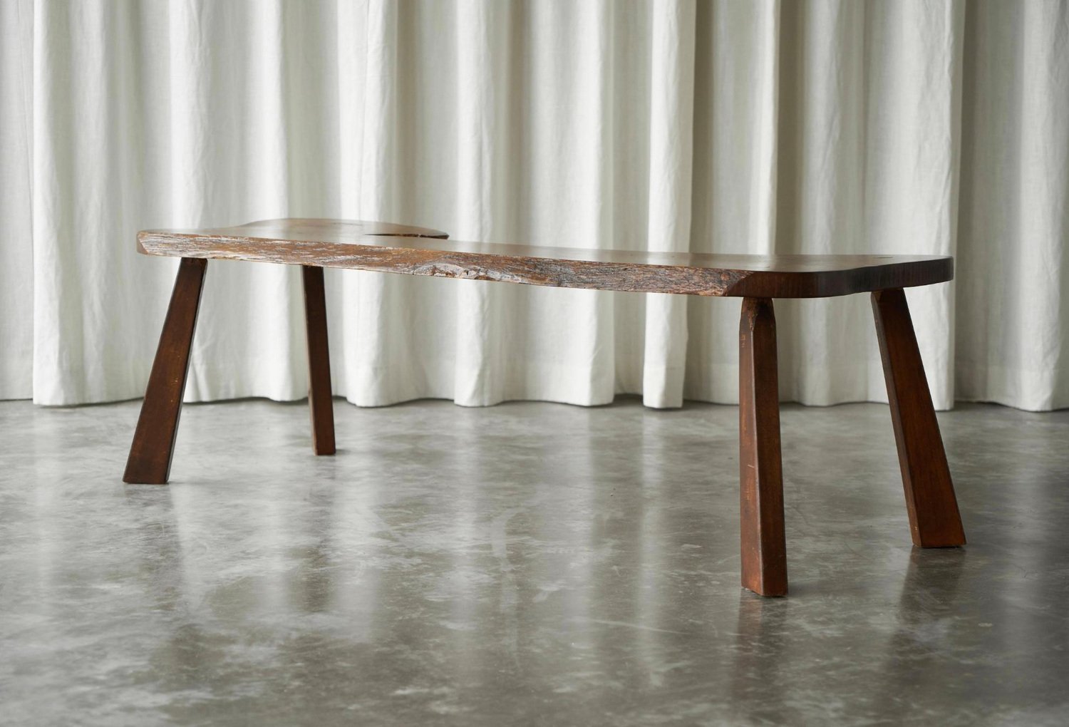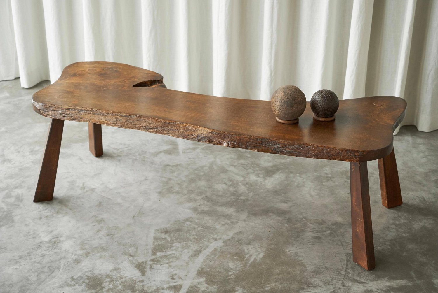 Live Edge Solid Elm Wood Coffee Table, Europe, 1950s. A true gem this is, this live edge coffee table. Made by an unknown woodworker in the 1950s, in beautiful solid Elm wood. Its appearance shows similarity to the work of George Nakashima, one of the greatest woodworkers of the midcentury era. The shape of this one-off is elegant and natural, and the wood grain of the single piece top is just gorgious. with the warm tone of the wood, it has a friendly and lively character. The tapered legs are positioned slightly angled, giving this table a floating look. It has great proportions, it is well sized yet with a pleasant lightness to it. This piece will combine wonderfully with any modern or contemporary interior.