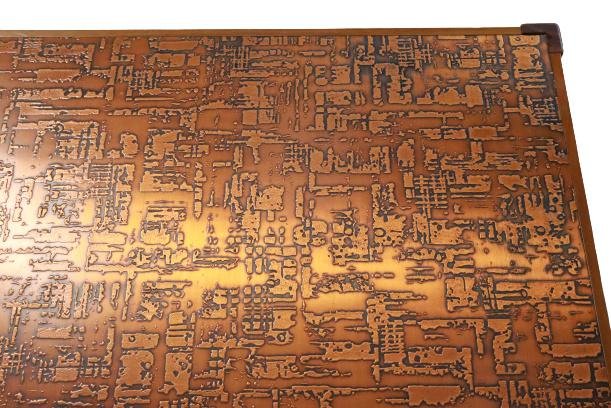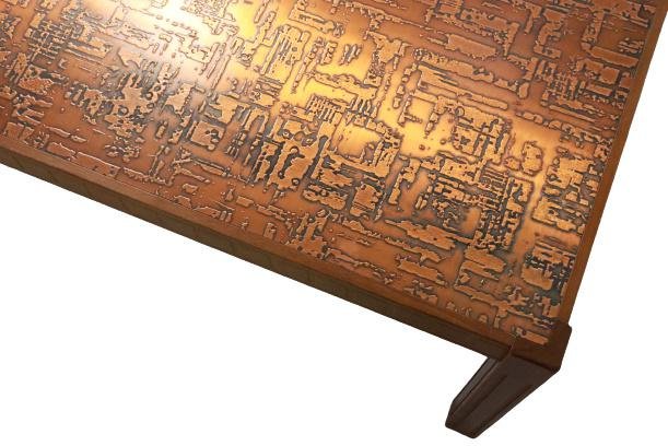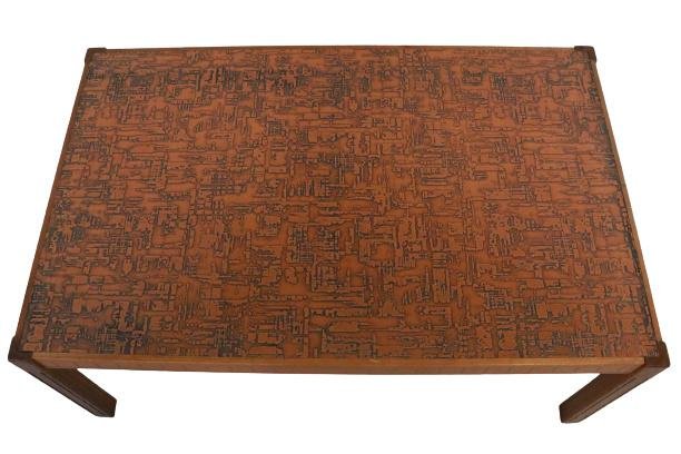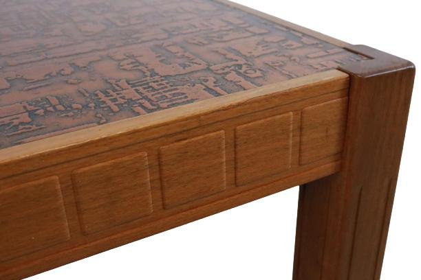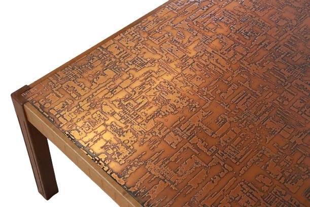 The legs, for example, are beautifully decorated with grooves on the view sides, optically the legs become longer, on the sides of the leaf we see a very beautiful cubes of motif, very refined and beautifully used in wood. The magazine itself is perhaps the most spectacular, on a copper plate a relief and tangible, the choice of materials creates a spectacular effect that also gives an unprecedented beautiful atmosphere through its shine. This, somewhat tendent towards brutalism, coffee table is a real work of art, an exclusive model that comes directly from our network in Sweden. Due to its separate version, it is widely applicable within a range of living styles.