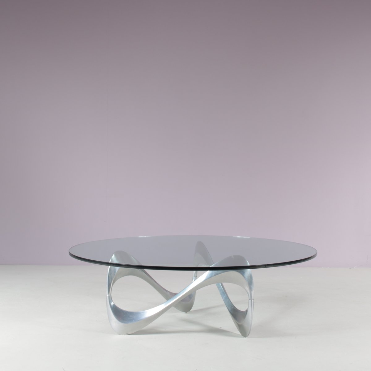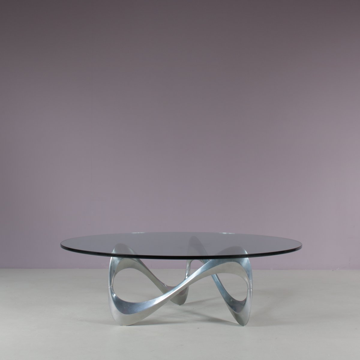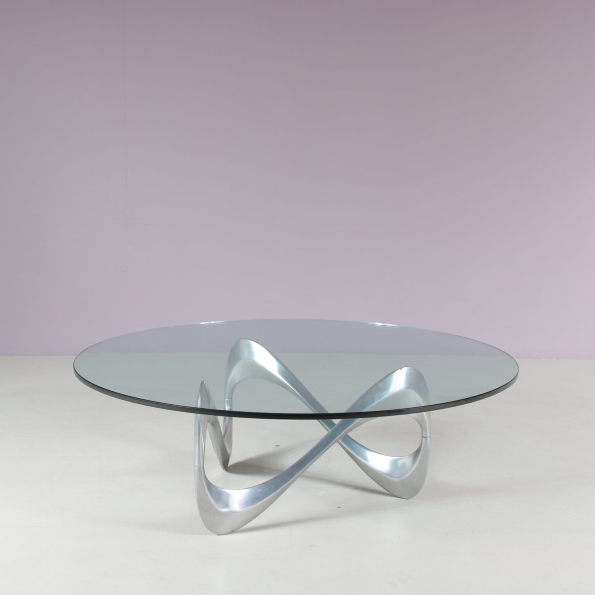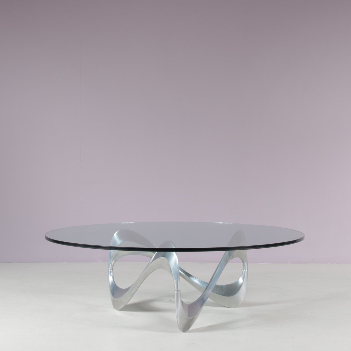 Un iconico tavolino "Snake", disegnato da Knut Hesterberg e prodotto da Ronald Schimdt in Germania intorno al 1970. Questo accattivante tavolino ha una base in metallo cromato, dall'accattivante forma ondulata, a cui deve il suo nome. Il piano rotondo in vetro trasparente enfatizza il design scultoreo della struttura e aggiunge un piacevole senso di lusso al pezzo. Un design molto bello che aggiungerà un bel senso di eleganza agli interni e sarà sicuramente notato da qualsiasi appassionato di design! L'oggetto è in ottime condizioni originali, con lievi segni di usura dovuti all'età e all'uso, e conserva una meravigliosa patina.
