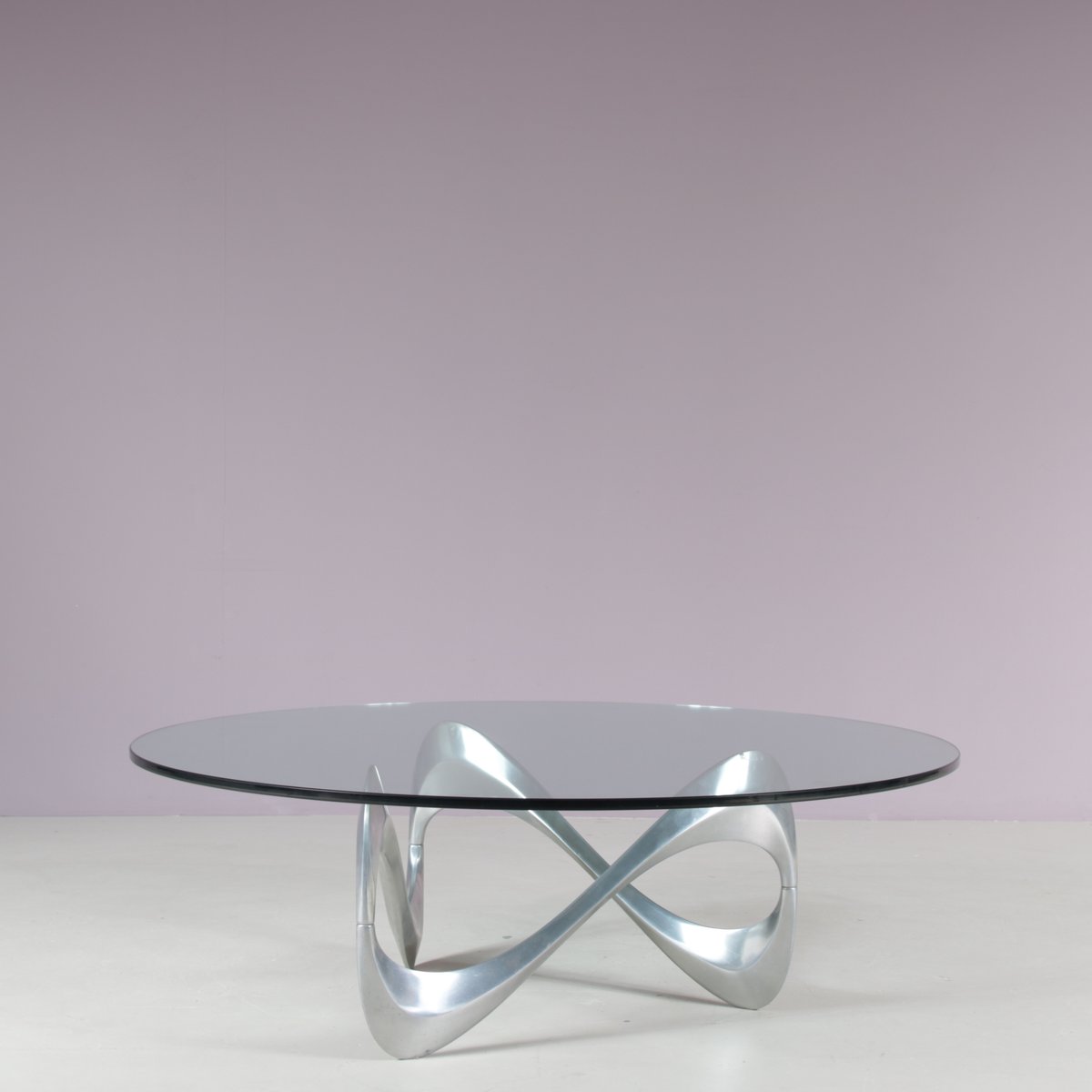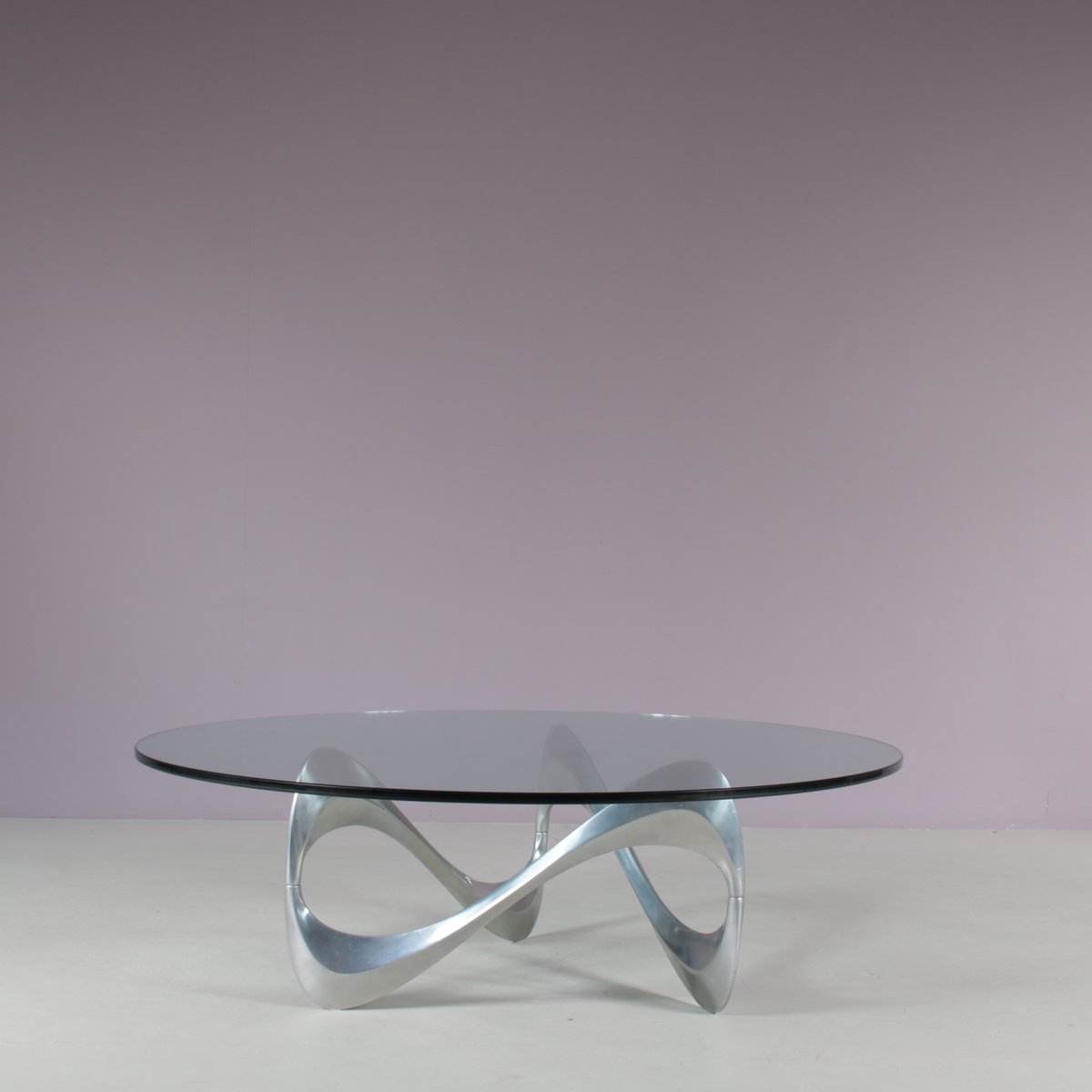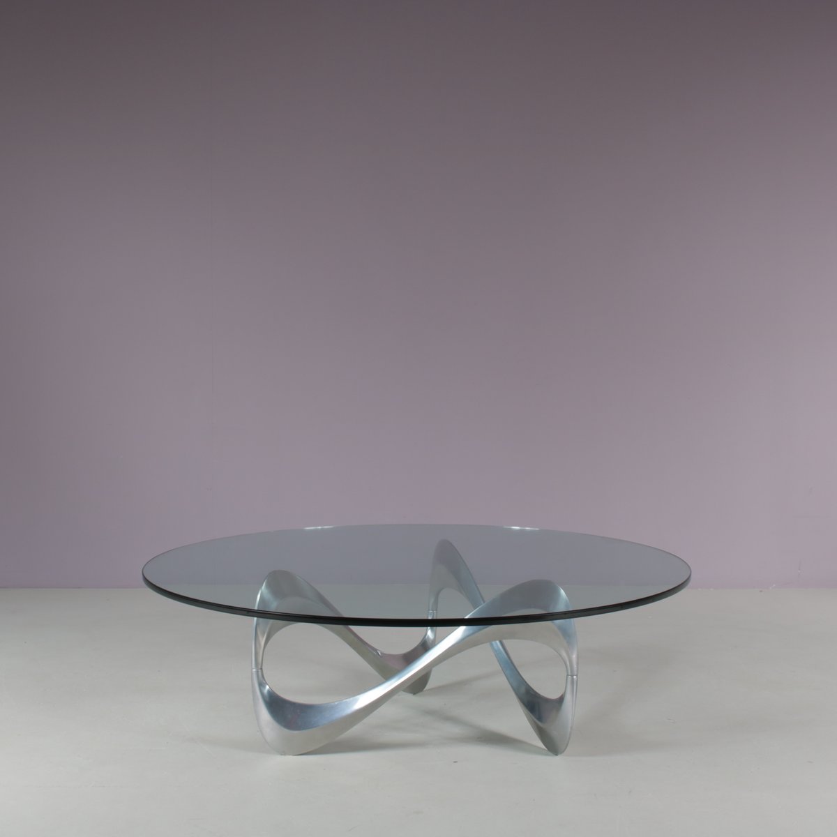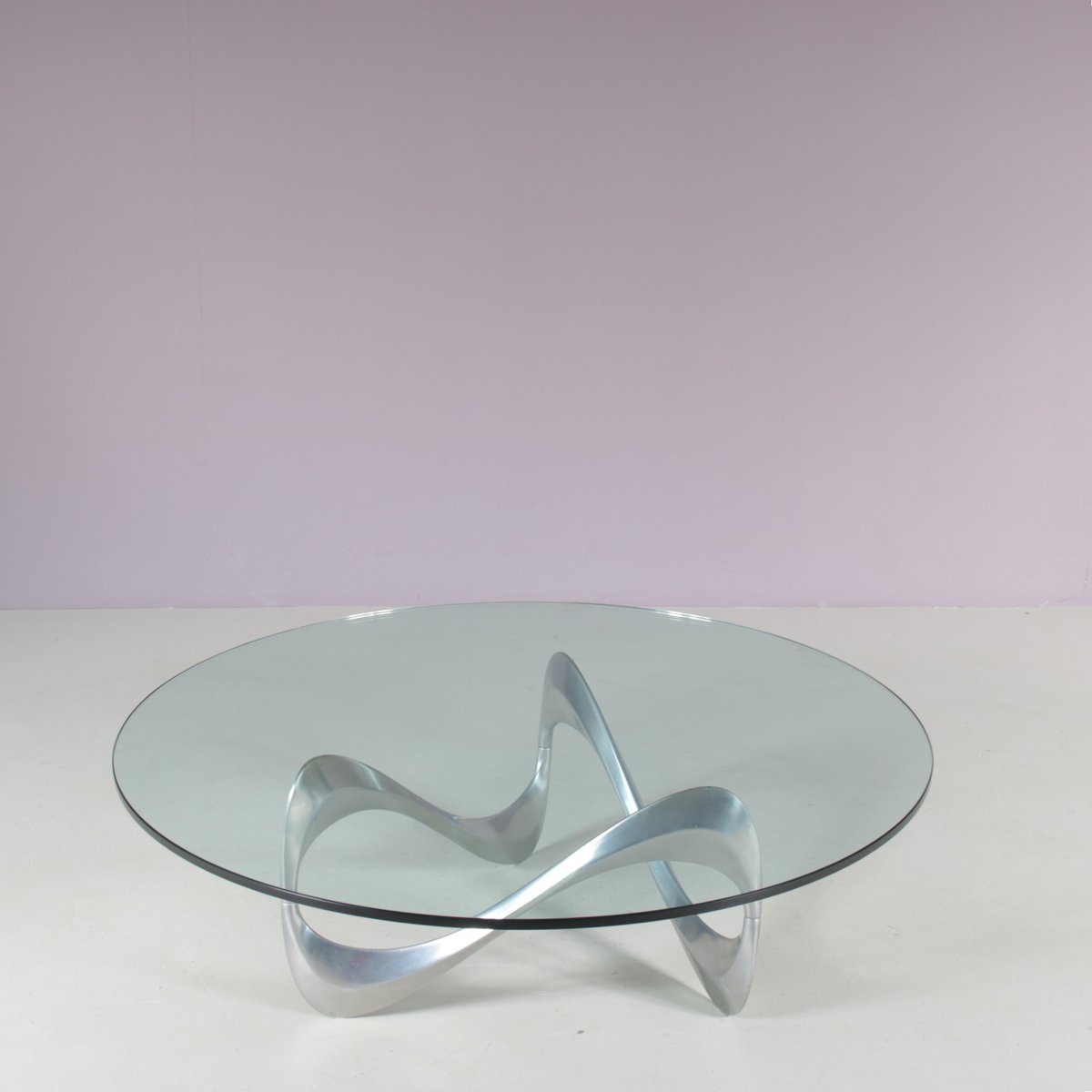 Un iconico tavolino "Snake", disegnato da Knut Hesterberg e prodotto da Ronald Schimdt in Germania intorno al 1970. Questo accattivante tavolino ha una base in metallo cromato, dall'accattivante forma ondulata, a cui deve il suo nome. Il piano rotondo in vetro trasparente enfatizza il design scultoreo della struttura e aggiunge un piacevole senso di lusso al pezzo. Un design molto bello che aggiungerà un bel senso di eleganza agli interni e sarà sicuramente notato da qualsiasi appassionato di design! L'oggetto è in ottime condizioni originali, con lievi segni di usura dovuti all'età e all'uso, e conserva una meravigliosa patina.