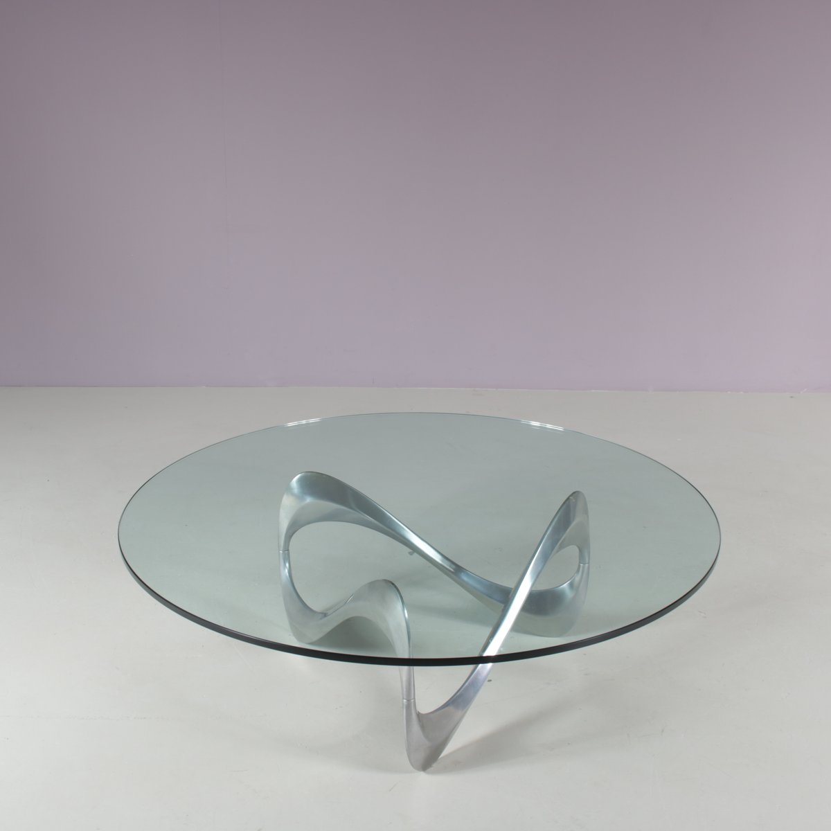 An iconic “Snake” coffee table, designed by Knut Hesterberg and manufactured by Ronald Schimdt in Germany around 1970. This eye-catching table has a chrome plated metal base, in eye-catching waved shape which it owes it’s name to. The round, clear glass top nicely emphasizes the sculptural design of the frame and adds a lovely sense of luxury to the piece. A very nice design that will add a beautiful sense of elegance to the interior and will definitely be noticed by any design enthusiast! It remains in very good original condition, with minor wear consistent with age and use, preserving a wonderful patina.