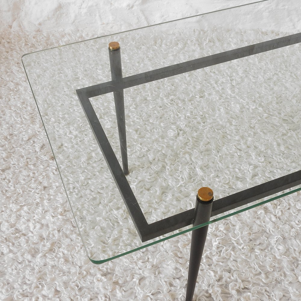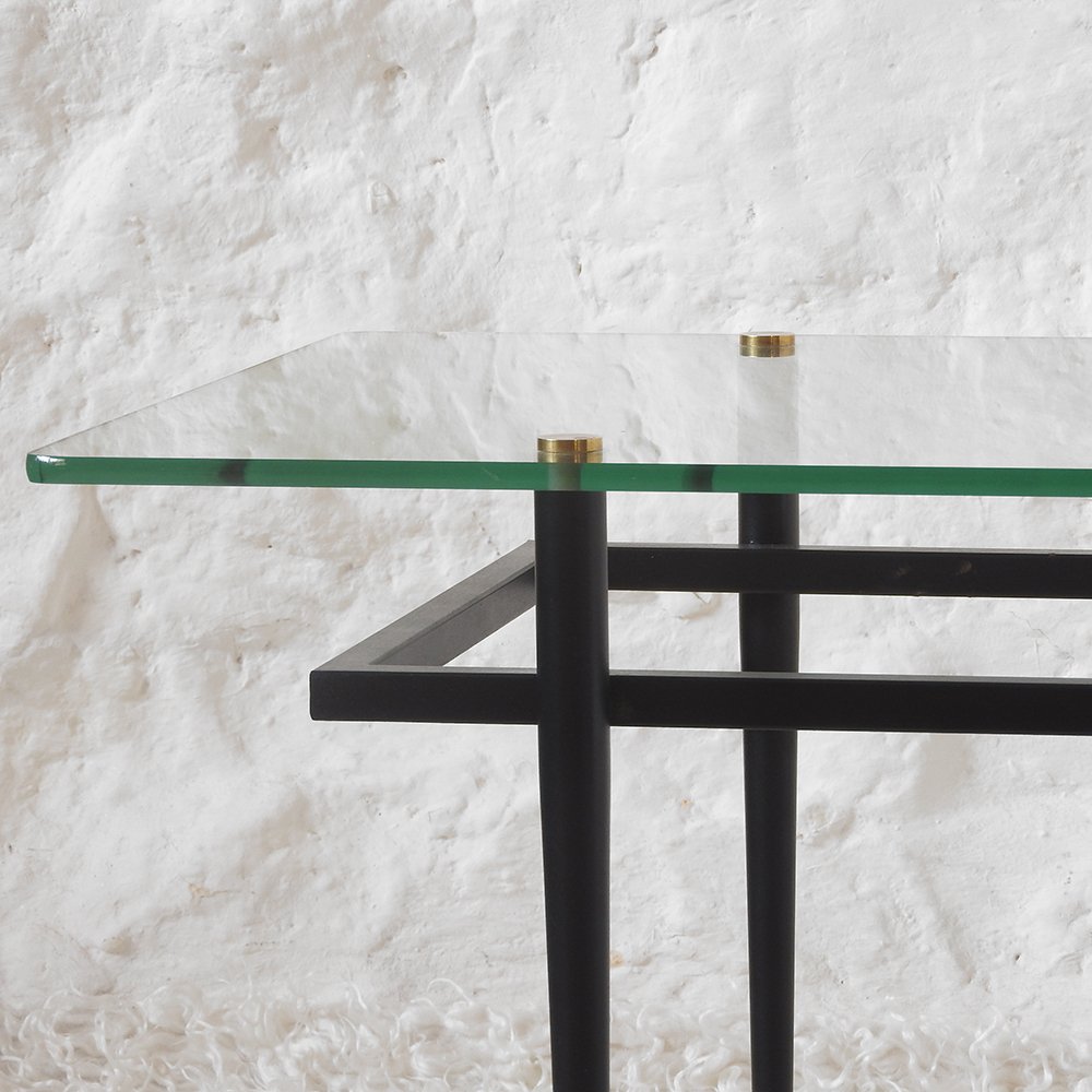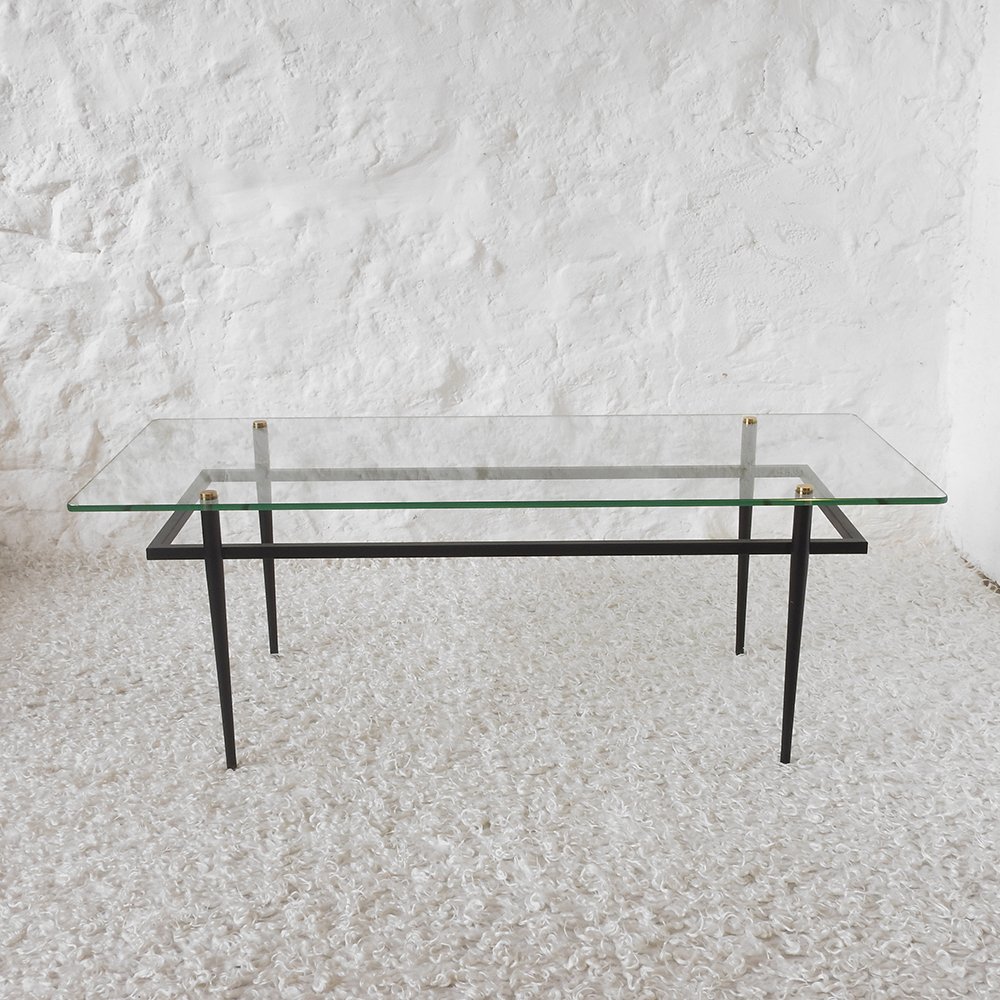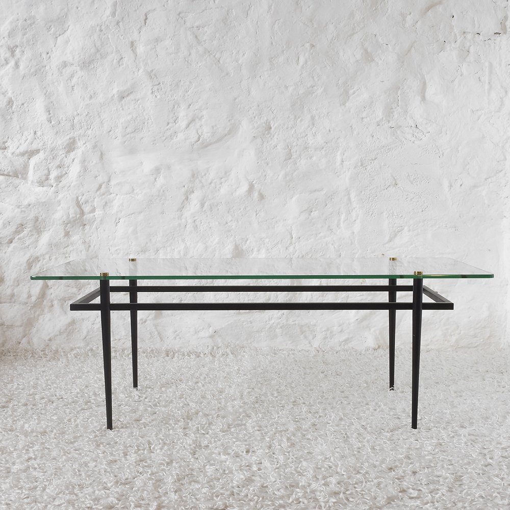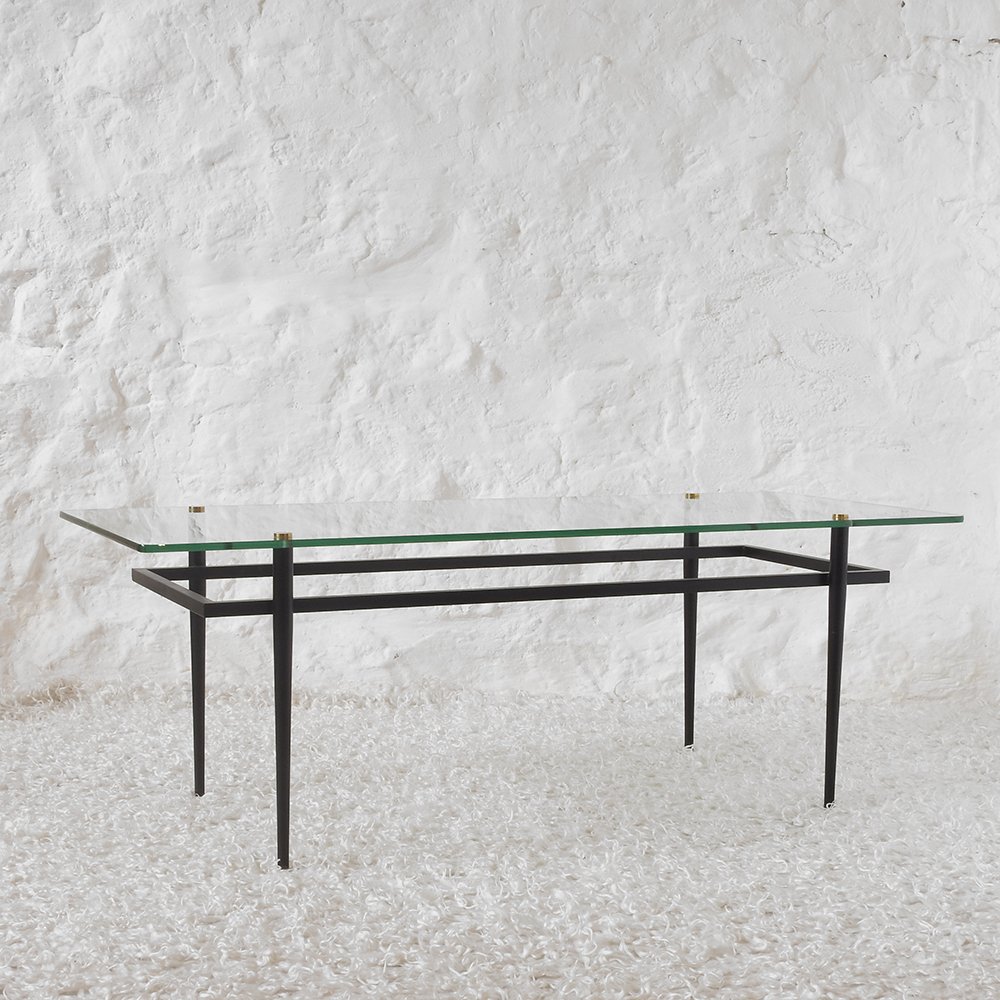 Elegant coffee table. The simplicity of the materials used and the style still look incredibly modern. with its visual lightness, it feels timeless (and functional, of course). Black metal frame, 1 cm thick floating clear glass top with rounded edges and tapered legs, gilt brass details.