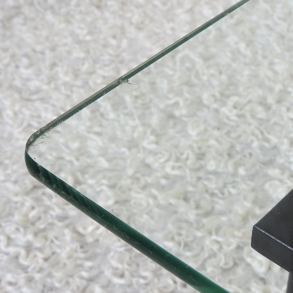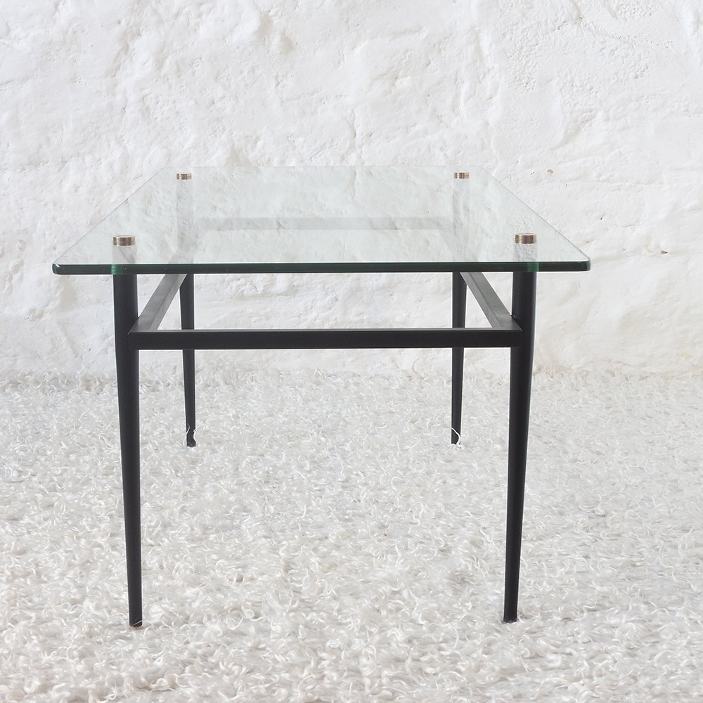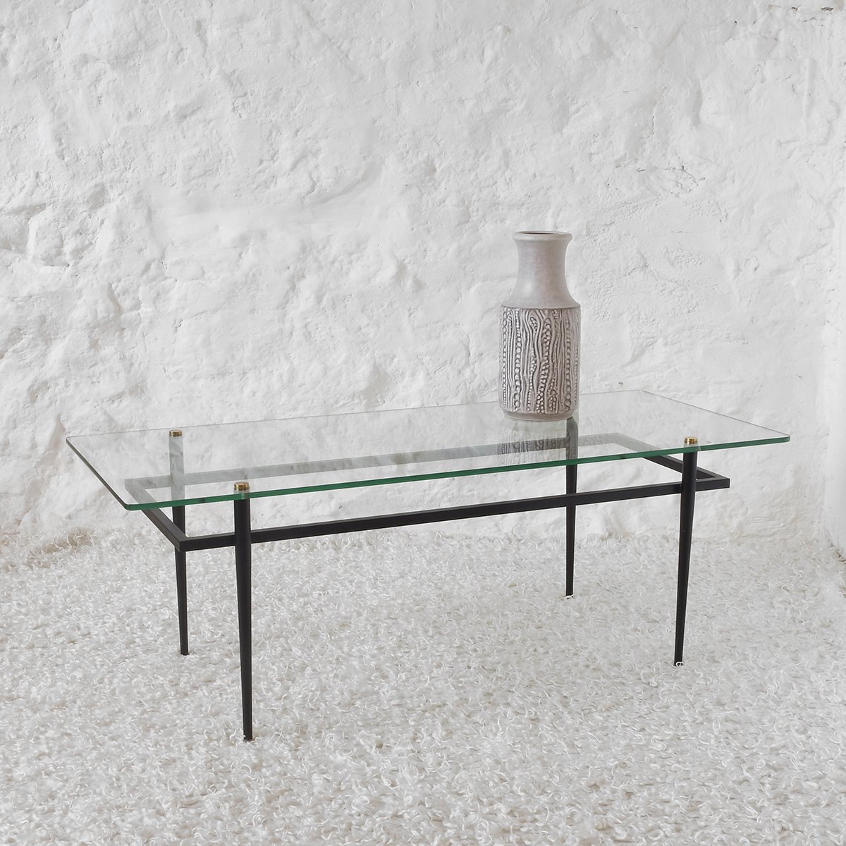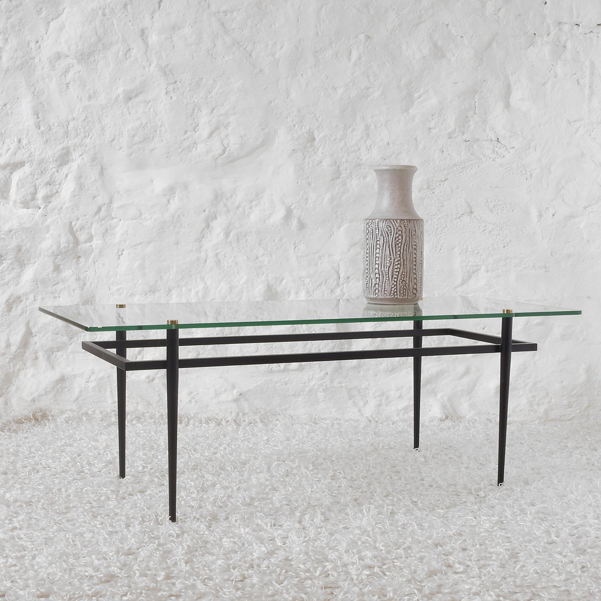 Elegant coffee table. The simplicity of the materials used and the style still look incredibly modern. with its visual lightness, it feels timeless (and functional, of course). Black metal frame, 1 cm thick floating clear glass top with rounded edges and tapered legs, gilt brass details.