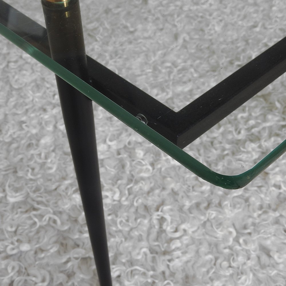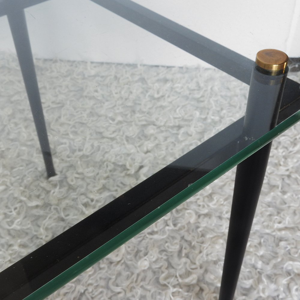 Elegante tavolino da caffè. La semplicità dei materiali utilizzati e lo stile risultano ancora incredibilmente moderni. Con la sua leggerezza visiva, sembra senza tempo (e funzionale, naturalmente). Struttura in metallo nero, piano in vetro trasparente flottante di 1 cm di spessore con bordi arrotondati e gambe affusolate, dettagli in ottone dorato.