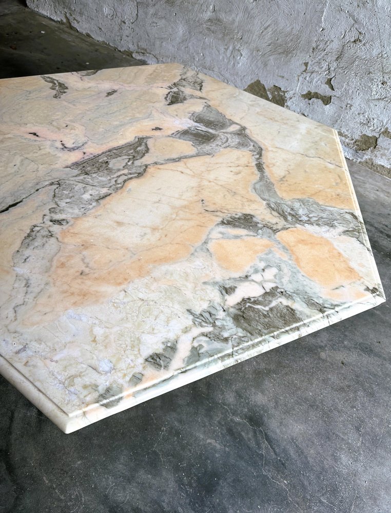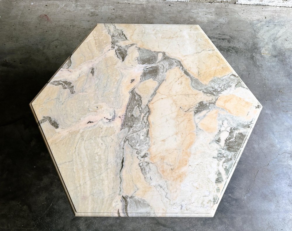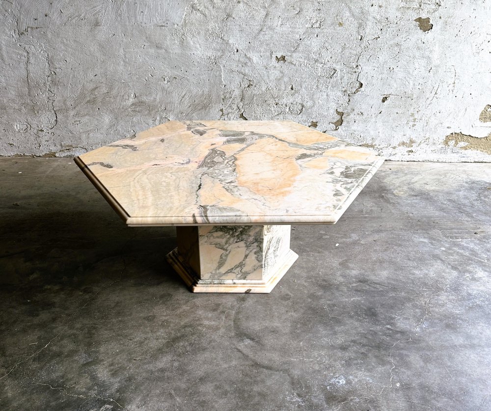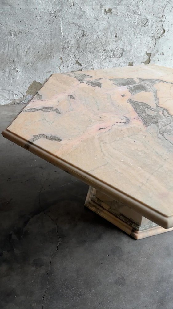 Larghezza: 120 centimetri Altezza: 50 centimetri Profondità: 120 centimetri Tavolino da caffè vintage esagonale in marmo rosa e grigio, Francia anni '80. Tavolino da caffè in marmo rosa di metà secolo. Questo tavolino da caffè vanta stabilità e durata, assicurando che rimanga un centrotavola senza tempo nella vostra casa per gli anni a venire. Le tonalità ricche e uniche del marmo, tra cui avorio, rosa, salmone, grigio e bianco, creano un'accattivante miscela di colori che aggiunge un tocco di raffinatezza ineguagliabile a qualsiasi ambiente. Questa fusione armoniosa non solo valorizza la zona pranzo, ma le conferisce anche un'aria di opulenza e raffinatezza.