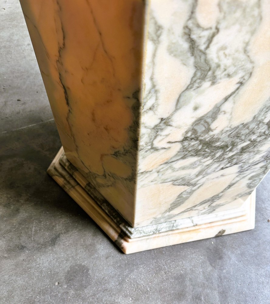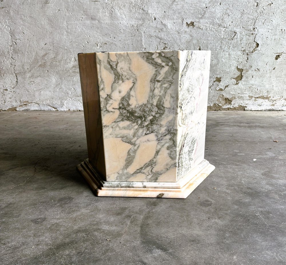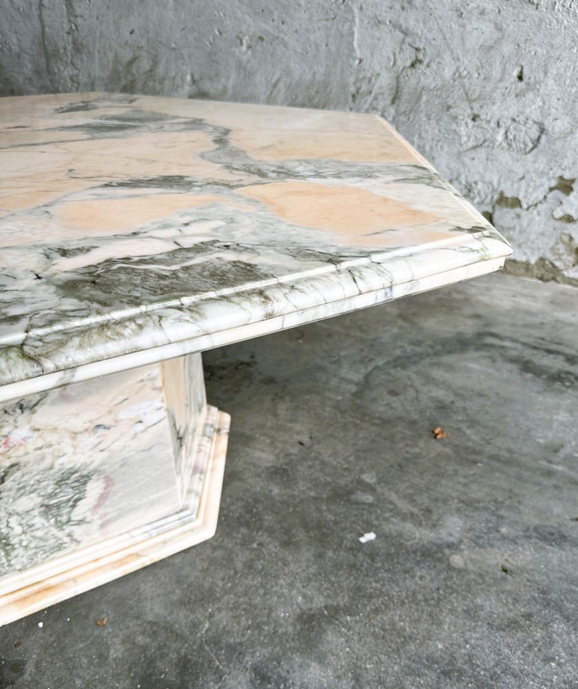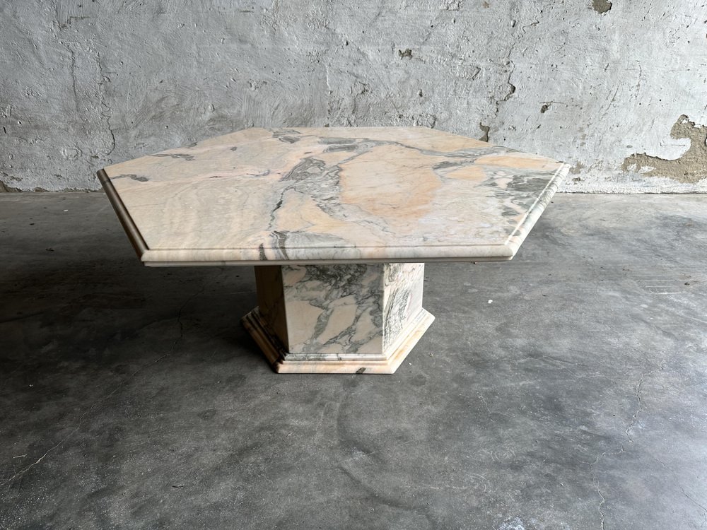 Larghezza: 120 centimetri Altezza: 50 centimetri Profondità: 120 centimetri Tavolino da caffè vintage esagonale in marmo rosa e grigio, Francia anni '80. Tavolino da caffè in marmo rosa di metà secolo. Questo tavolino da caffè vanta stabilità e durata, assicurando che rimanga un centrotavola senza tempo nella vostra casa per gli anni a venire. Le tonalità ricche e uniche del marmo, tra cui avorio, rosa, salmone, grigio e bianco, creano un'accattivante miscela di colori che aggiunge un tocco di raffinatezza ineguagliabile a qualsiasi ambiente. Questa fusione armoniosa non solo valorizza la zona pranzo, ma le conferisce anche un'aria di opulenza e raffinatezza.
