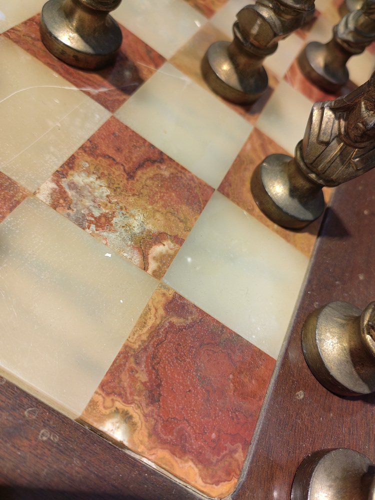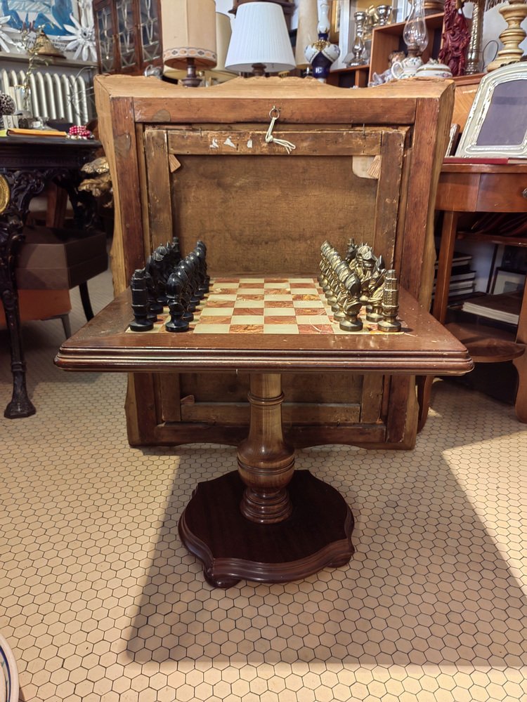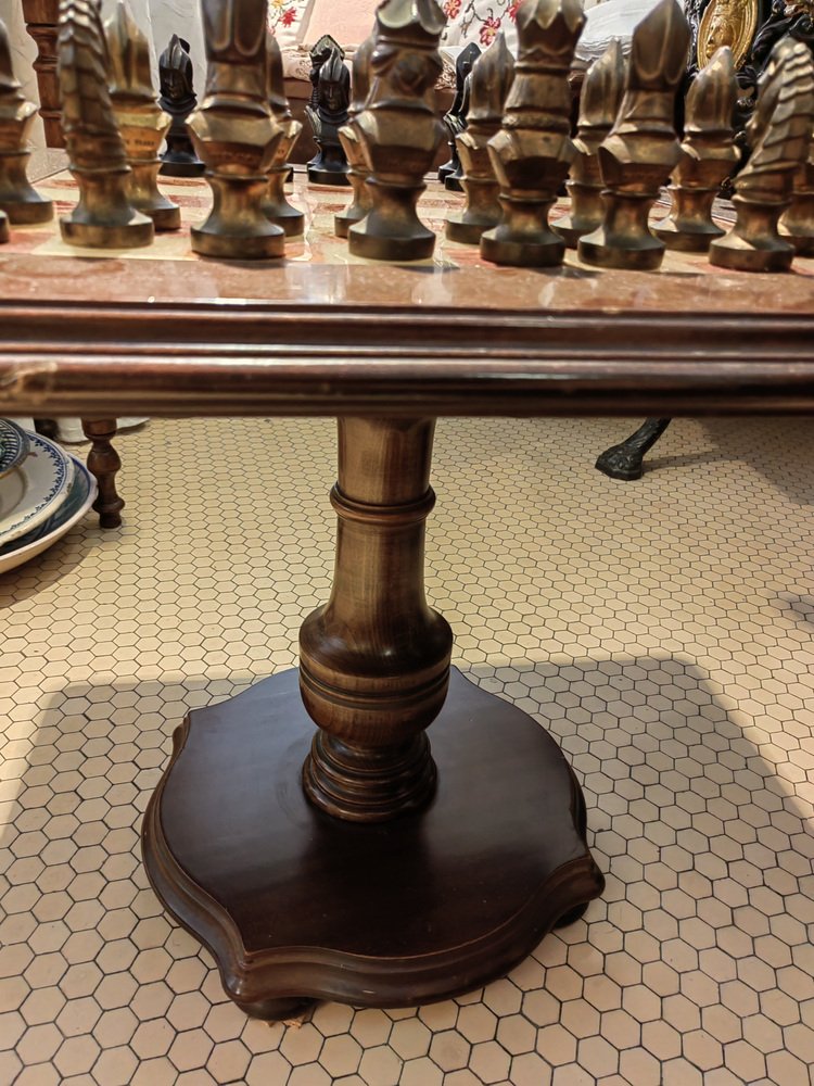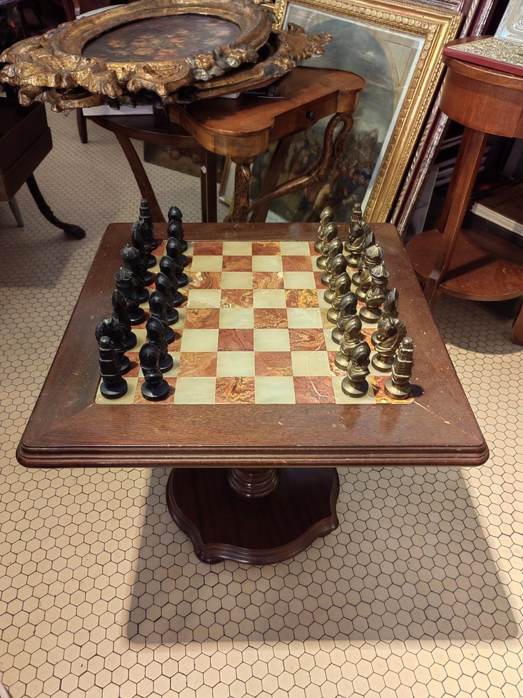 Tavolino in palissandro con ripiano in marmo e scacchi in ottone e bronzo, anni '30