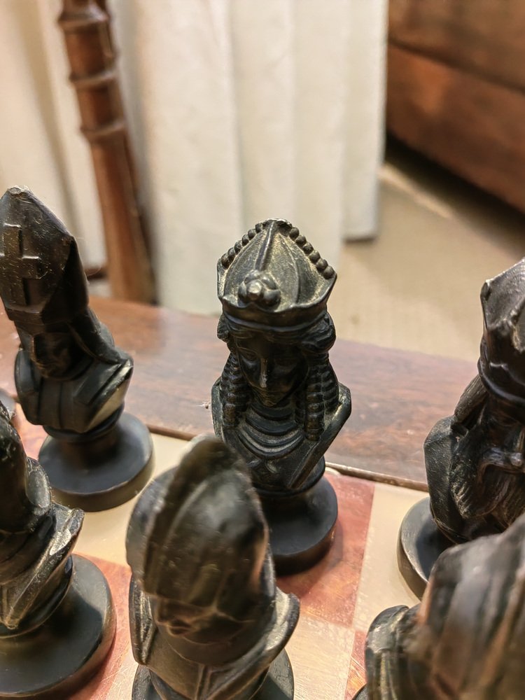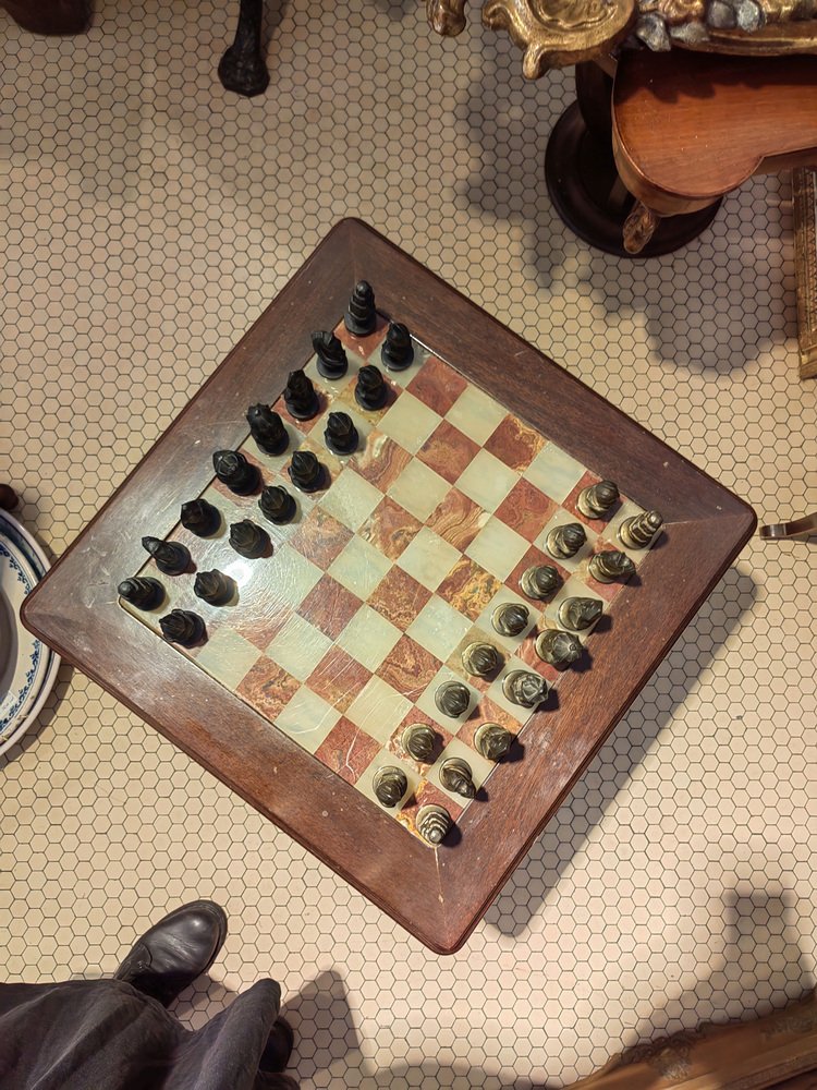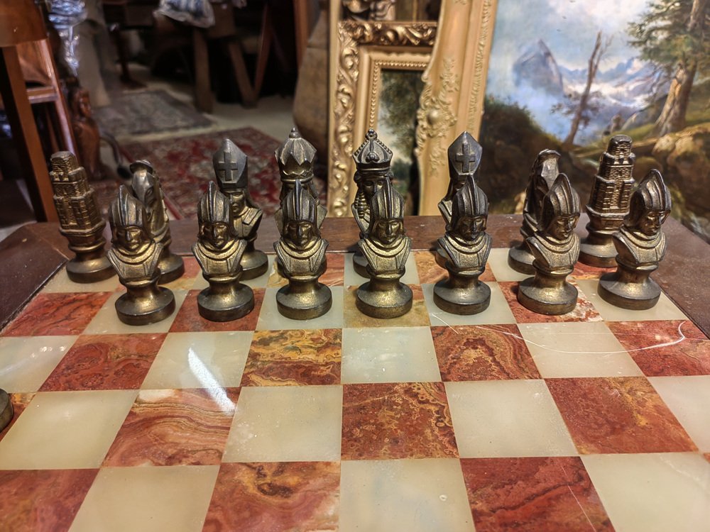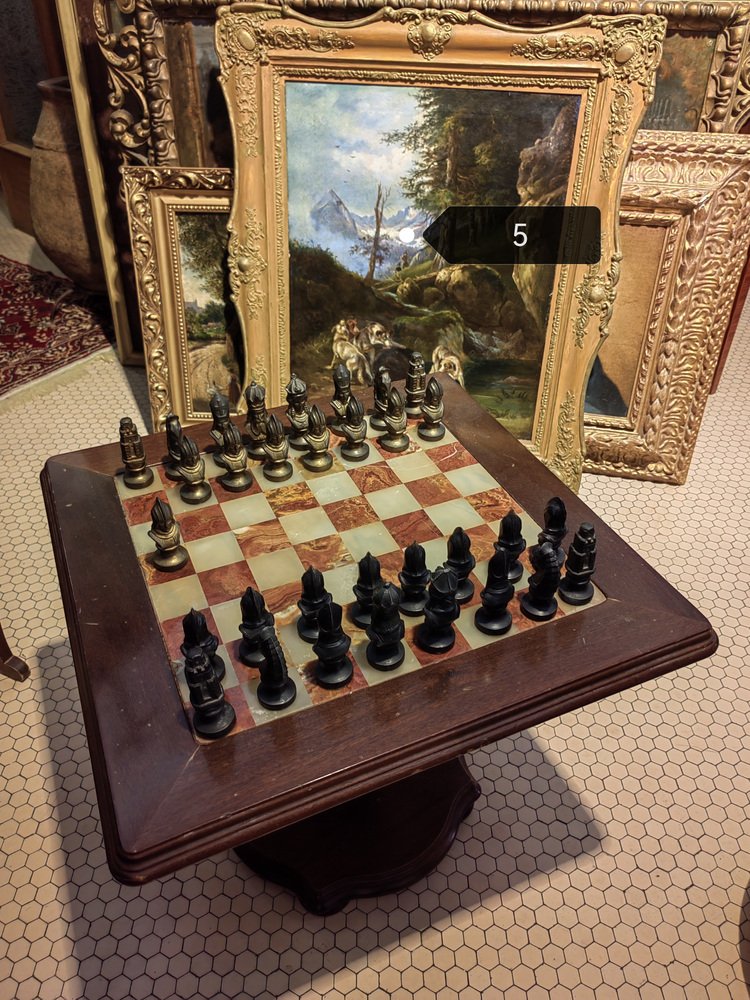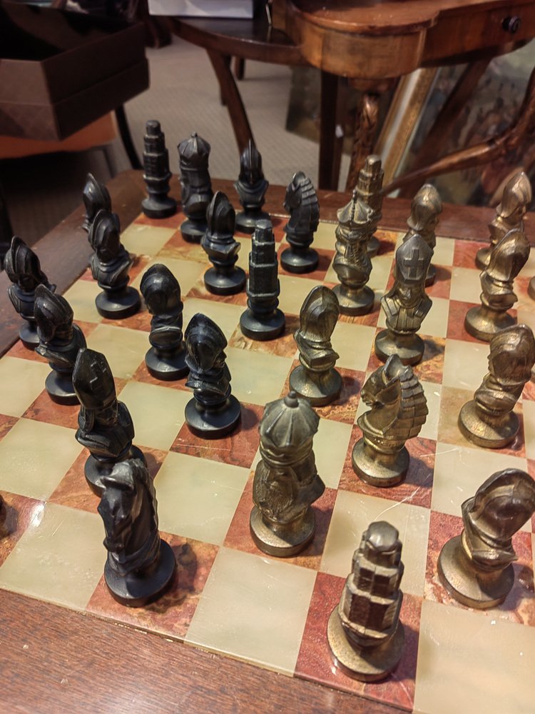 Tavolino in palissandro con ripiano in marmo e scacchi in ottone e bronzo, anni '30