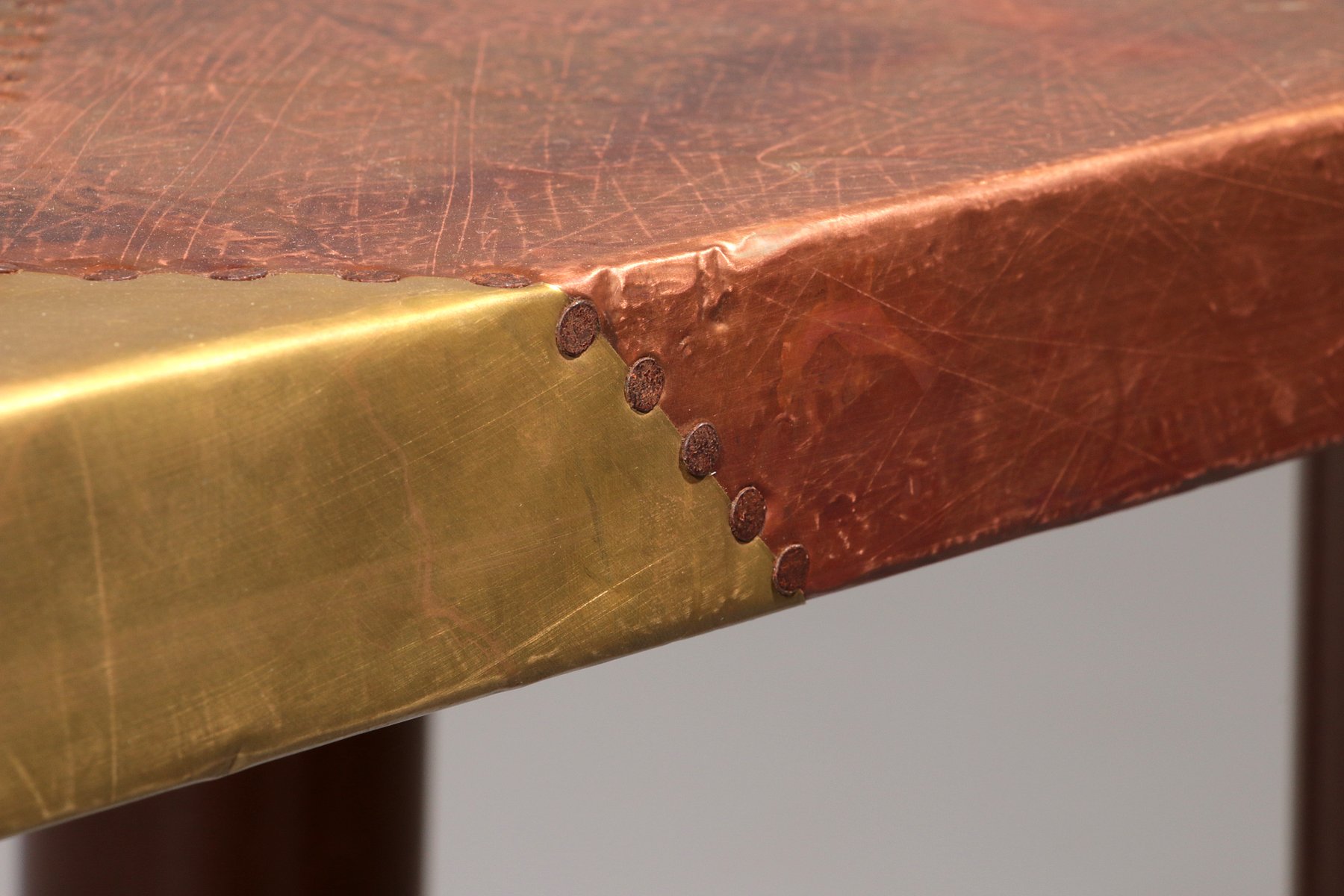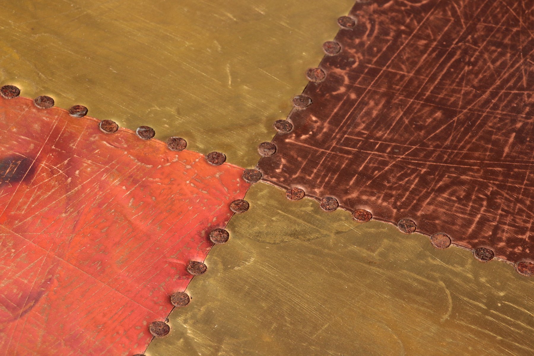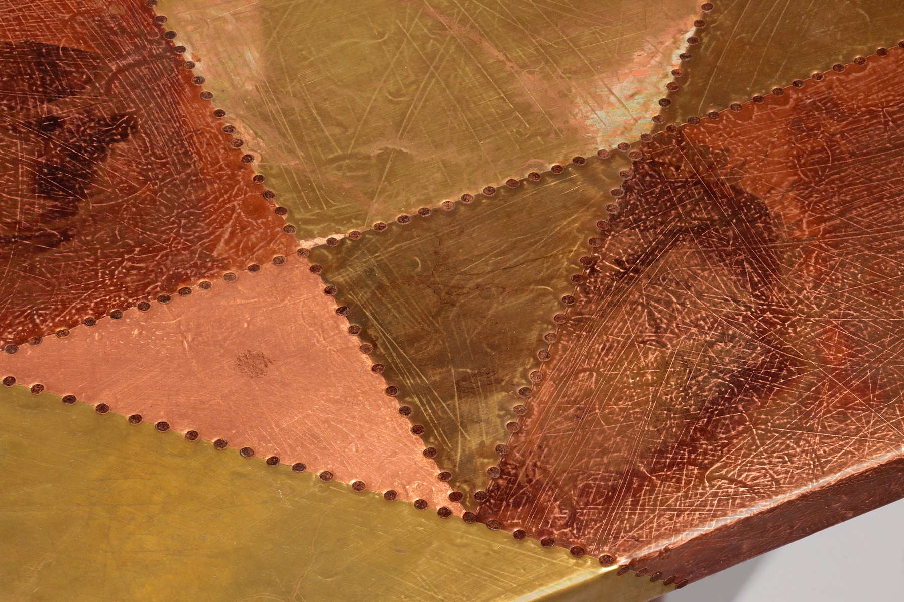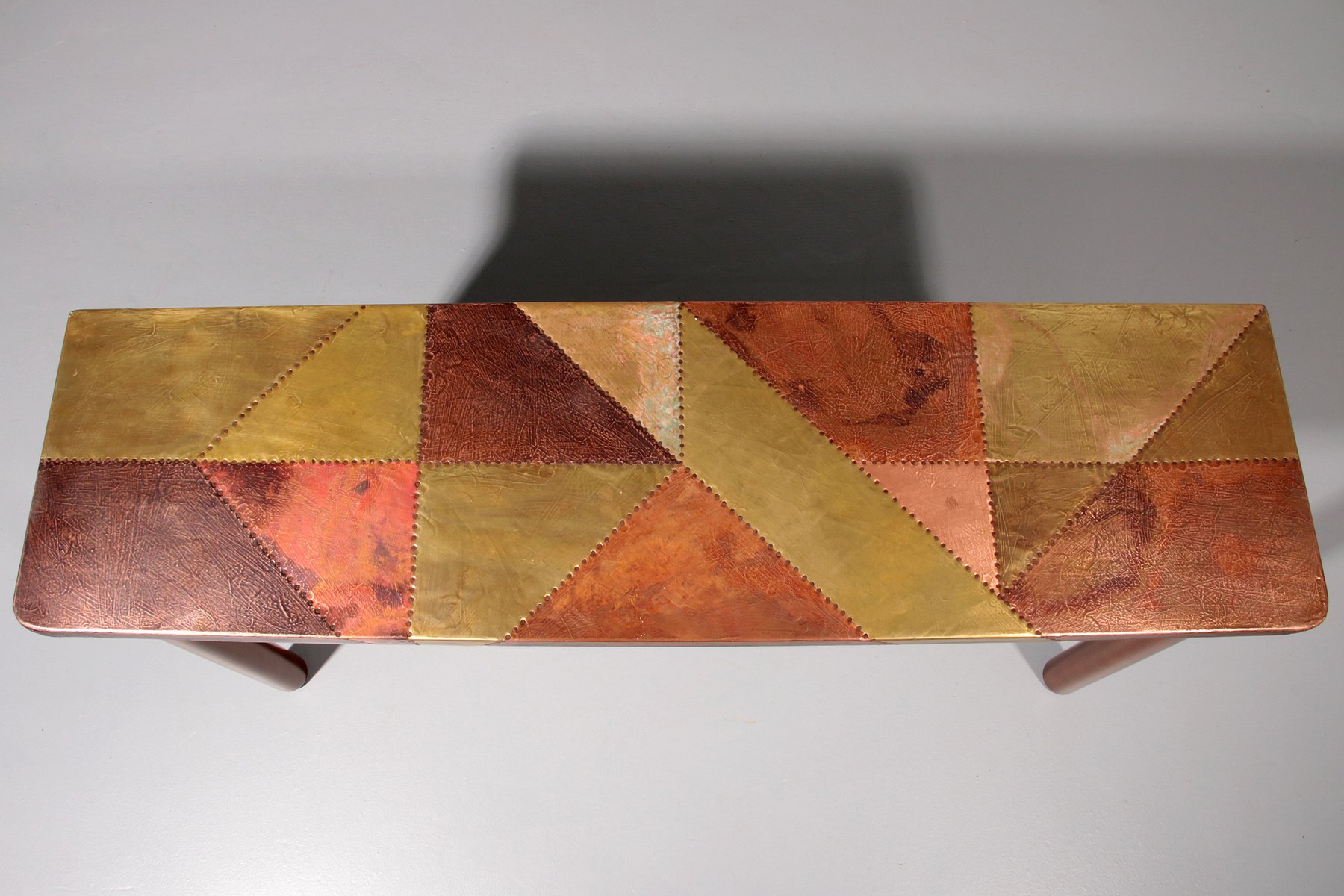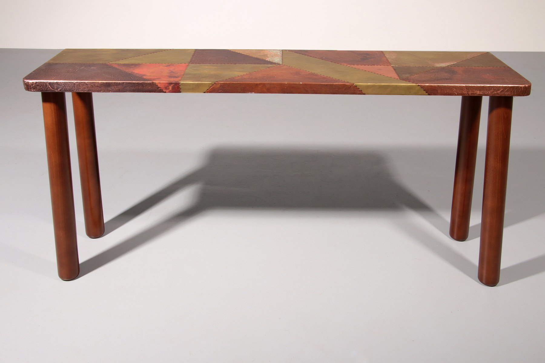 This table is an absolute eye-catcher. The copper is in a beautiful, patinated condition, and the vibrant yet natural oxidation and bronze color are truly breathtaking. Lorenzo Burchiellaro (born 1933) is an Italian designer and sculptor. He is known for his artistic use of metals and the creation of decorative objects and furniture. His preferred materials are often metals, gold, silver, aluminum, zinc, and in this case, copper. Burchiellaro's sculptural skills are clearly evident in this table, which could easily be considered a work of art. This side table is no exception. with its rectangular top resting on round legs, the table is not only unique in its composition, but also the way Burchiellaro arranges straight-cut copper pieces on the top, creating a striking patchwork effect with vibrant color gradations. The stamp lines are also visible, emphasizing the table's artisanal qualities.