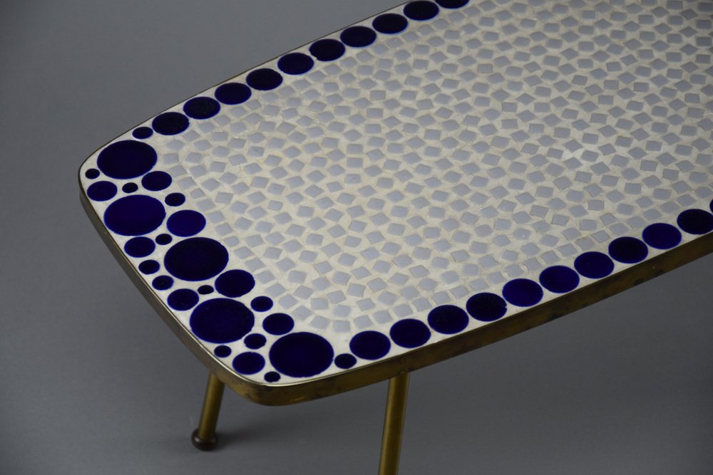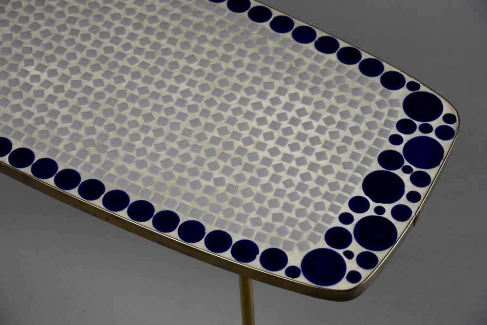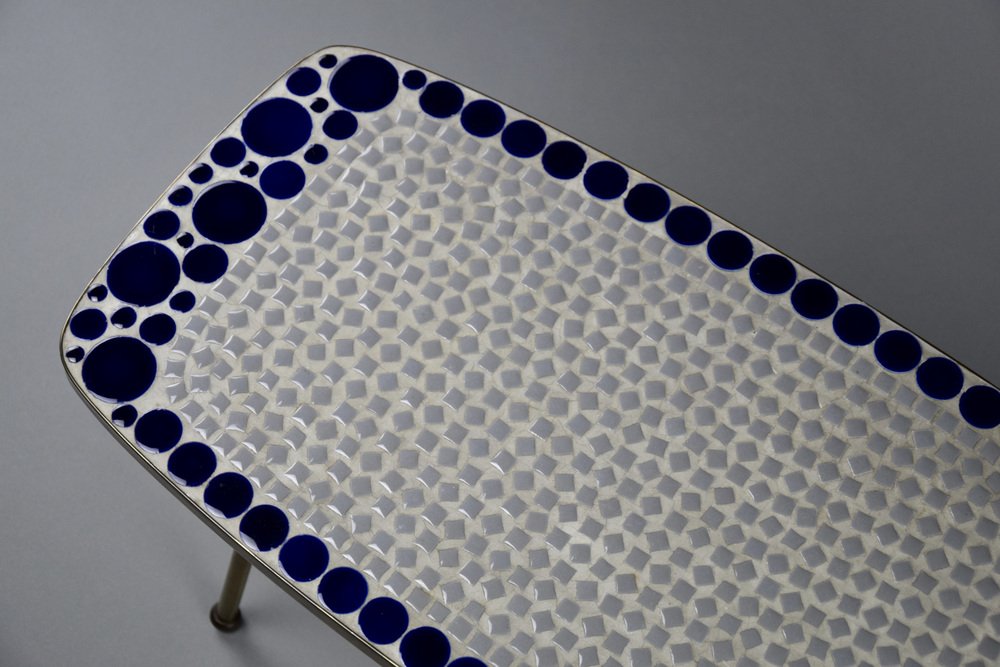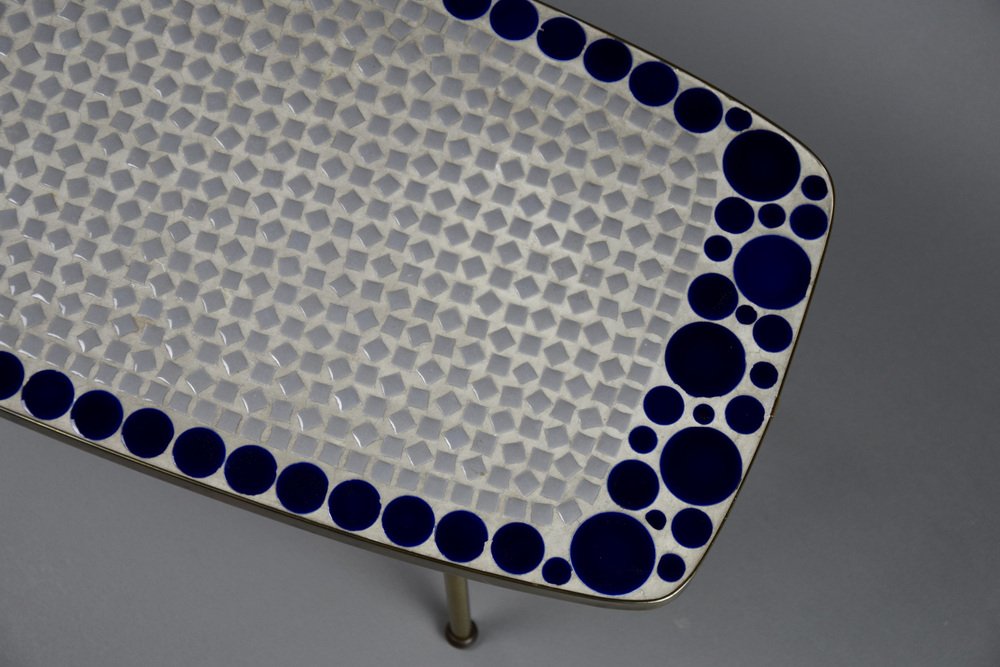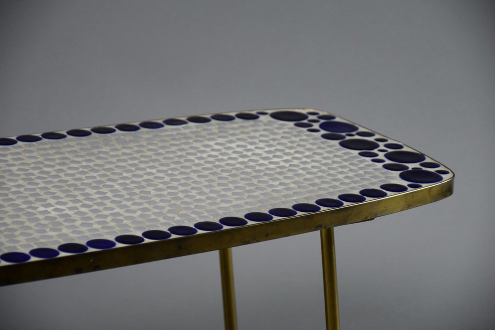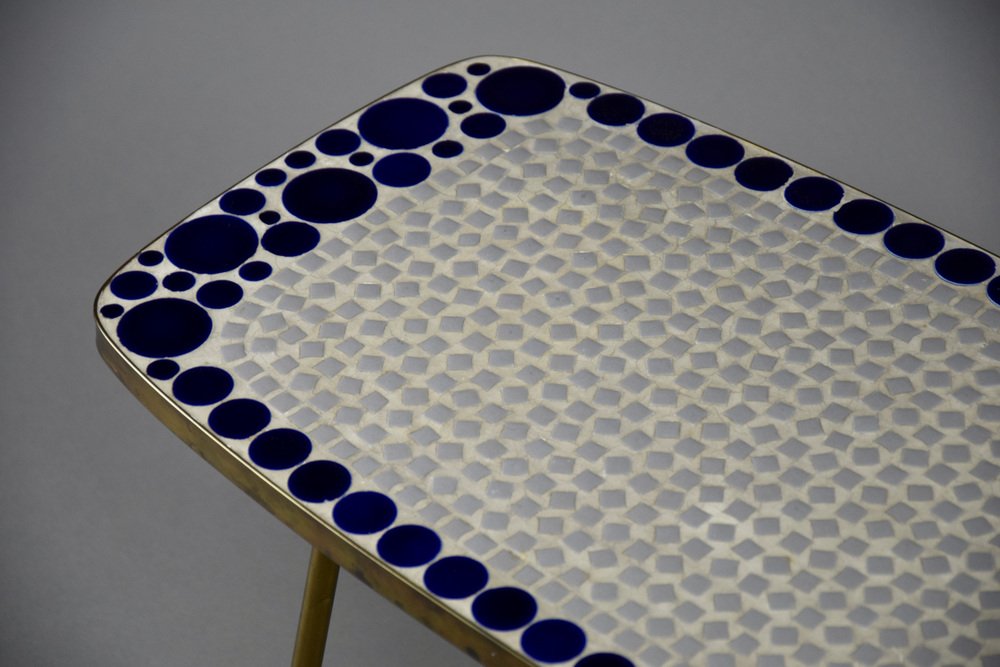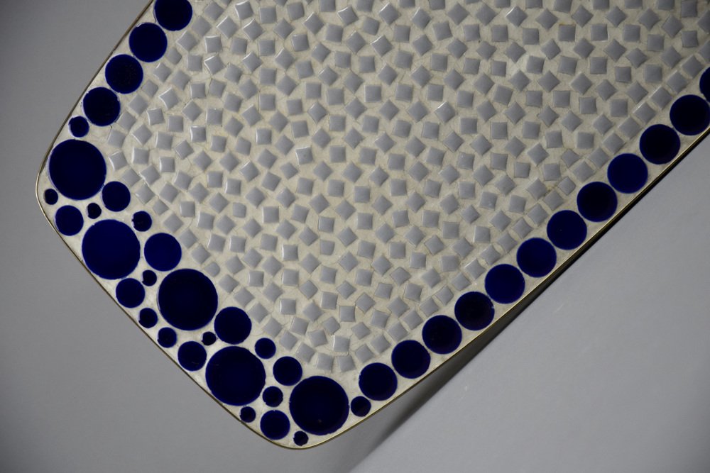 The centerpiece of this remarkable side table is its oval top, meticulously adorned with square light grey glass mosaics, expertly laid in place. Adding an enchanting touch are the striking dark blue round inlays in varying sizes, creating a harmonious fusion of colors and textures that will undoubtedly elevate any space.