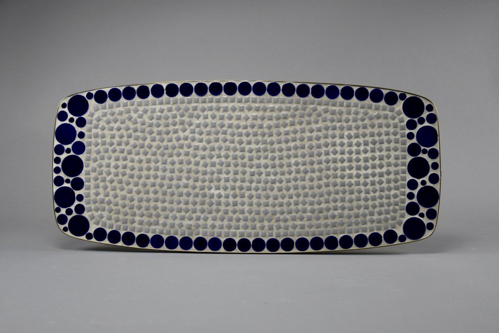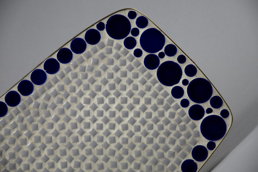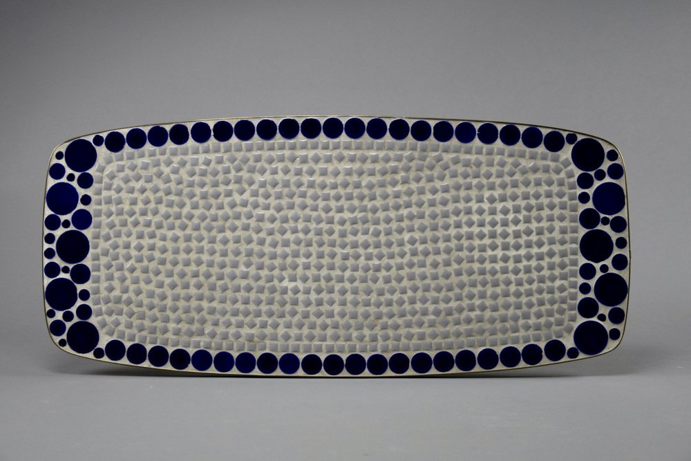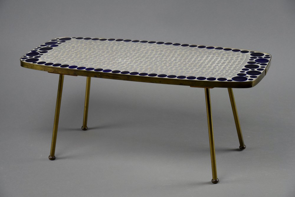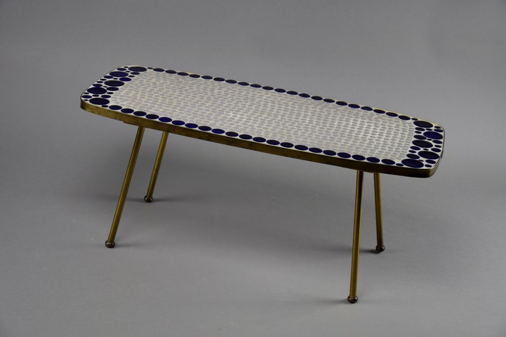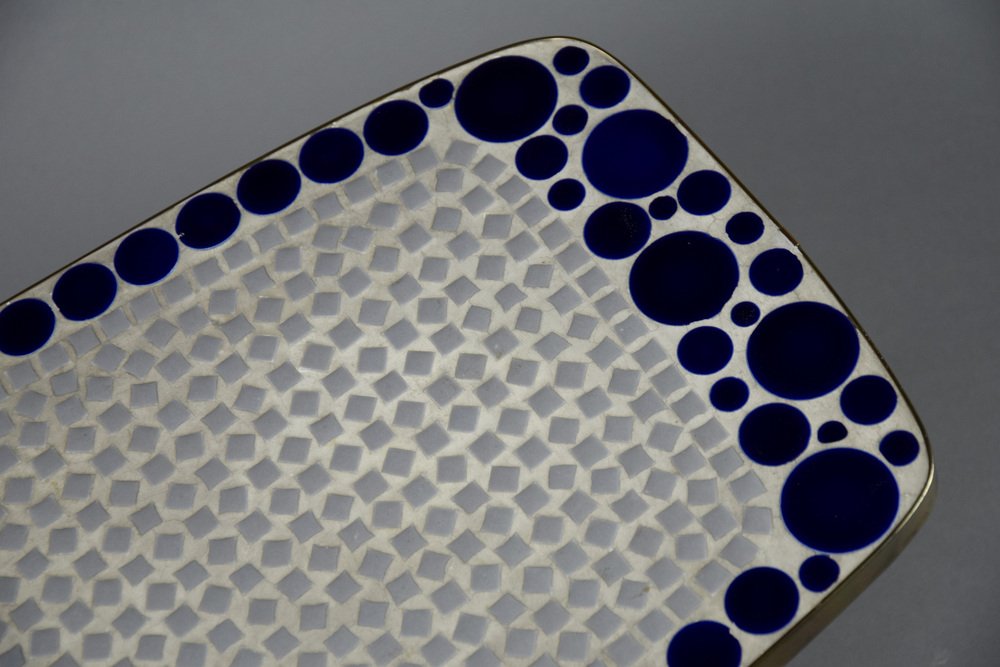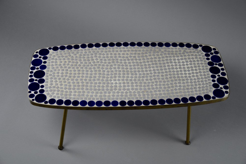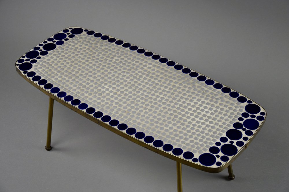 The centerpiece of this remarkable side table is its oval top, meticulously adorned with square light grey glass mosaics, expertly laid in place. Adding an enchanting touch are the striking dark blue round inlays in varying sizes, creating a harmonious fusion of colors and textures that will undoubtedly elevate any space.