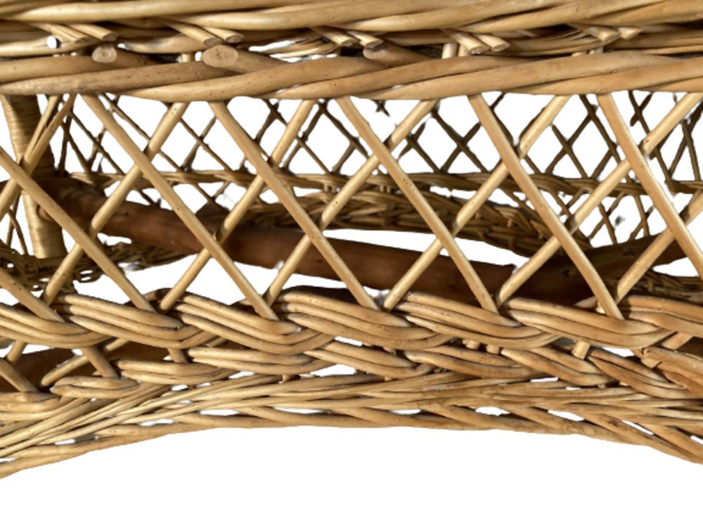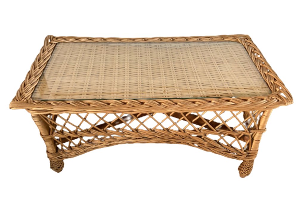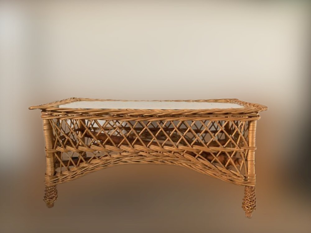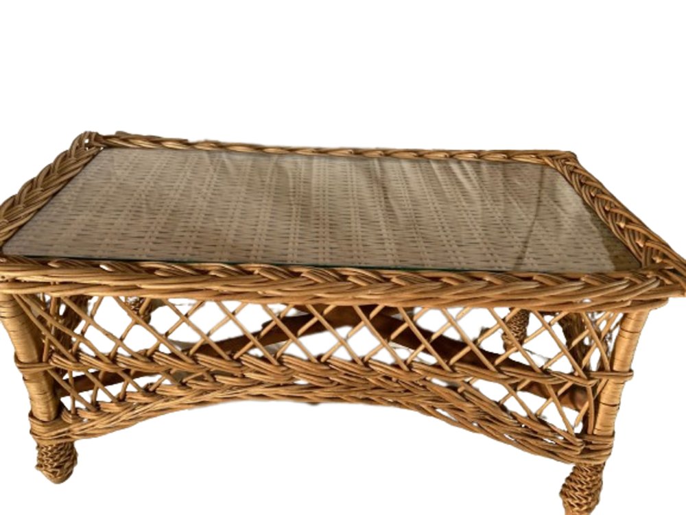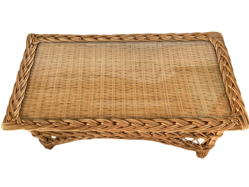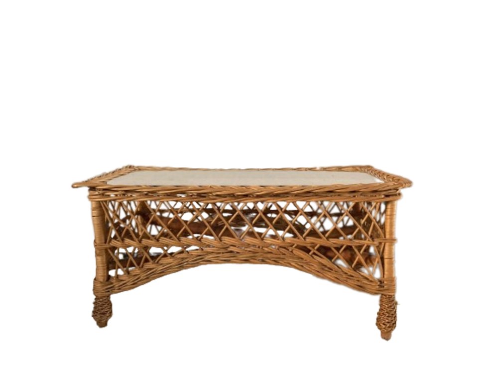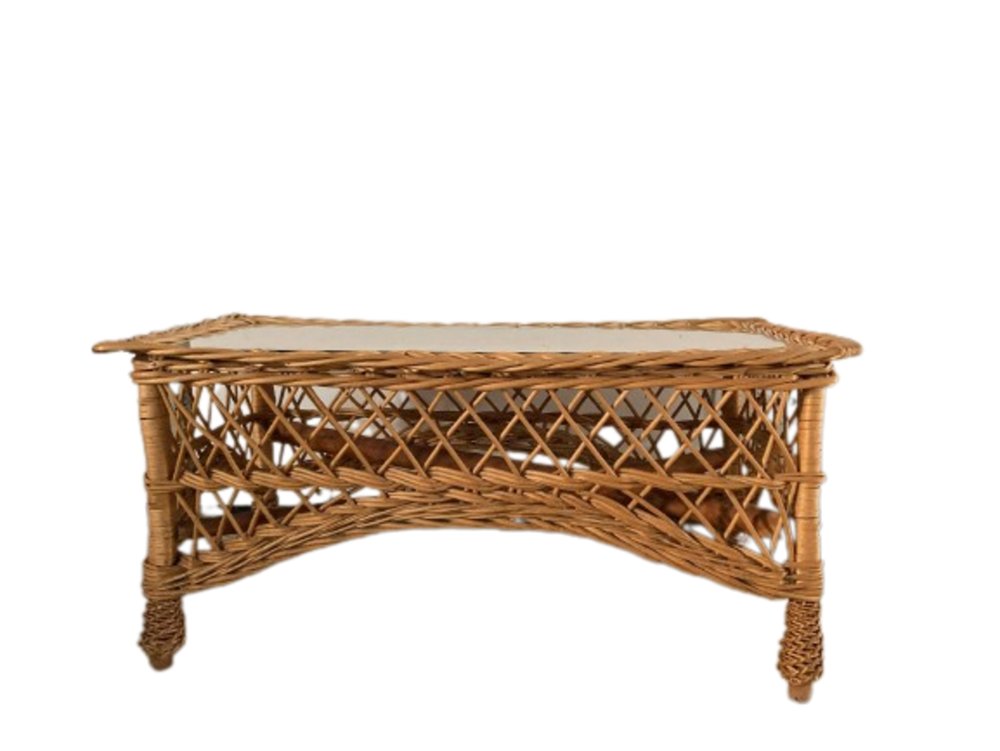 Tavolino Mid-Century rettangolare in bambù e vimini con ripiano in vetro, Italia, anni '70